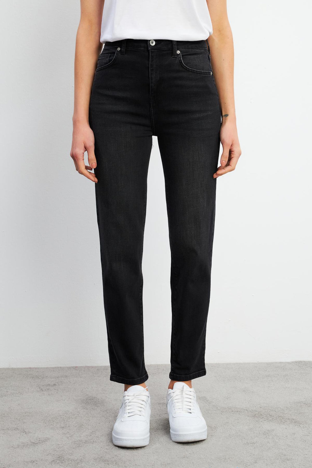 Slim mom jean, belden daralırken kalça ve bacaklarda rahat bir kesim sağlar.