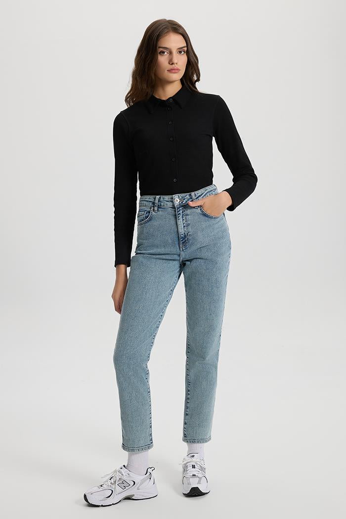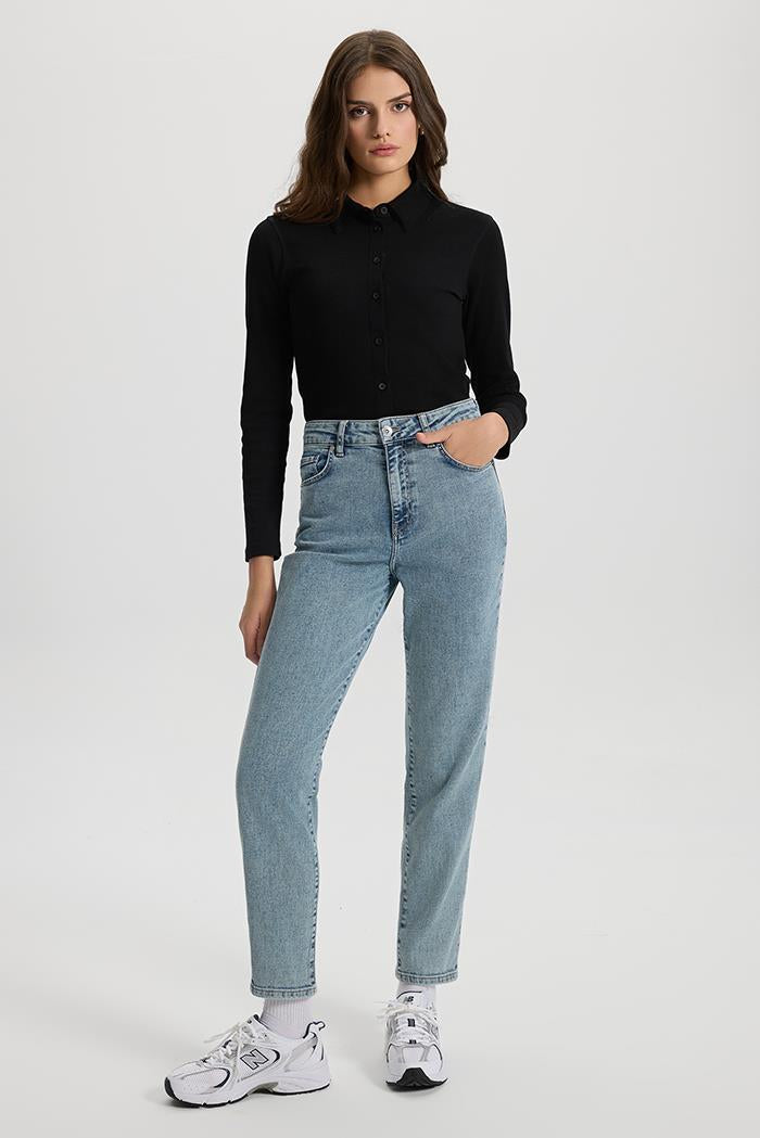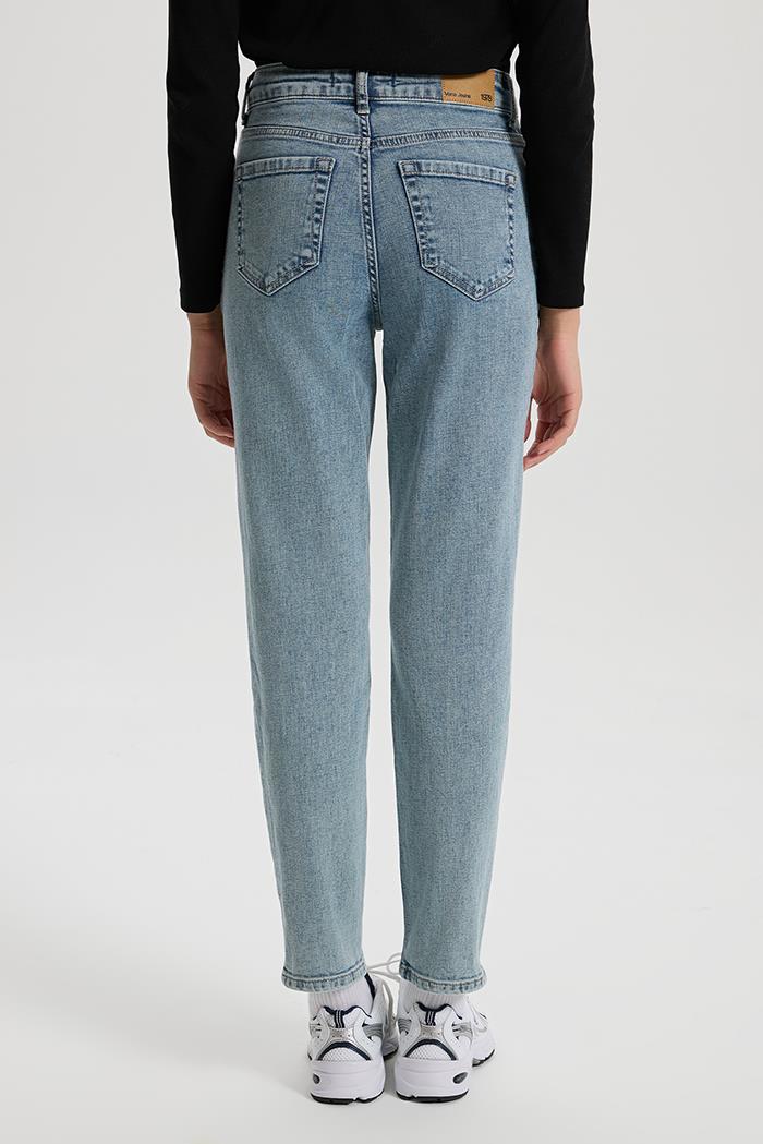 Slim mom kesimdir; yüksek bel ve bacakta hafif dar bir kesim sunar.