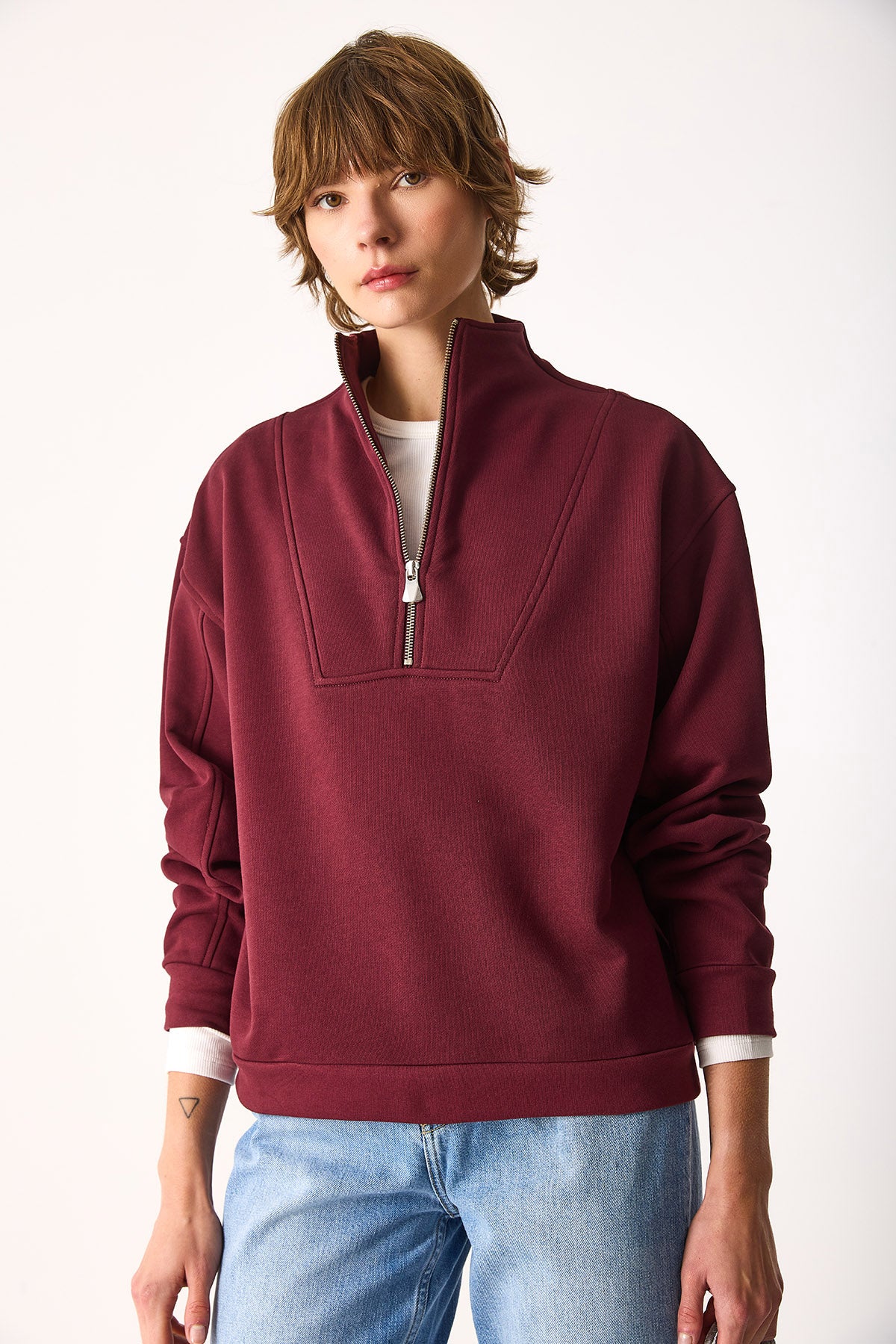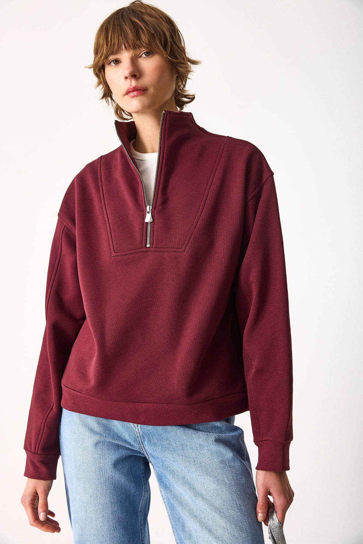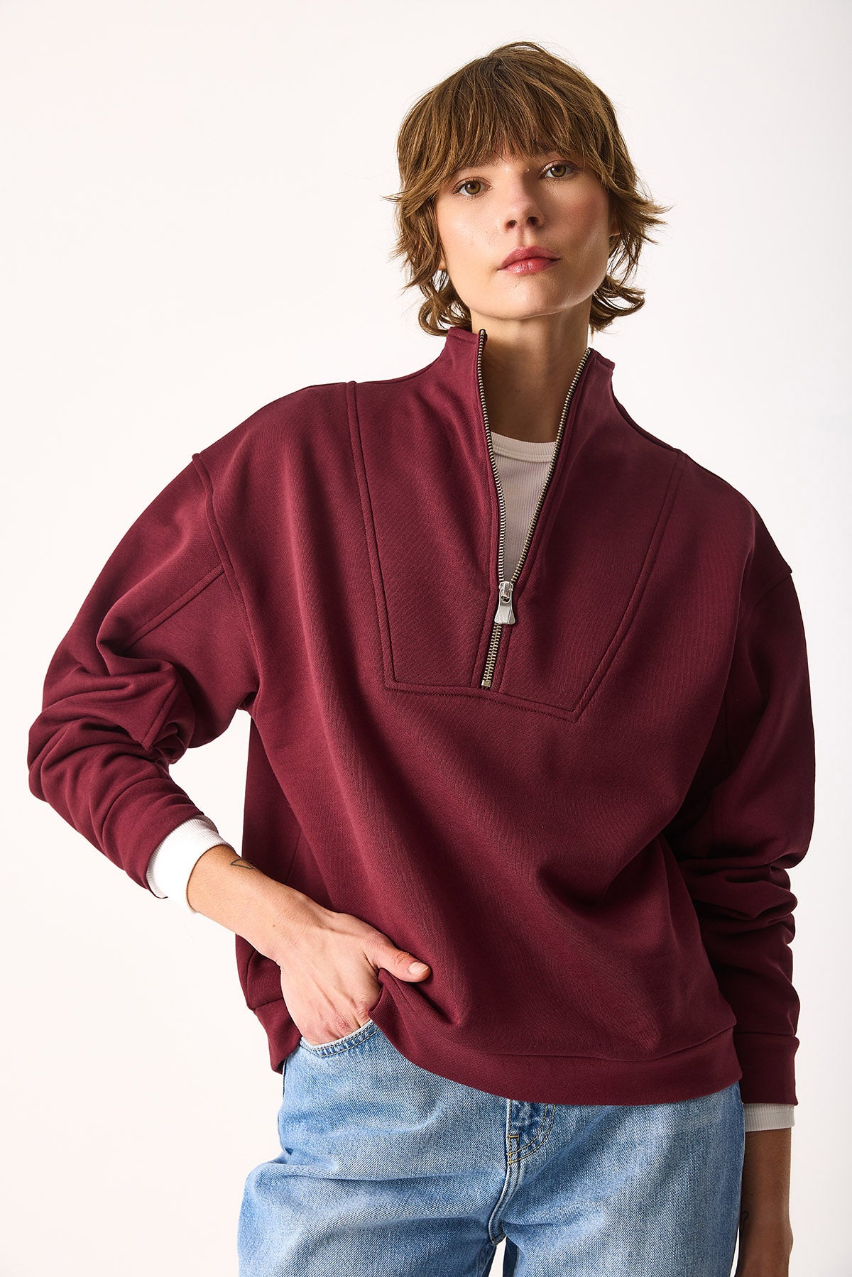 Kadın Marina Yarım Fermuarlı Sweatshirt %100 Pamuk - Bordo