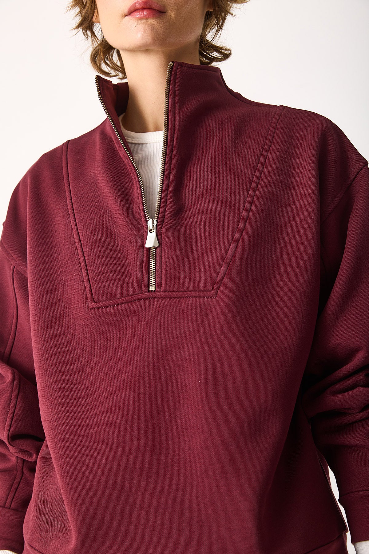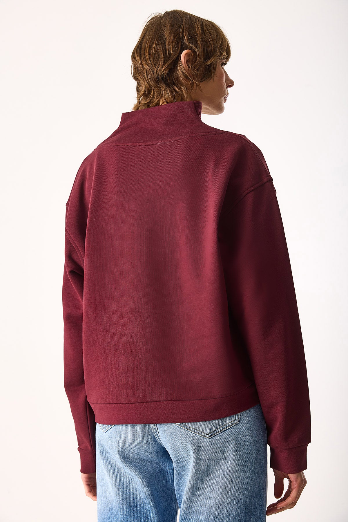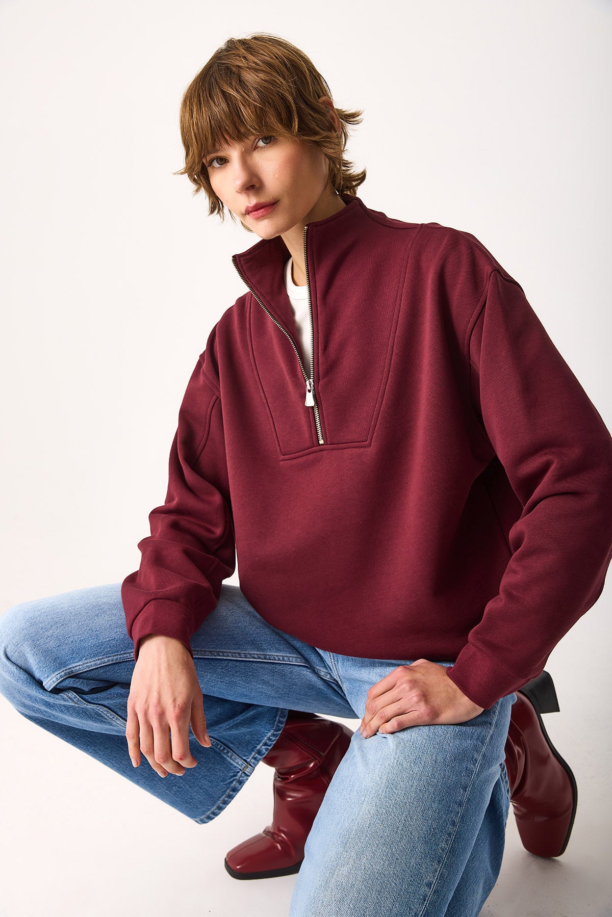 Kadın Marina Yarım Fermuarlı Sweatshirt %100 Pamuk - Bordo
