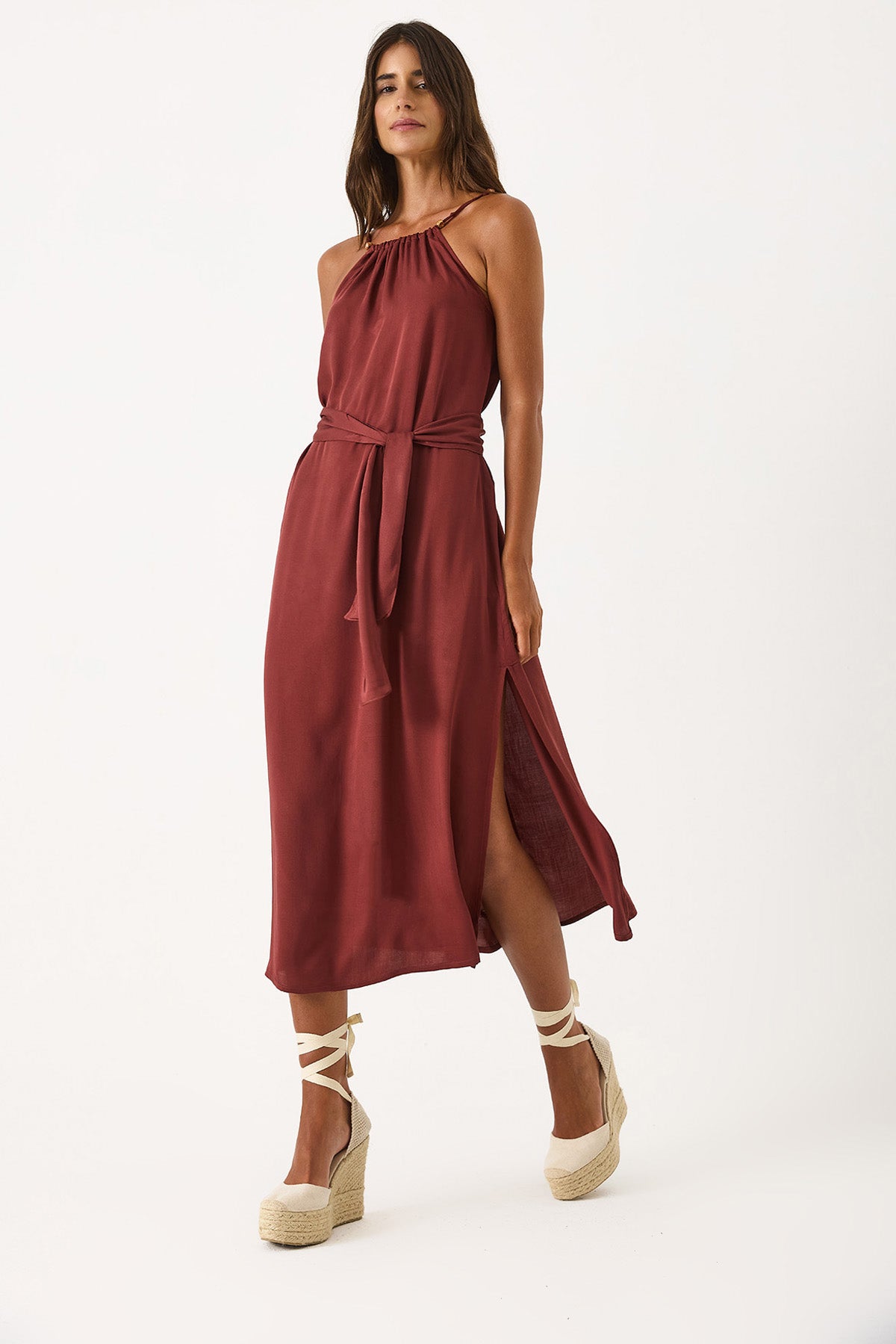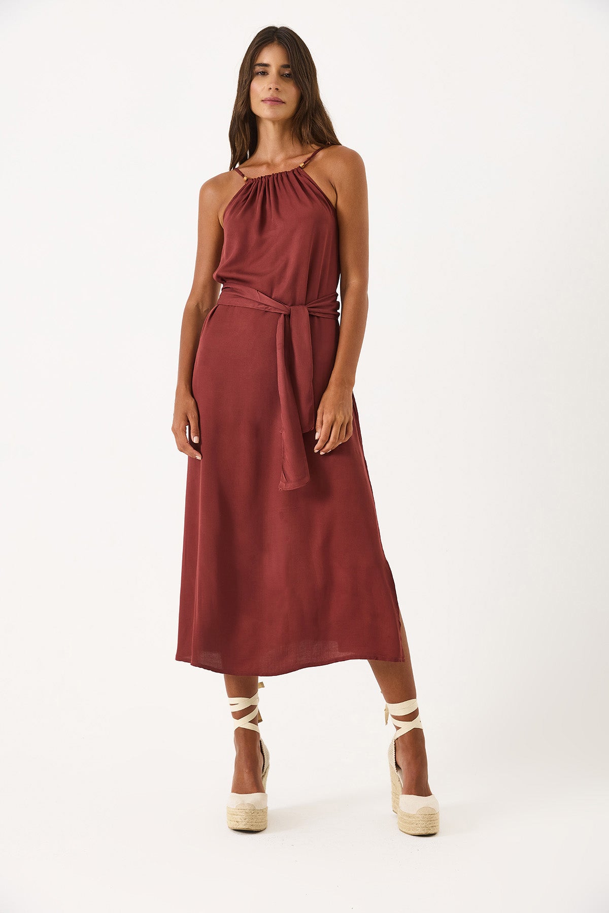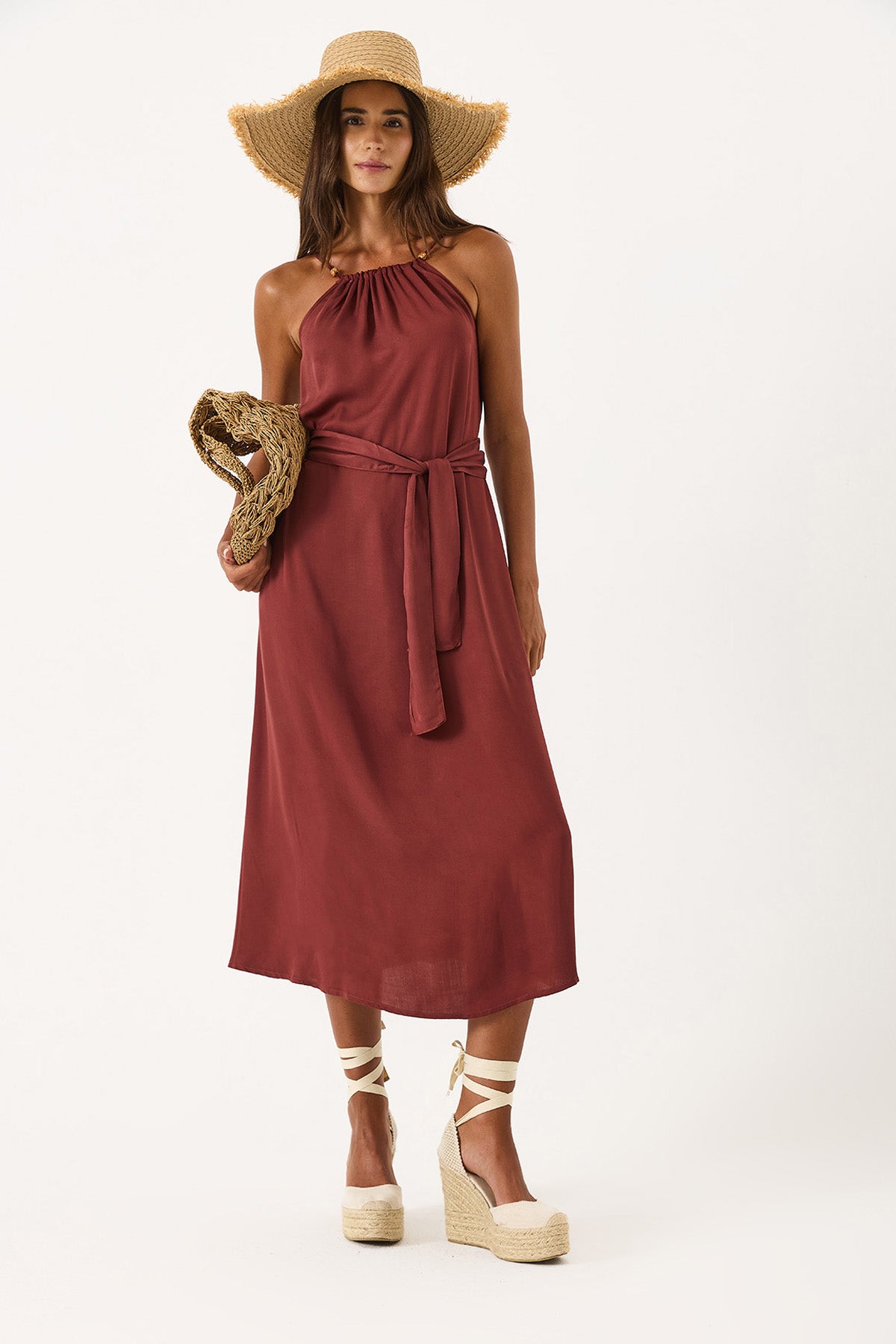 Kadın Marmaris Boncuk Askılı Saten Elbise %100 Viskon - Bordo