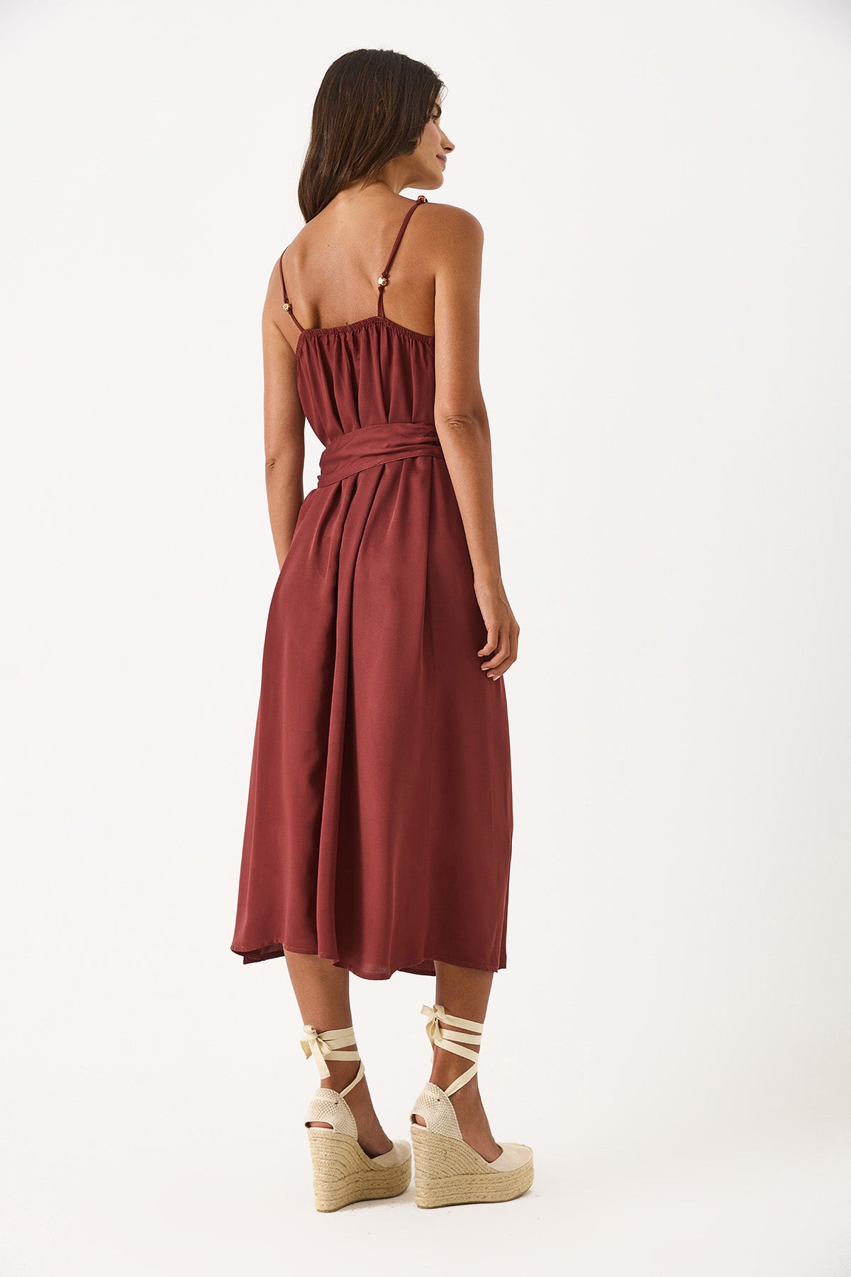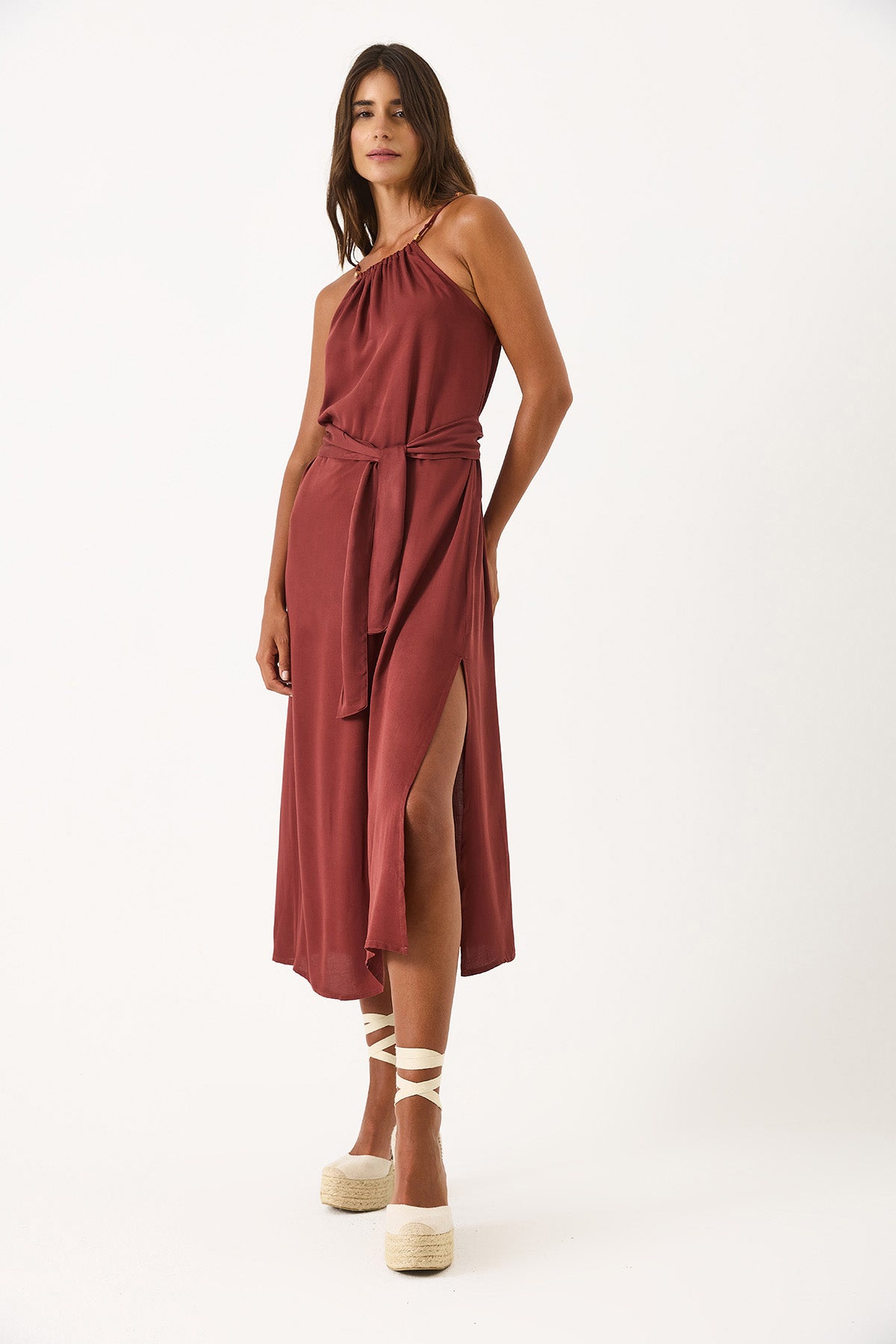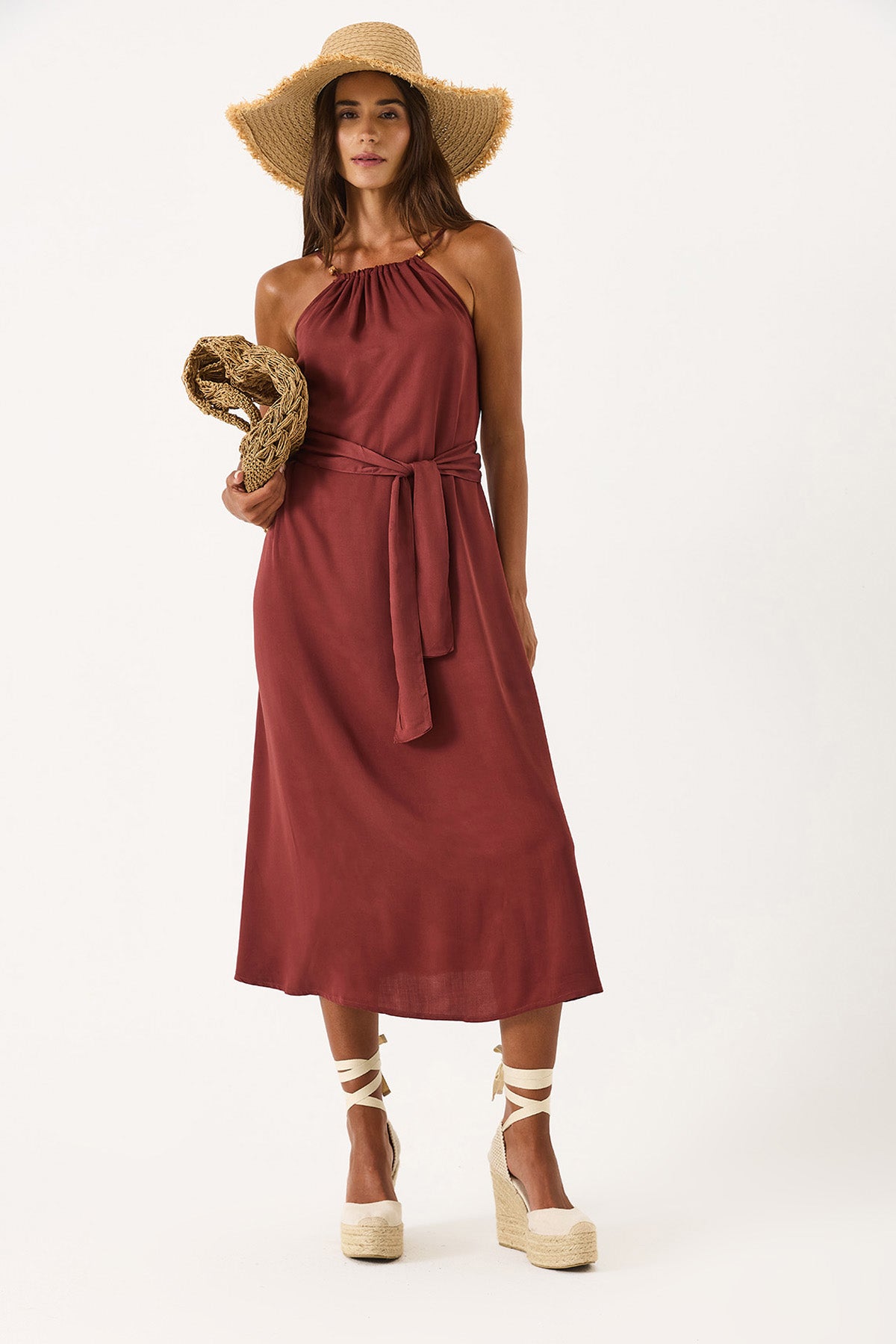 Kadın Marmaris Boncuk Askılı Saten Elbise %100 Viskon - Bordo