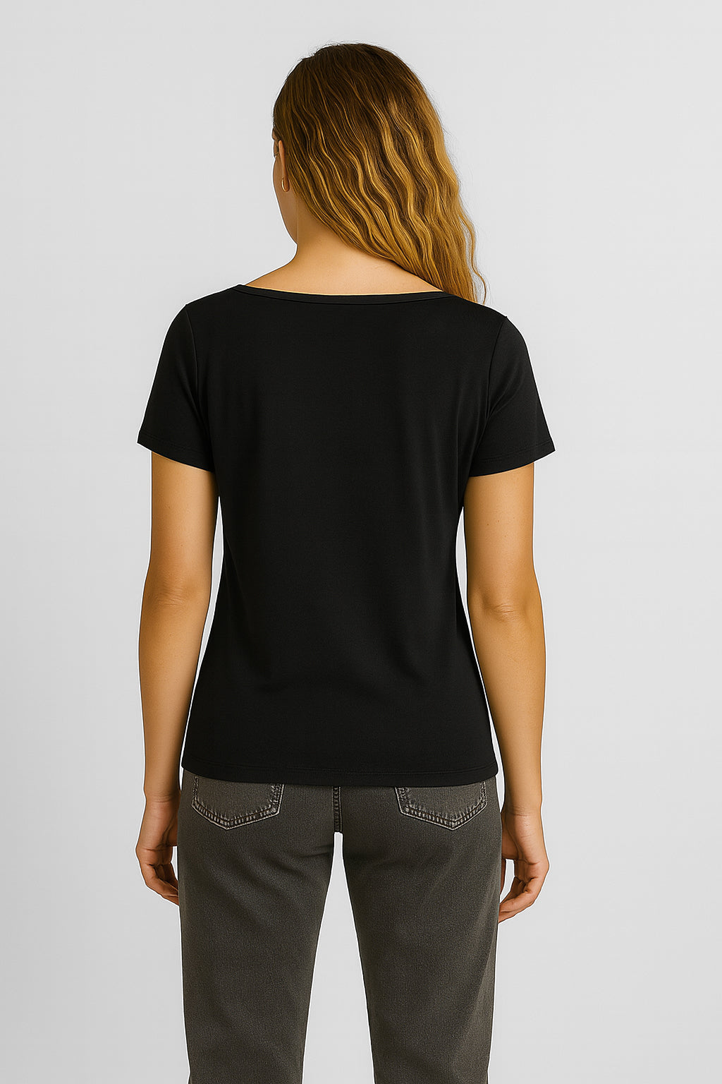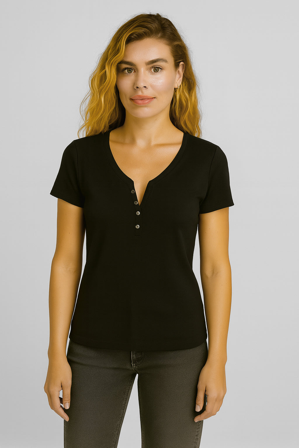 Kadın Matilda Düğme Detaylı Vücuda Oturan Kısa Kollu Tişört %100 Pamuk - Siyah
