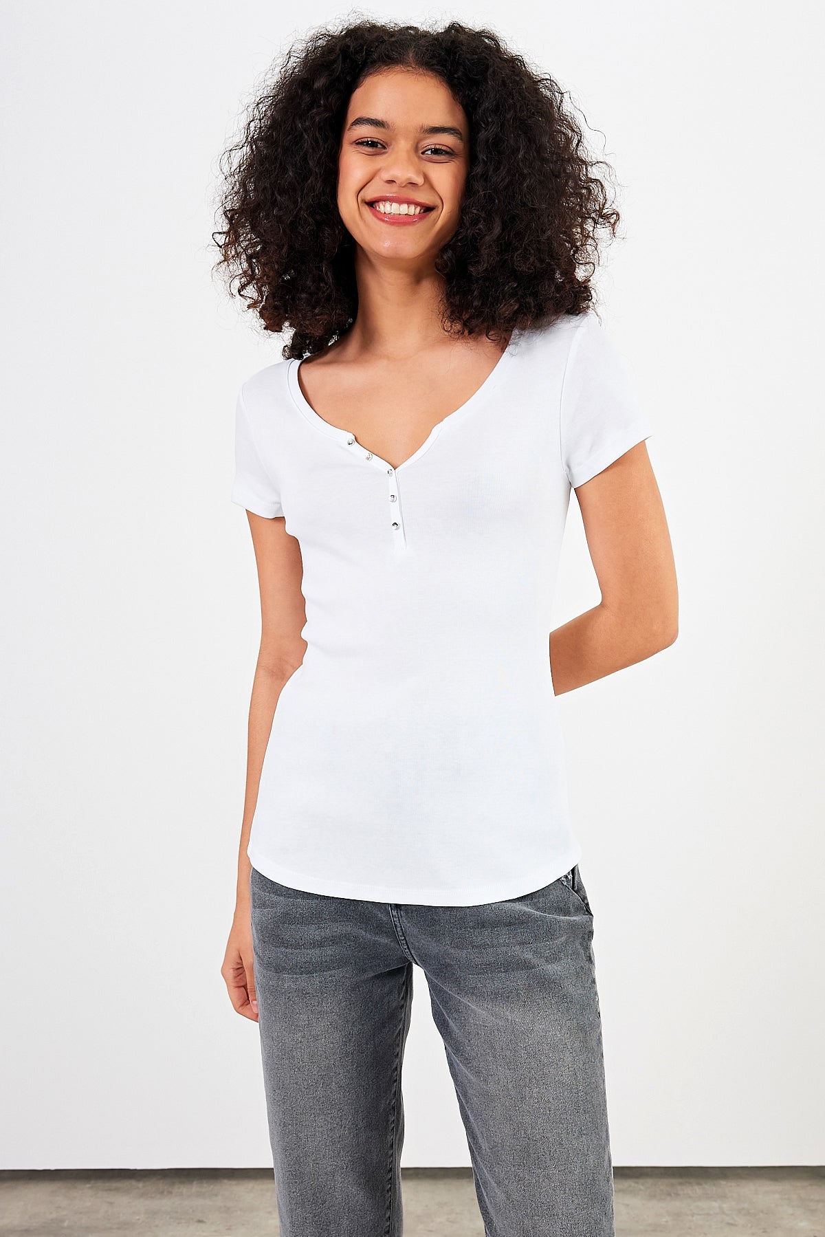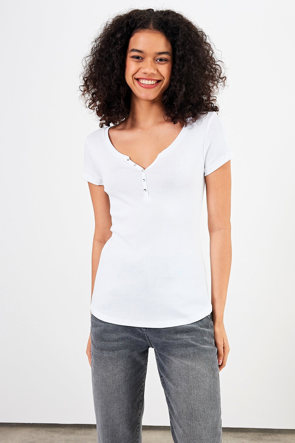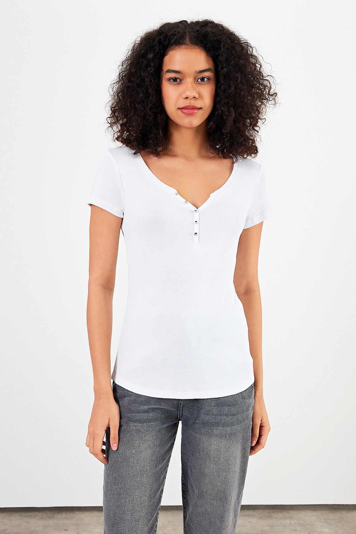 Kadın Matilda Düğme Detaylı Vücuda Oturan Tişört %100 Pamuk - Beyaz