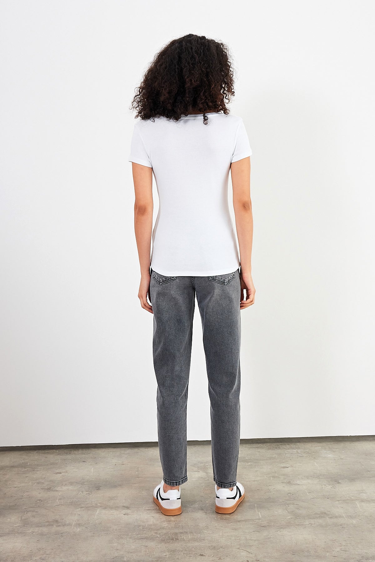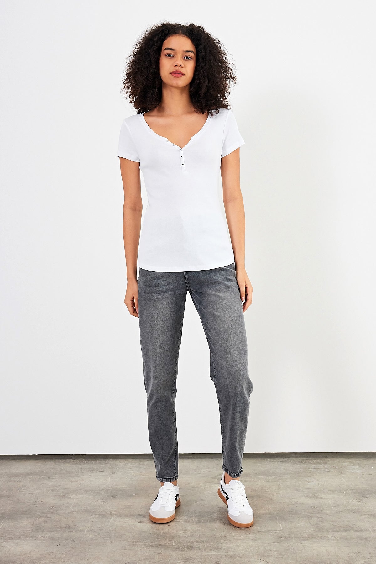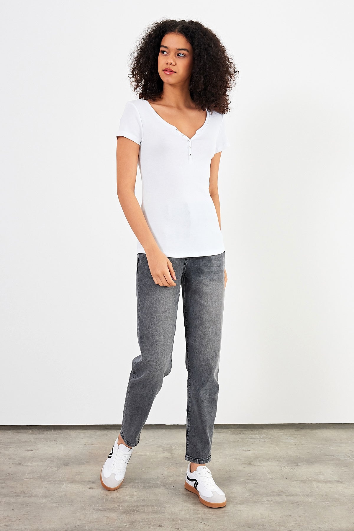 Kadın Matilda Düğme Detaylı Vücuda Oturan Tişört %100 Pamuk - Beyaz
