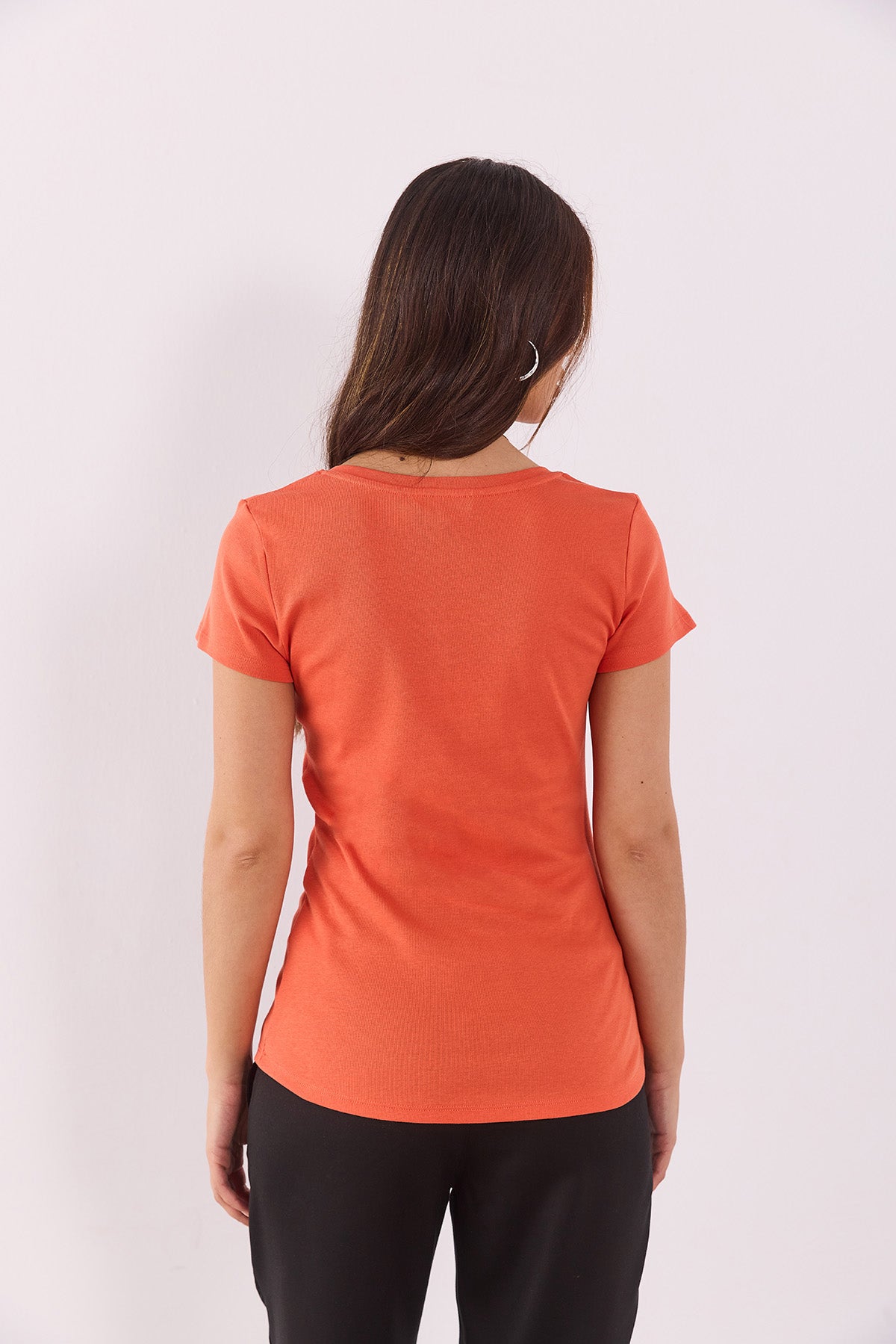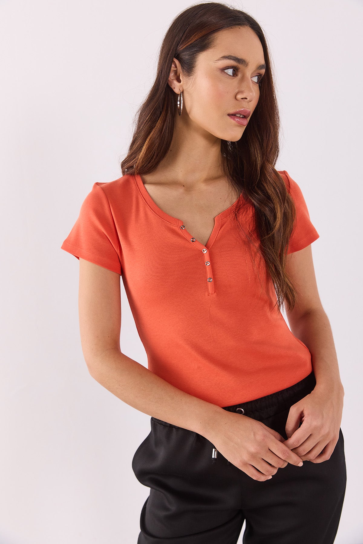Kadın Matilda Düğme Detaylı Vücuda Oturan Tişört %100 Pamuk - Mercan