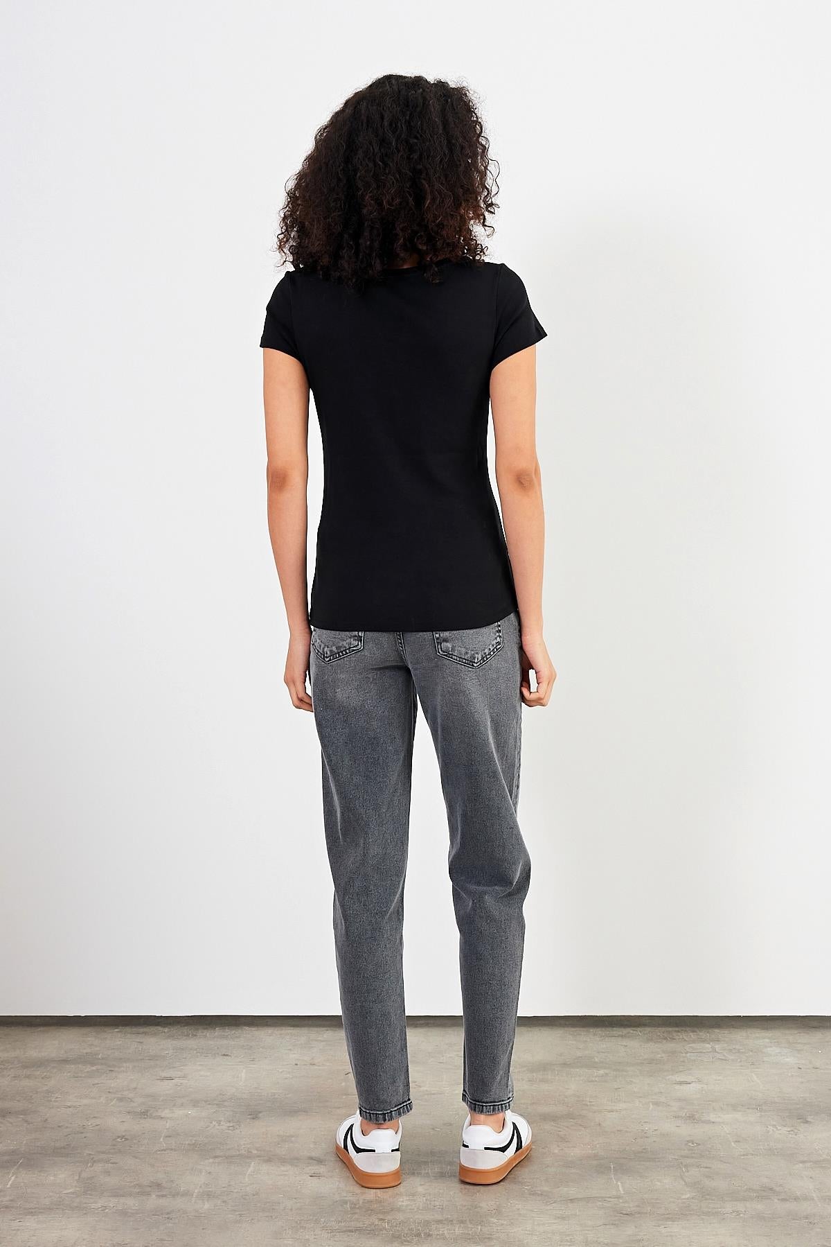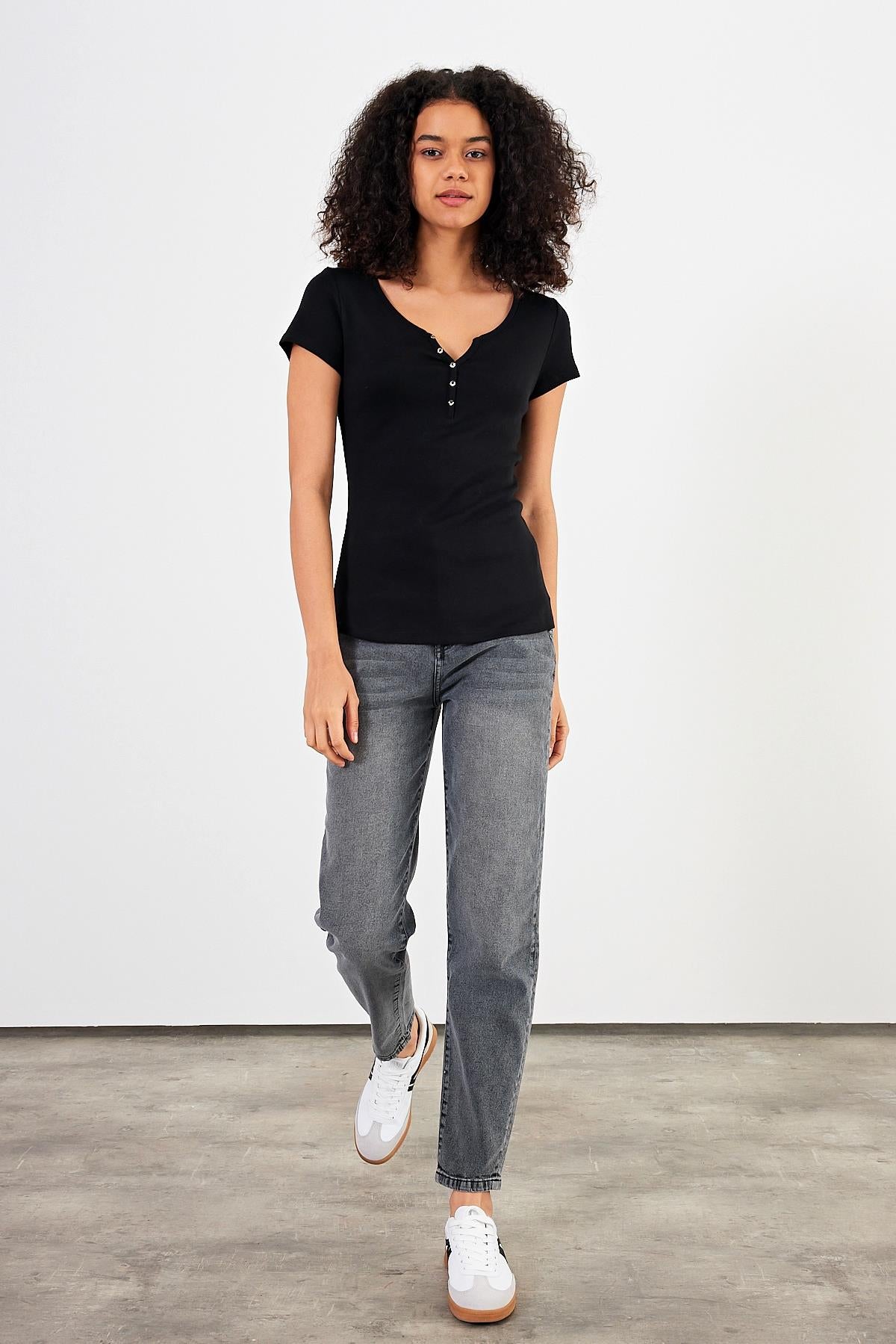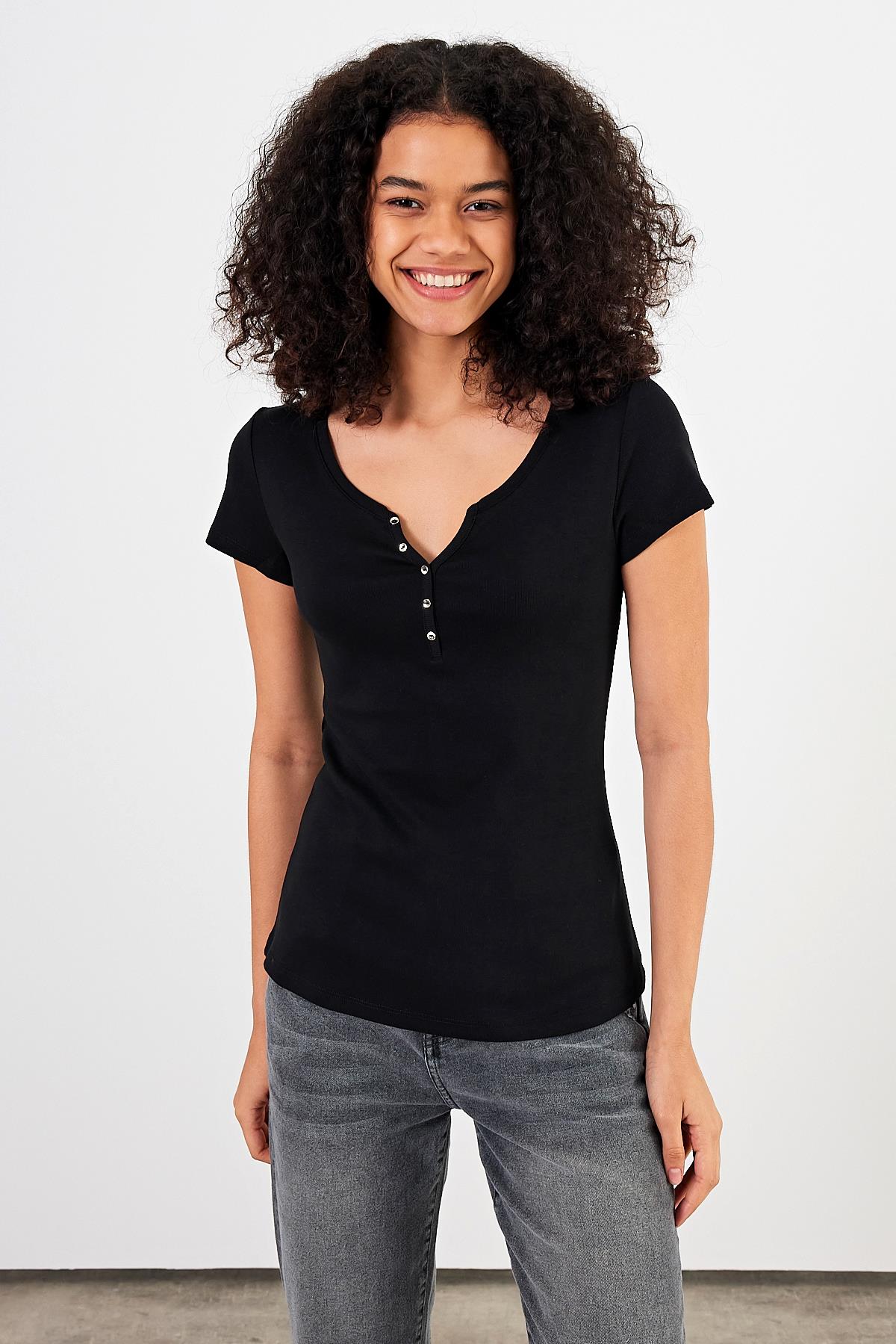 Kadın Matilda Düğme Detaylı Vücuda Oturan Tişört %100 Pamuk - Siyah