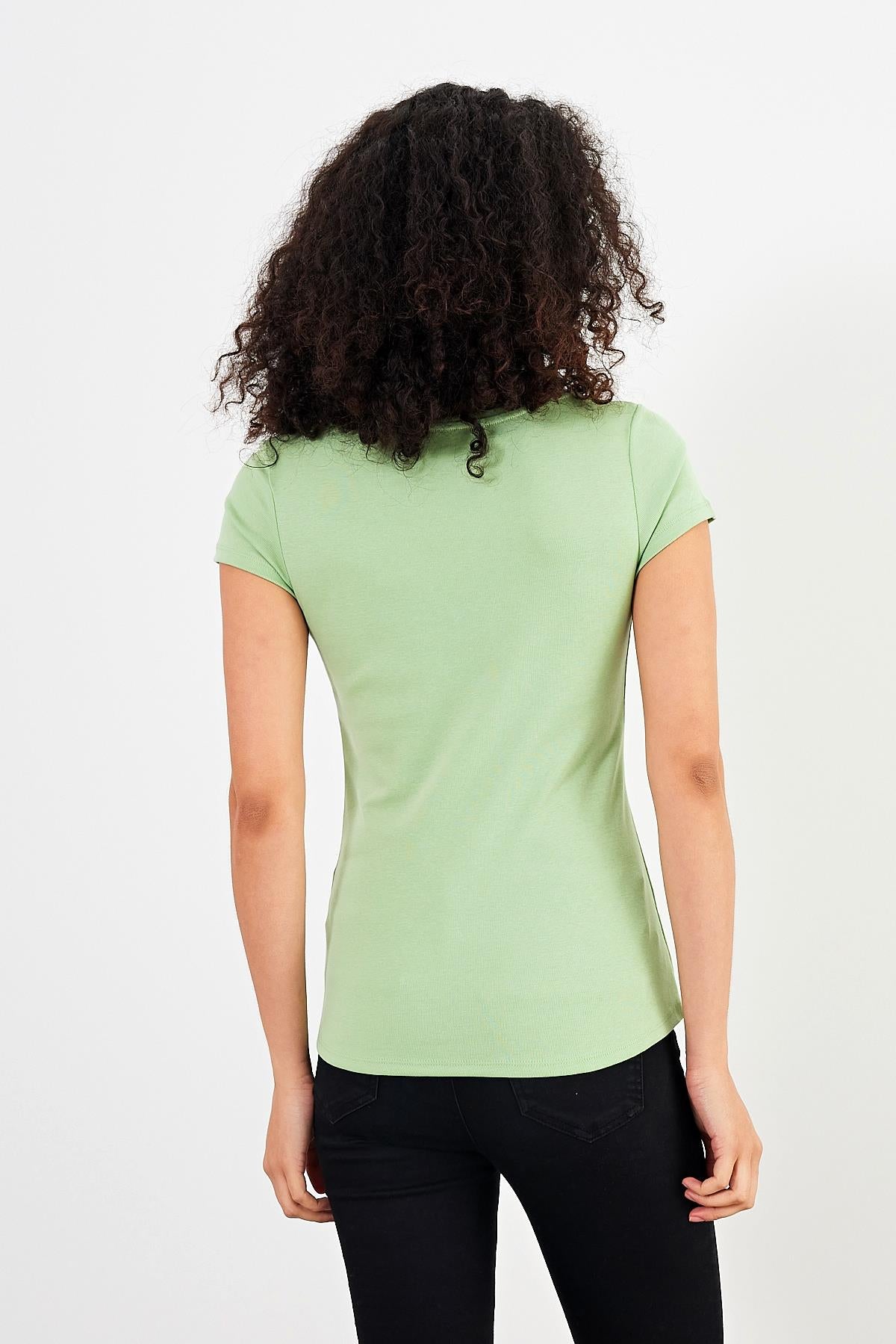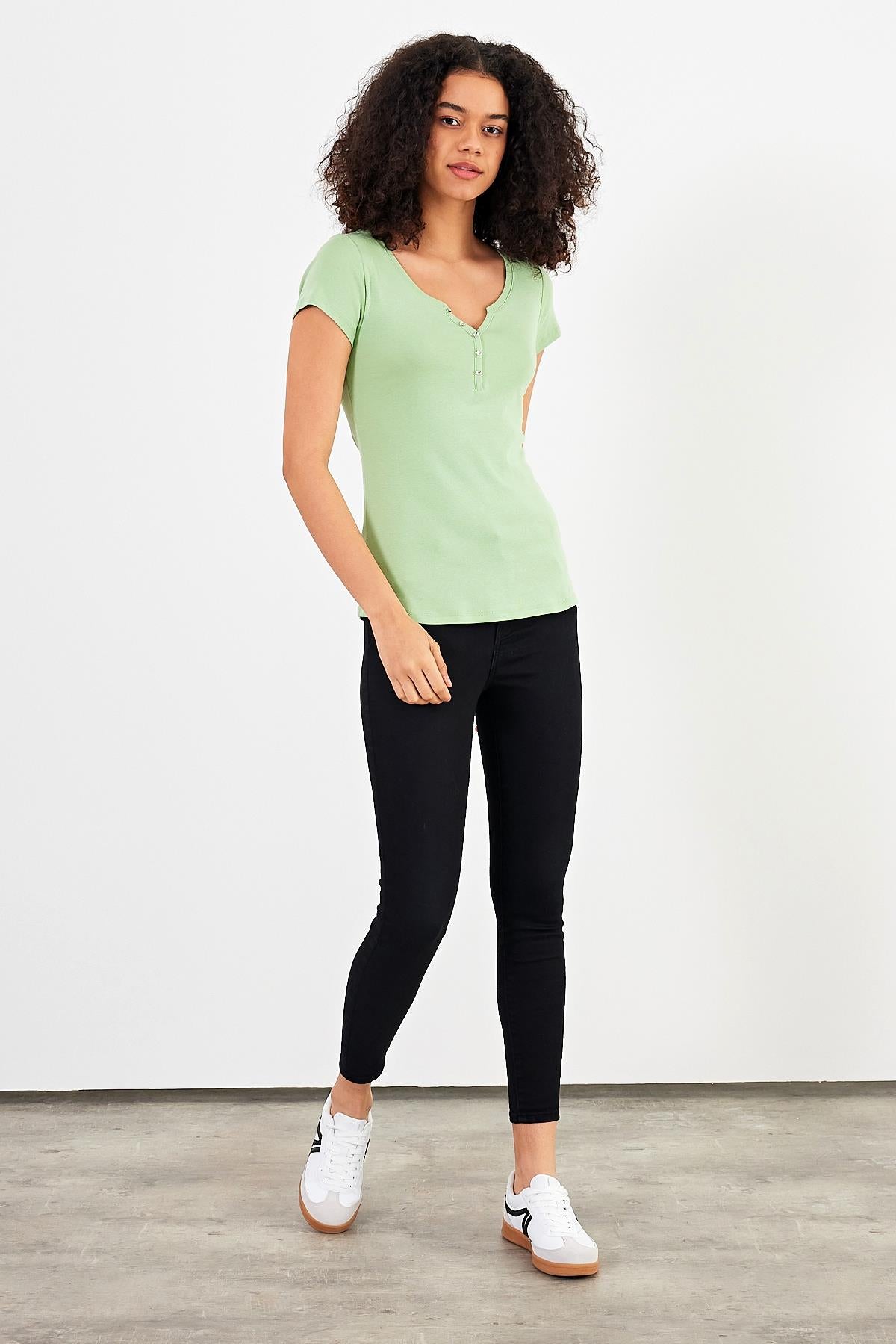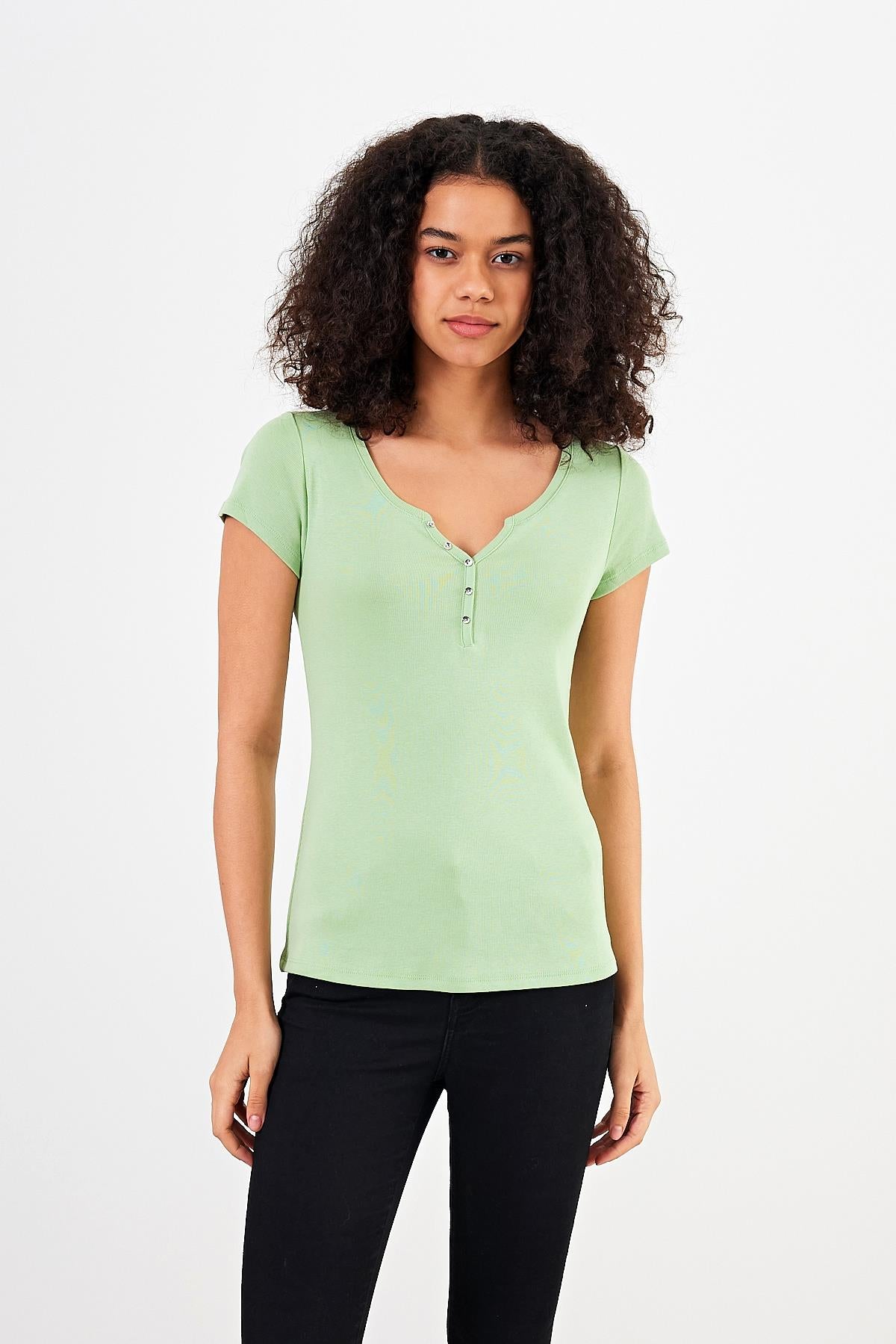 Kadın Matilda Düğme Detaylı Vücuda Oturan Tişört %100 Pamuk - Su Yeşili