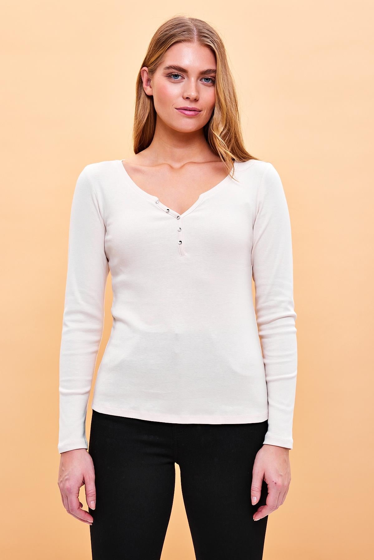 Kadın Matilda Düğme Detaylı Vücuda Oturan Uzun Kollu Tişört %100 Pamuk - Bej