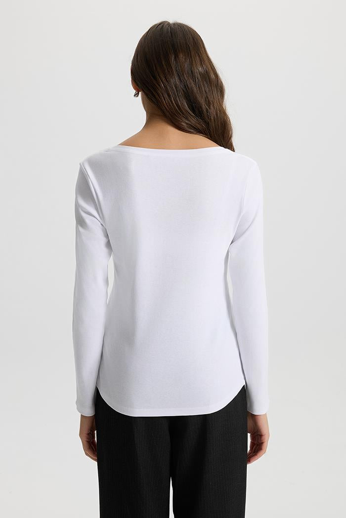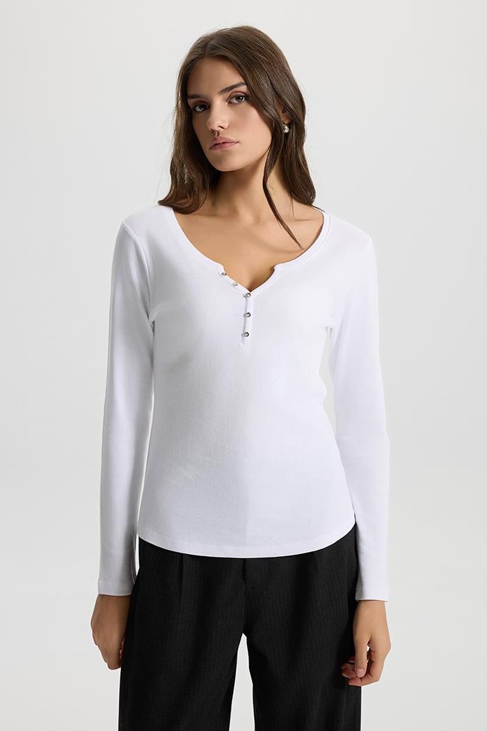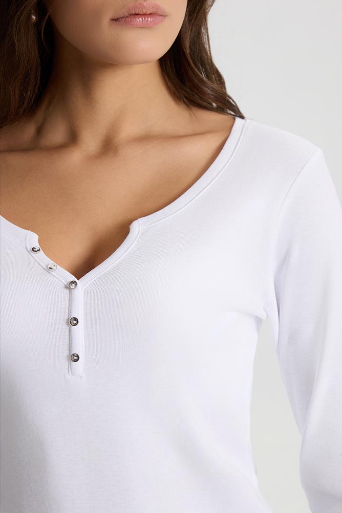 Kadın Matilda Düğme Detaylı Vücuda Oturan Uzun Kollu Tişört %100 Pamuk - Beyaz