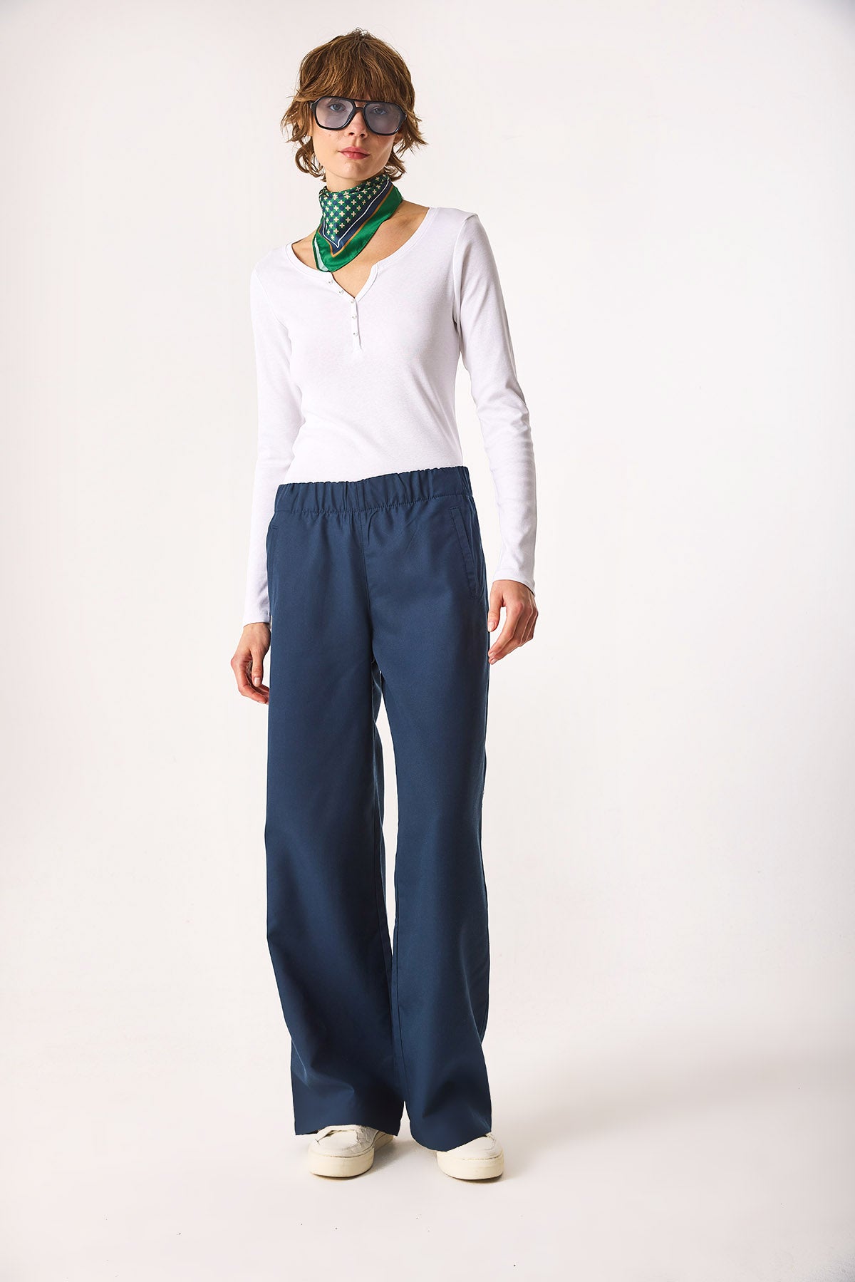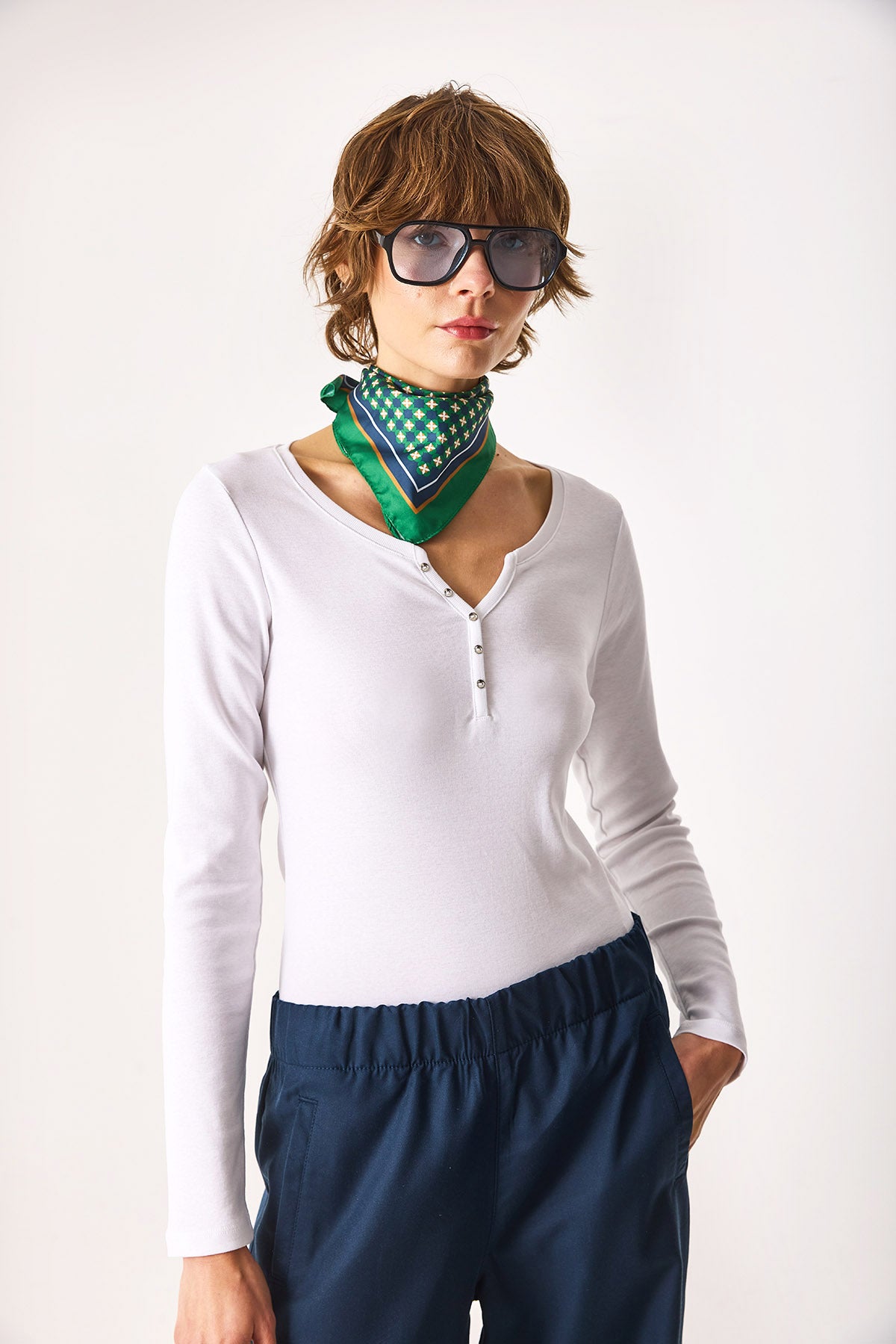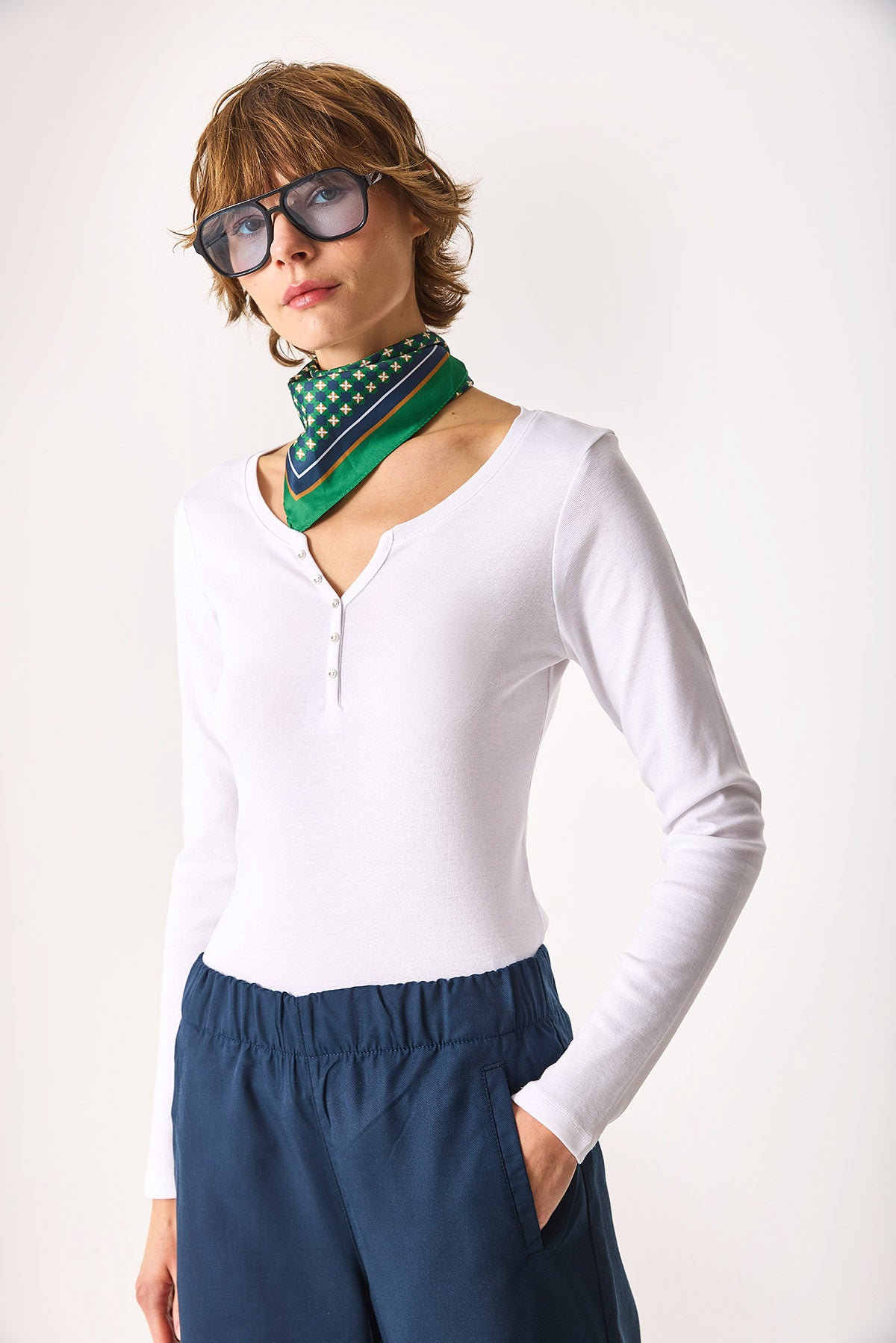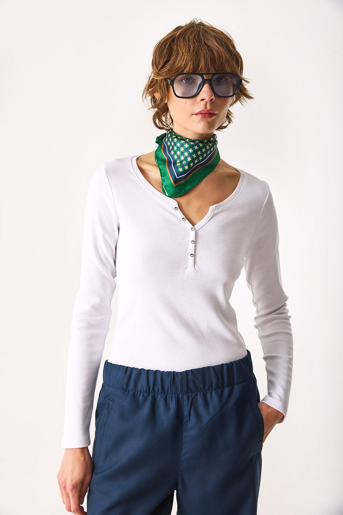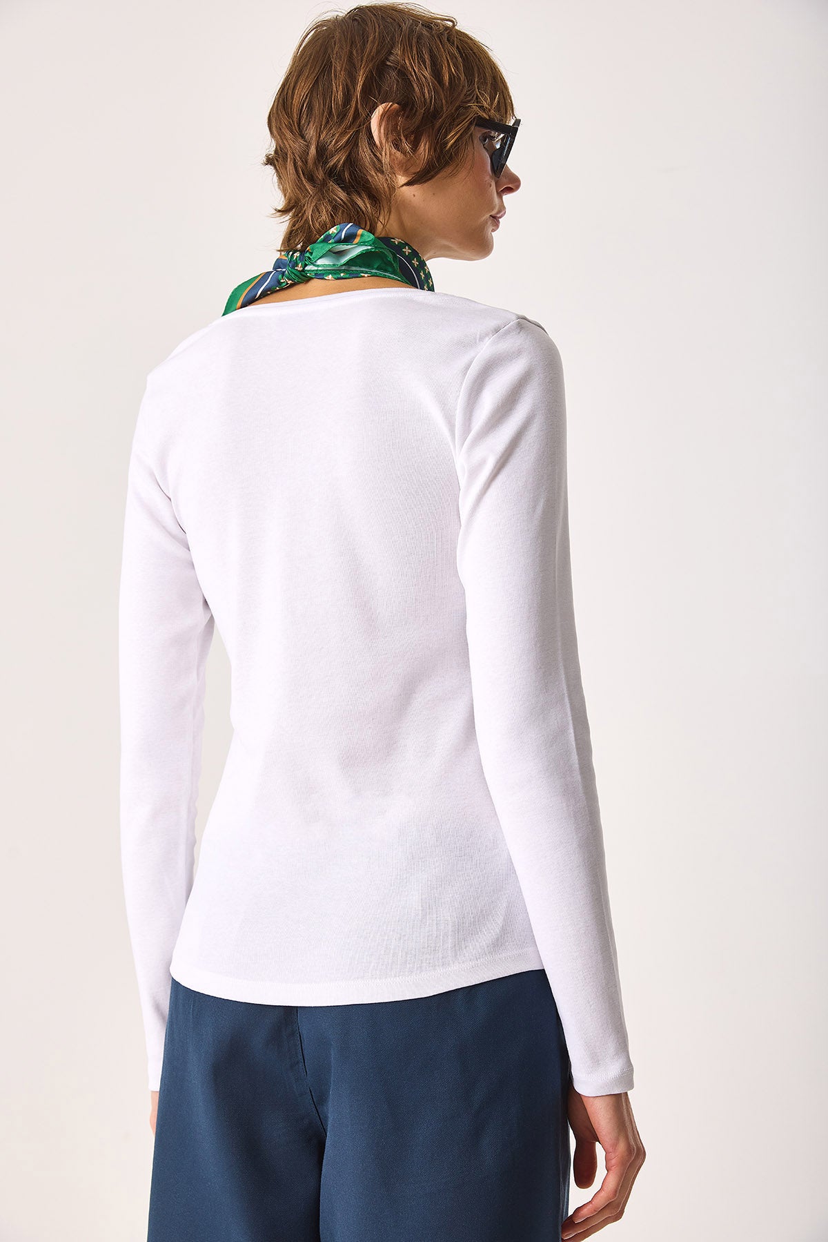 Kadın Matilda Düğme Detaylı Vücuda Oturan Uzun Kollu Tişört %100 Pamuk - Beyaz