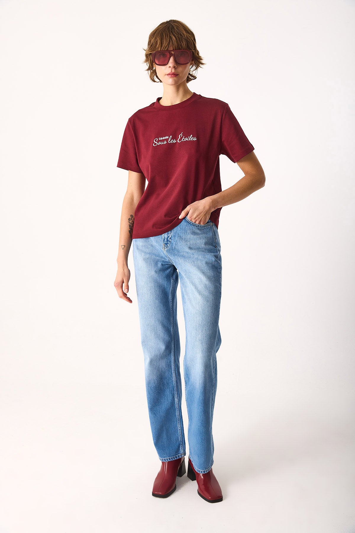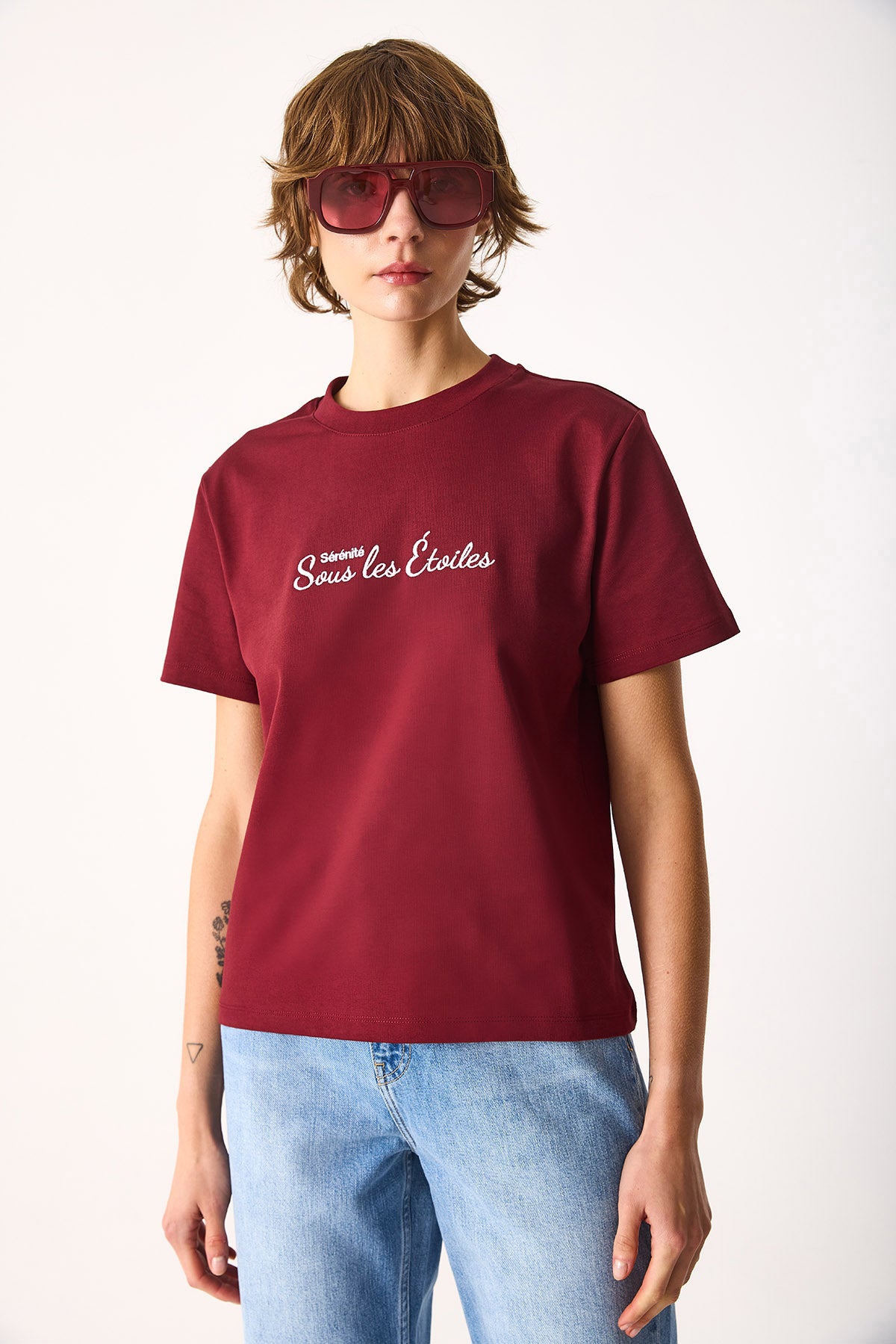 Kadın Nakışlı Sloganlı Tişört %100 Pamuk - Bordo
