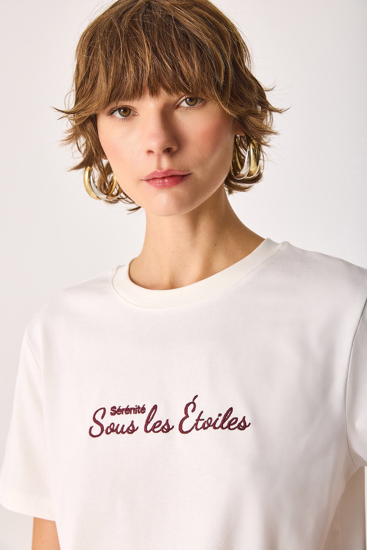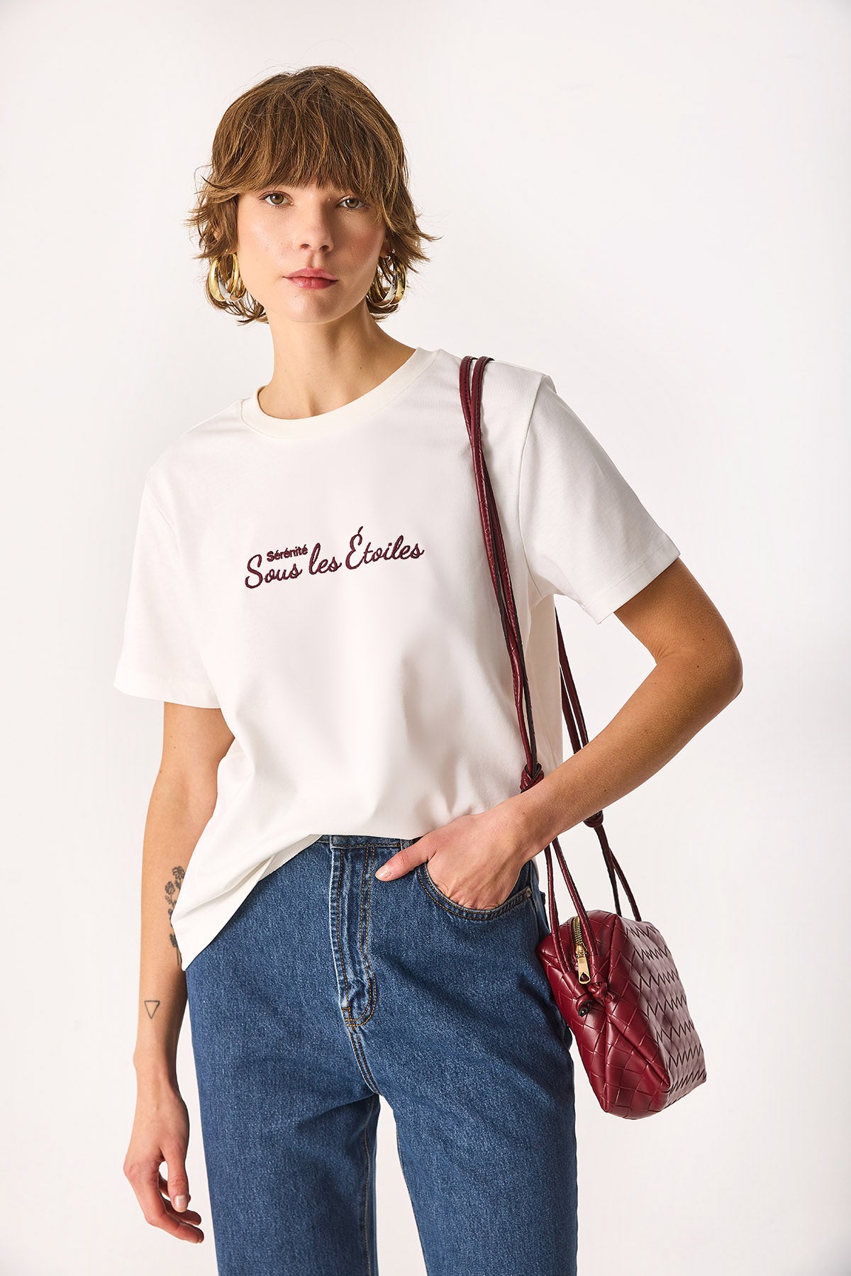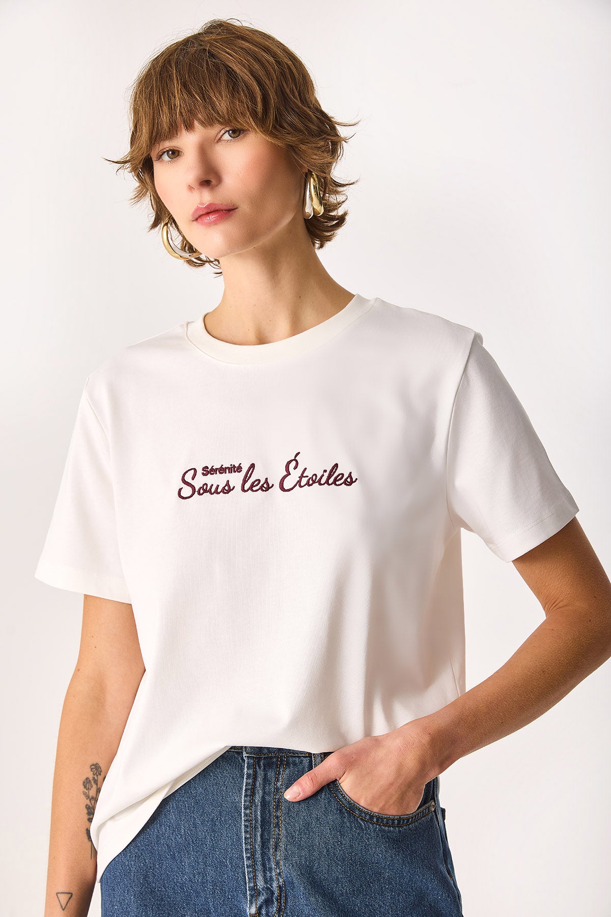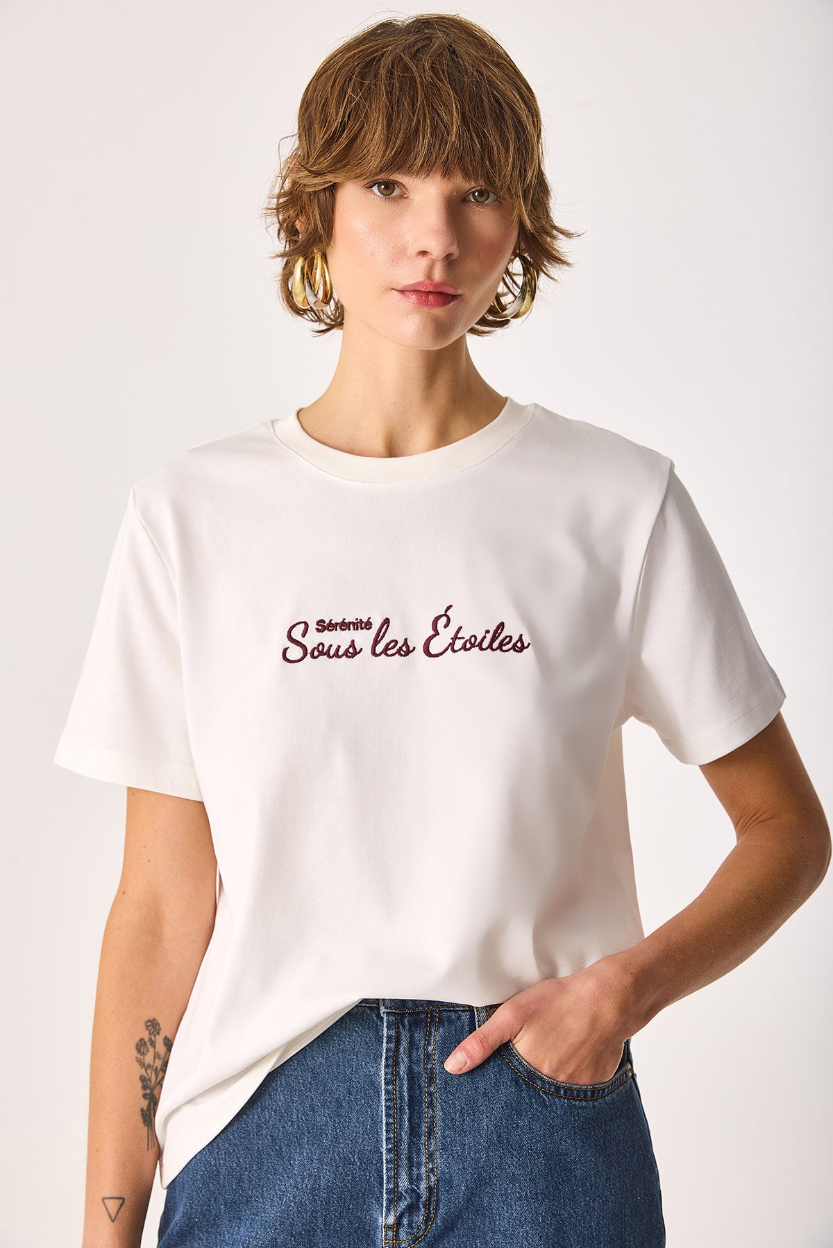 Kadın Nakışlı Sloganlı Tişört %100 Pamuk - Fildişi