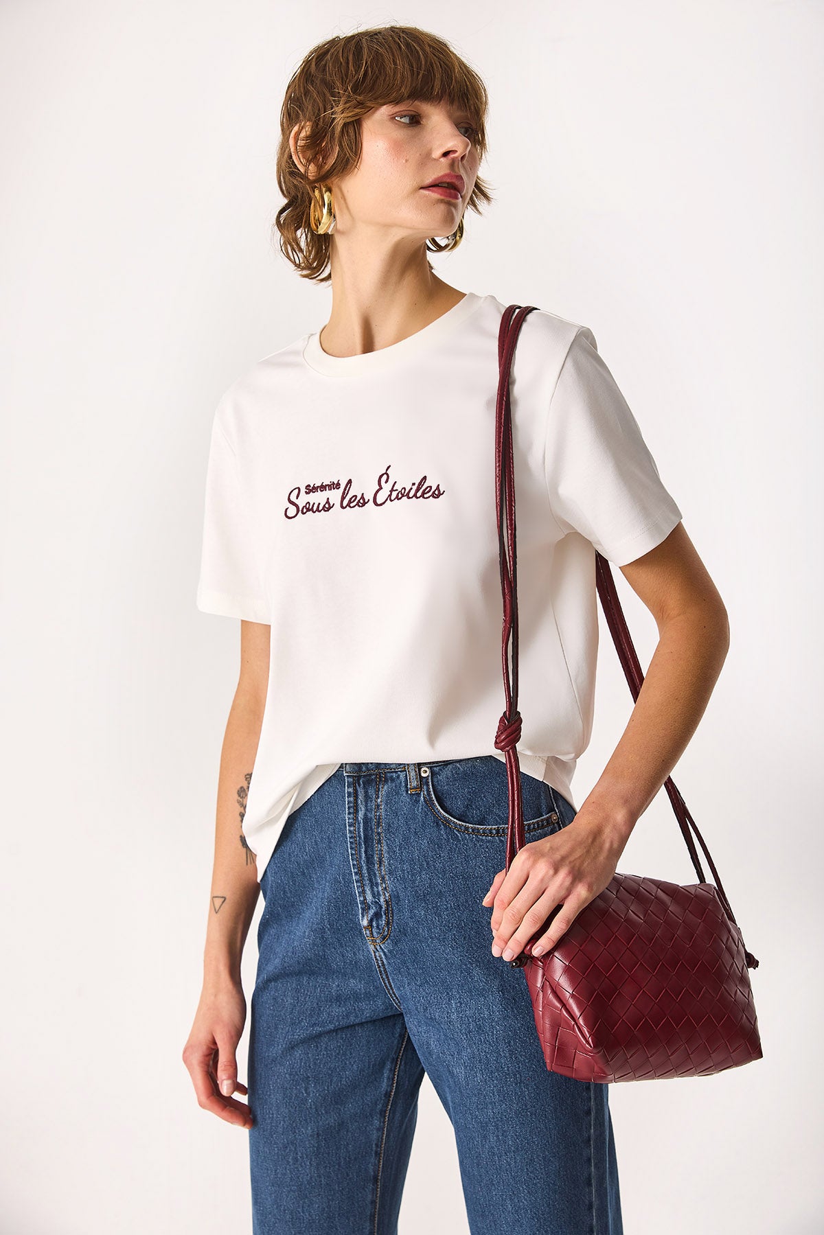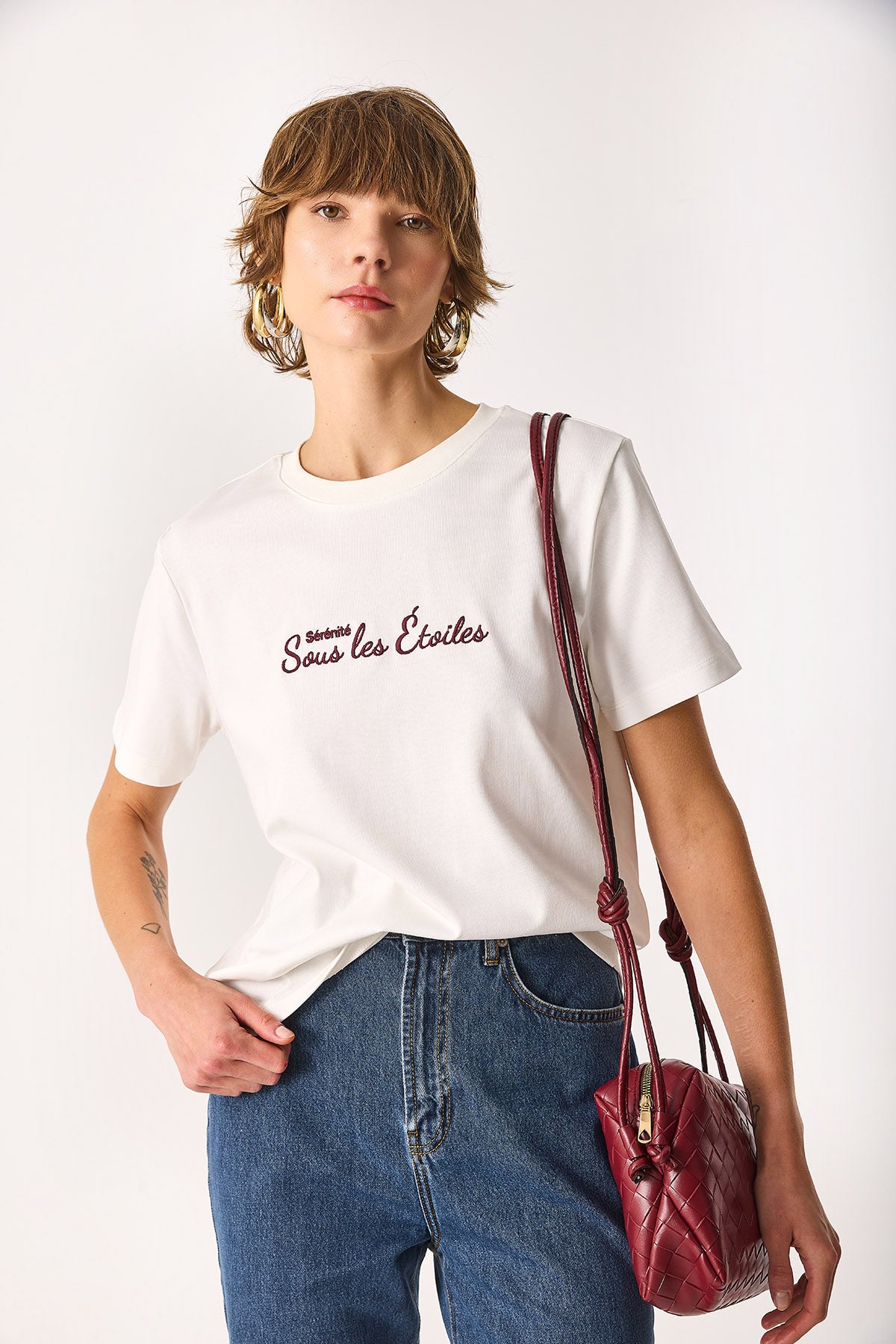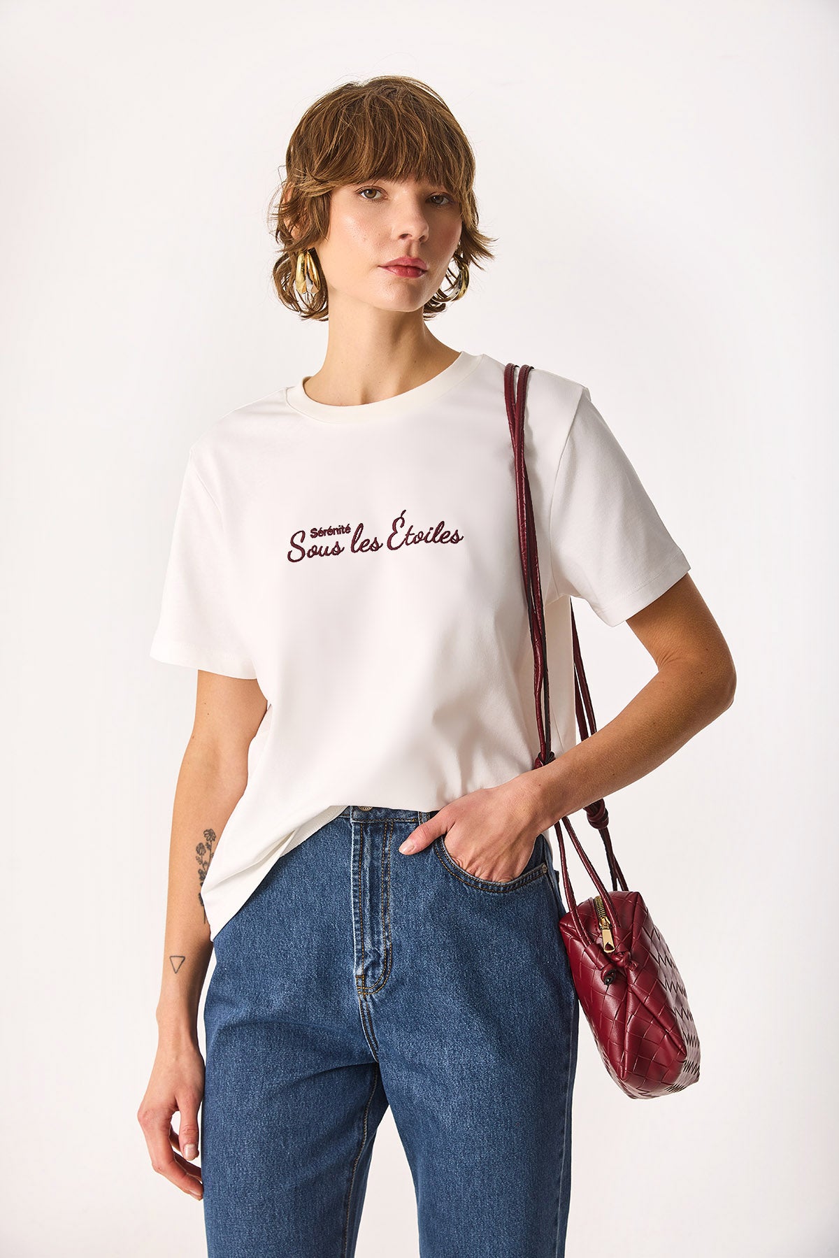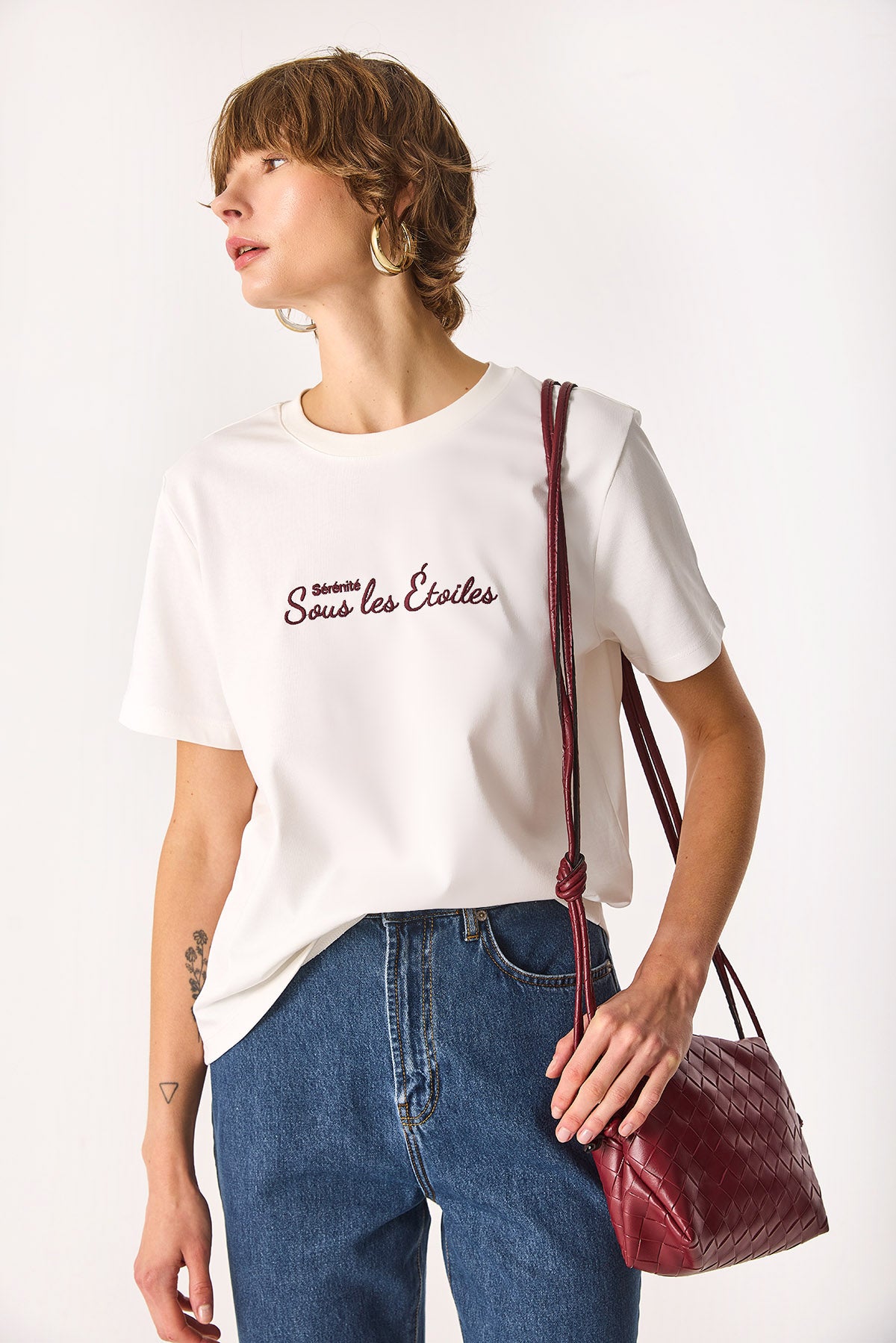 Kadın Nakışlı Sloganlı Tişört %100 Pamuk - Fildişi