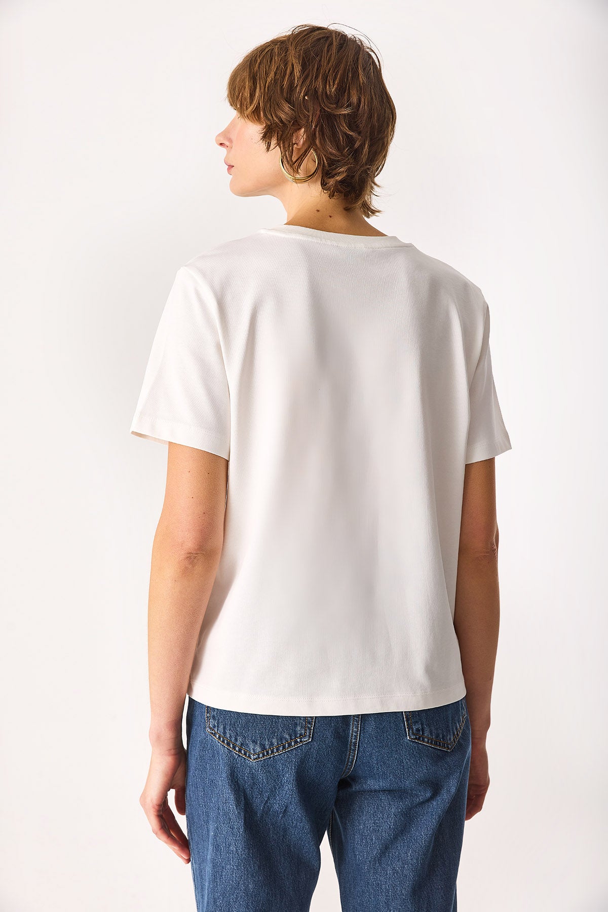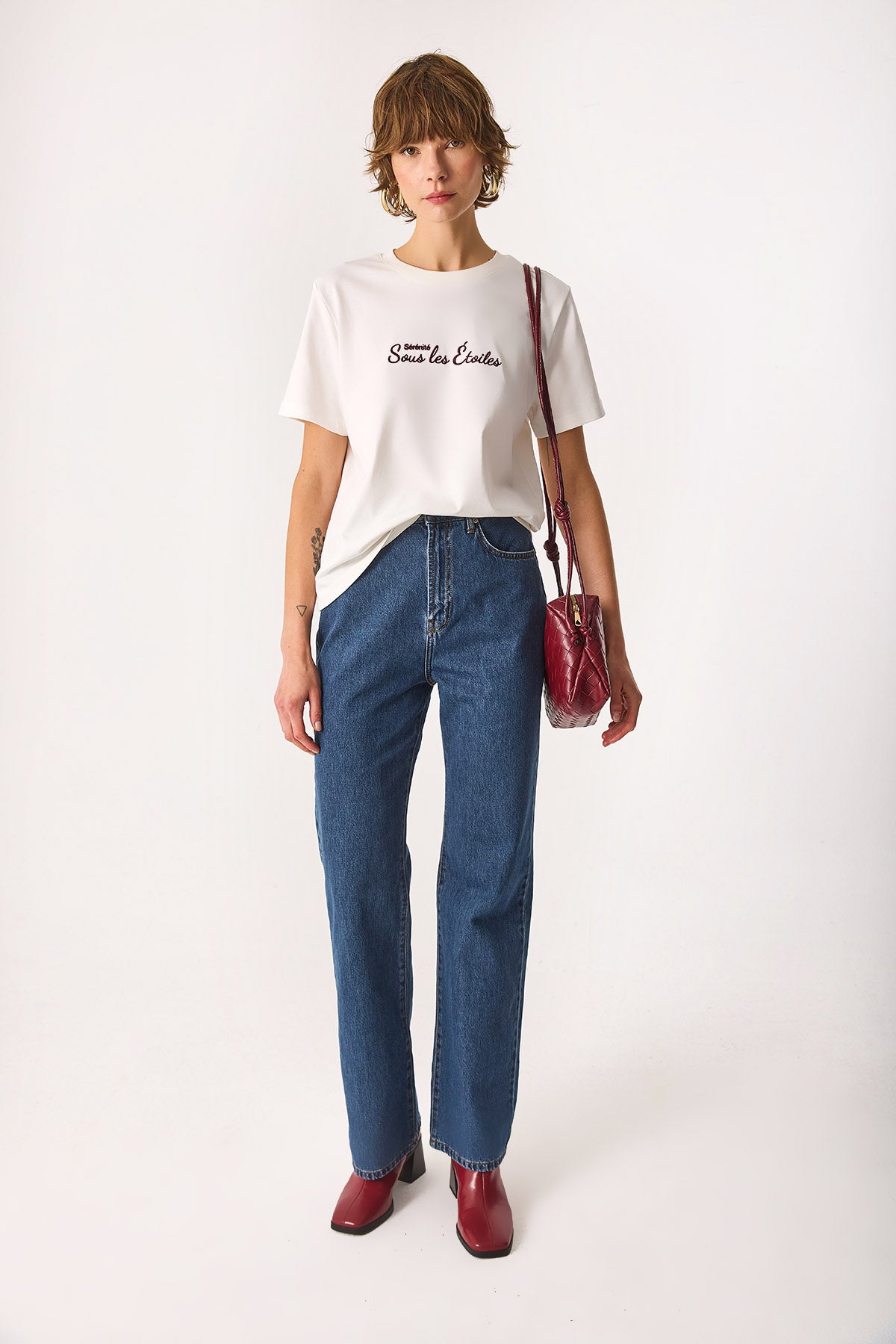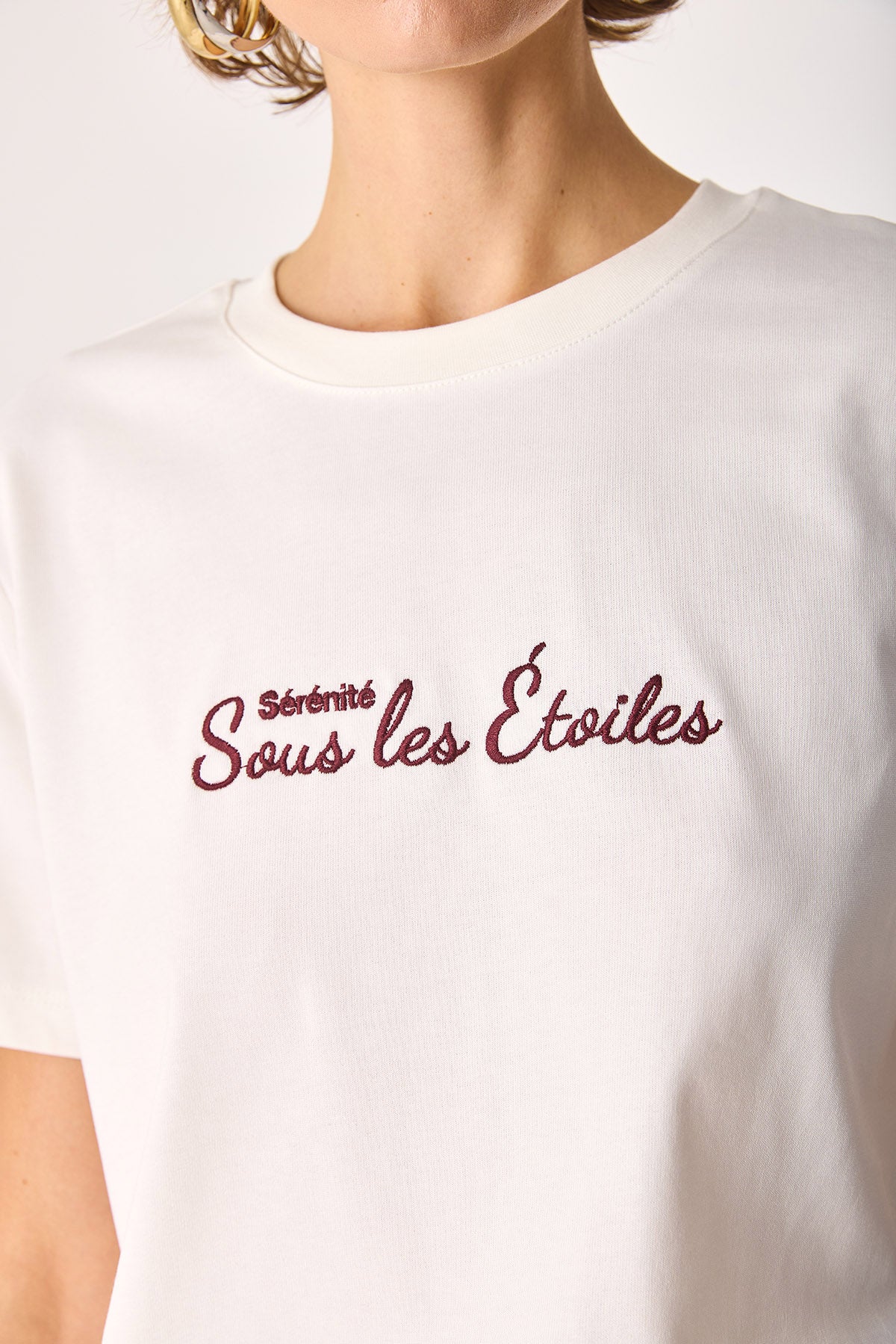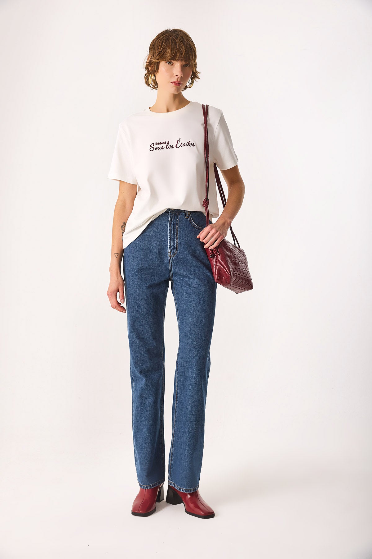 Kadın Nakışlı Sloganlı Tişört %100 Pamuk - Fildişi