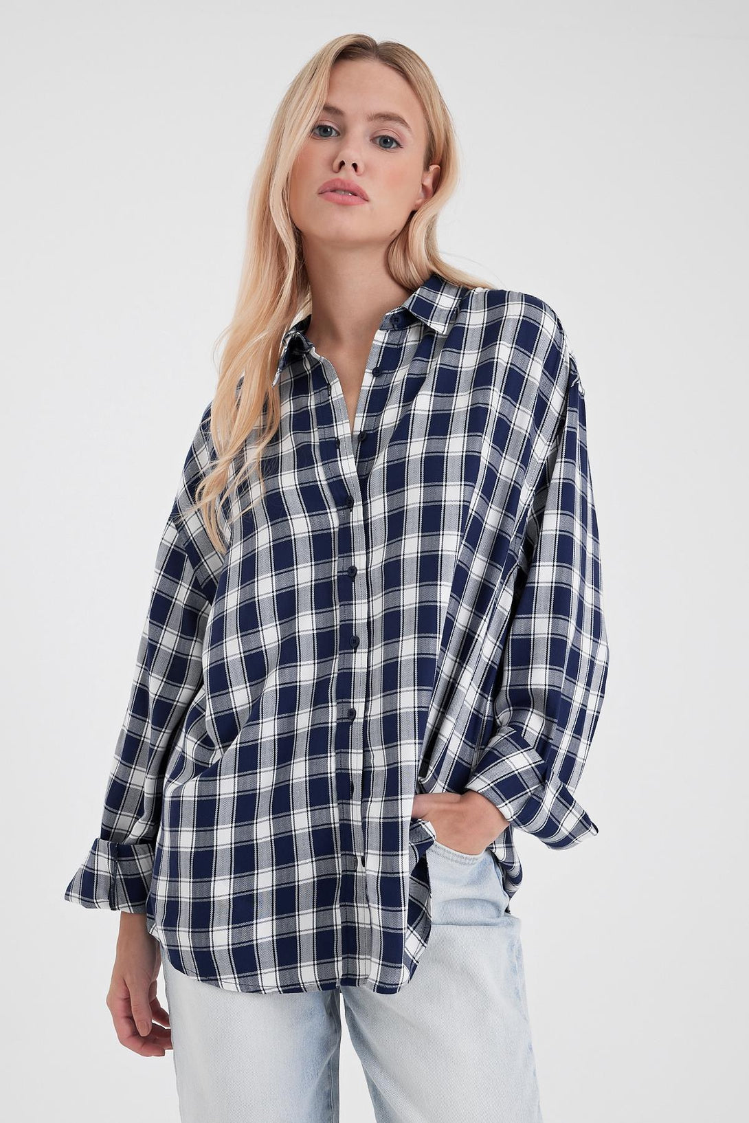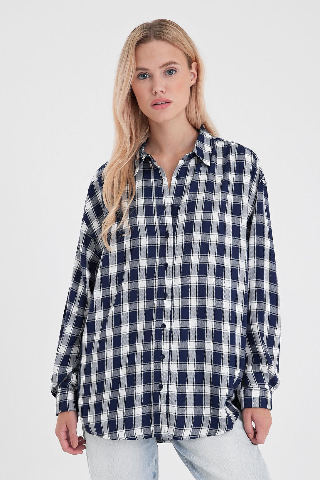 Kadın Naomi İnce Ekose Gömlek %100 Viskon - Lacivert