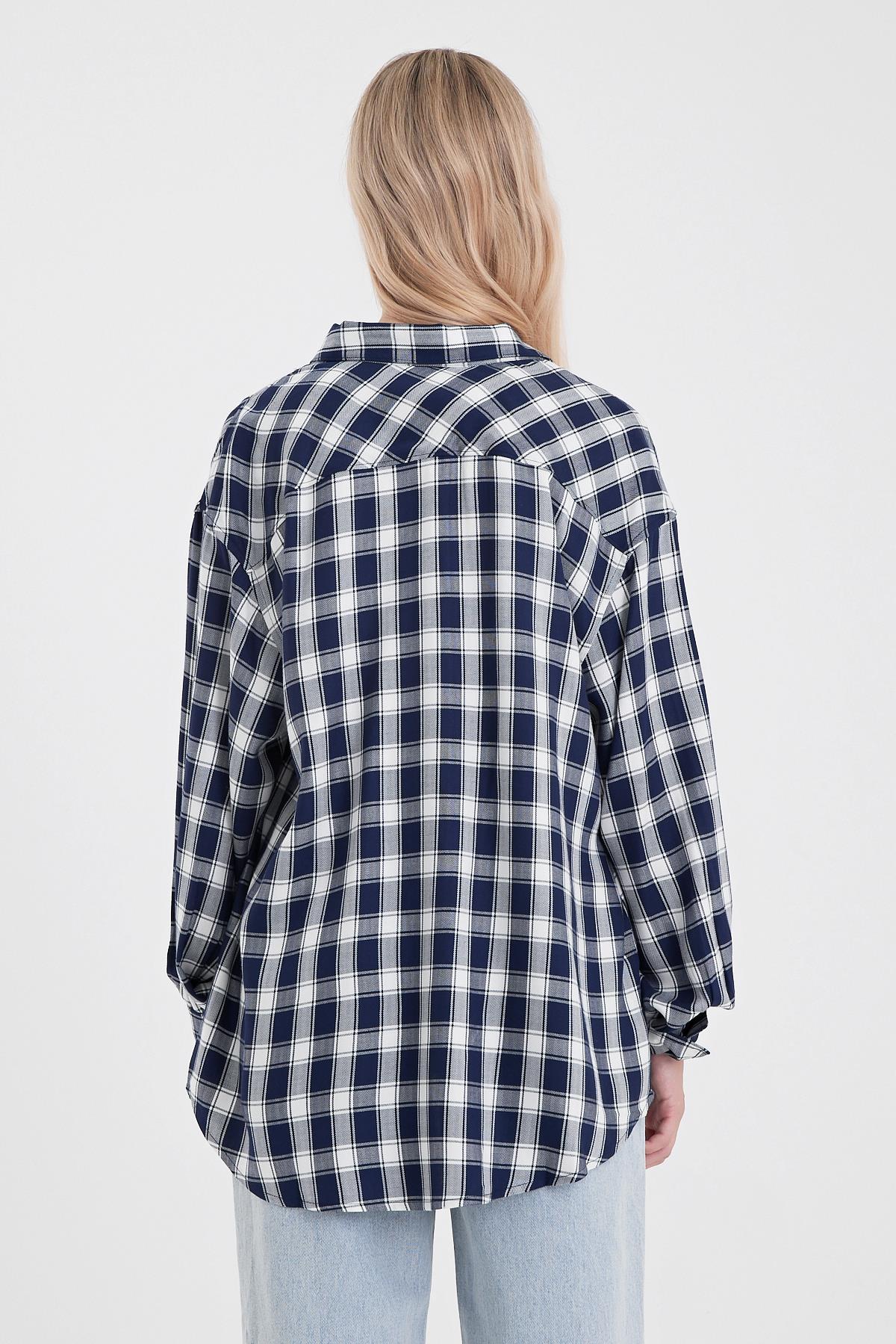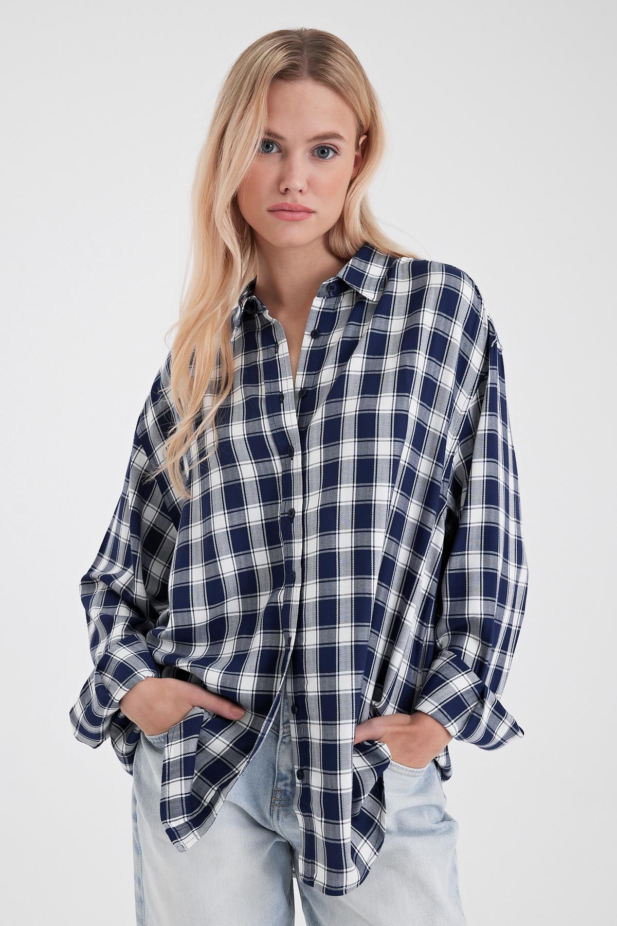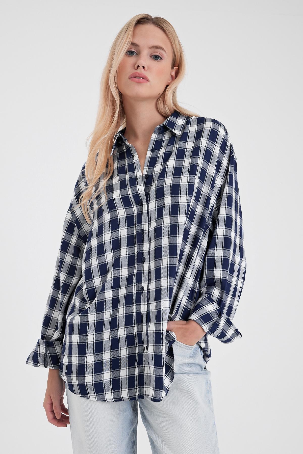 Kadın Naomi İnce Ekose Gömlek %100 Viskon - Lacivert