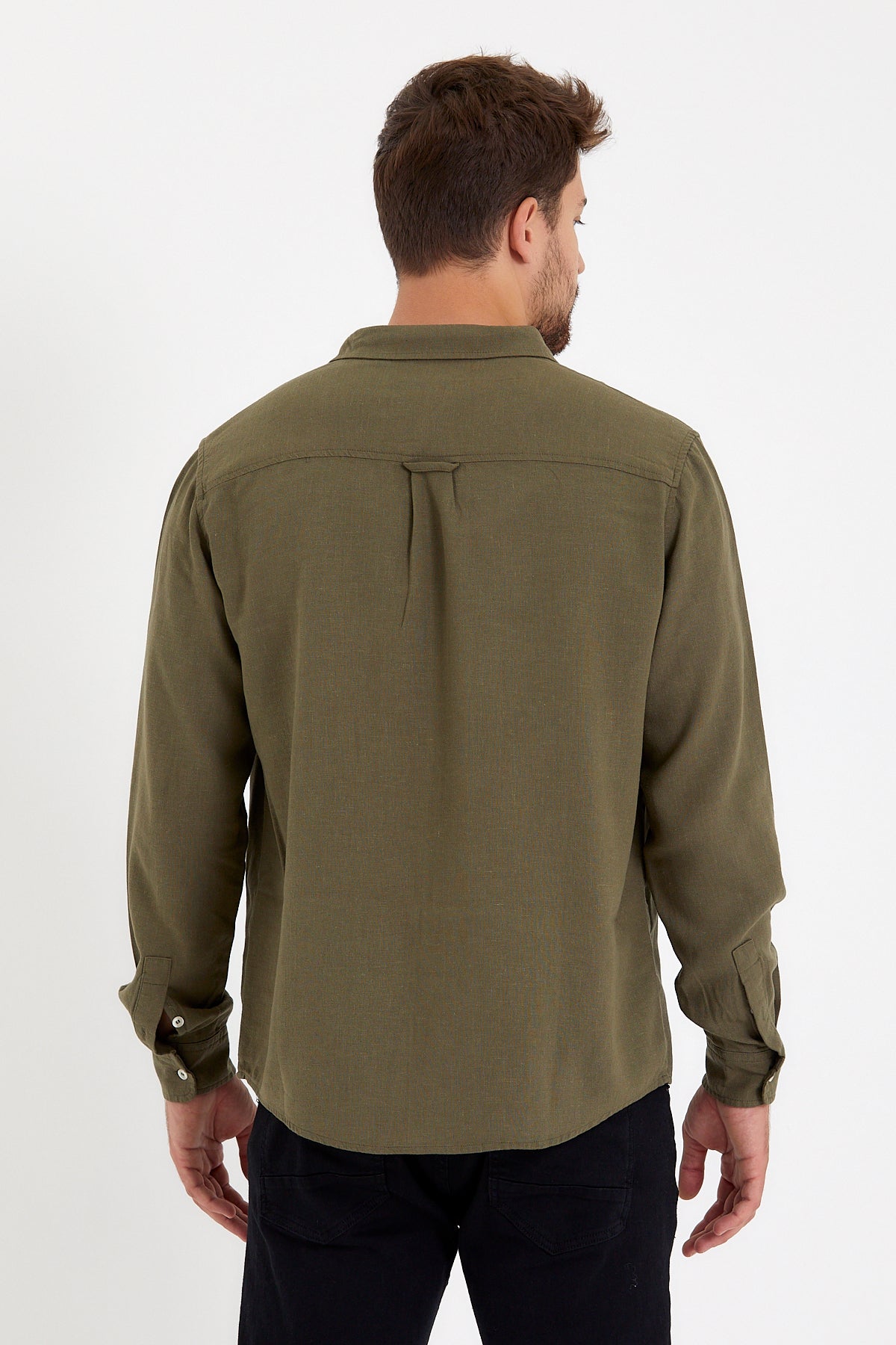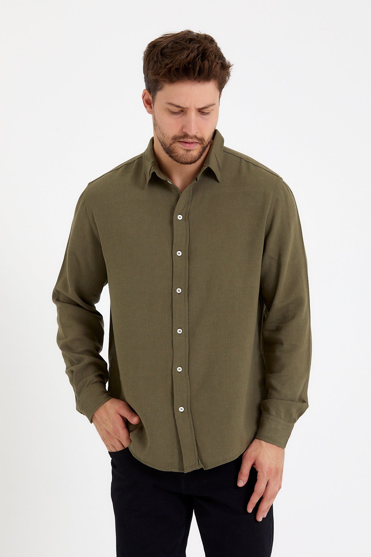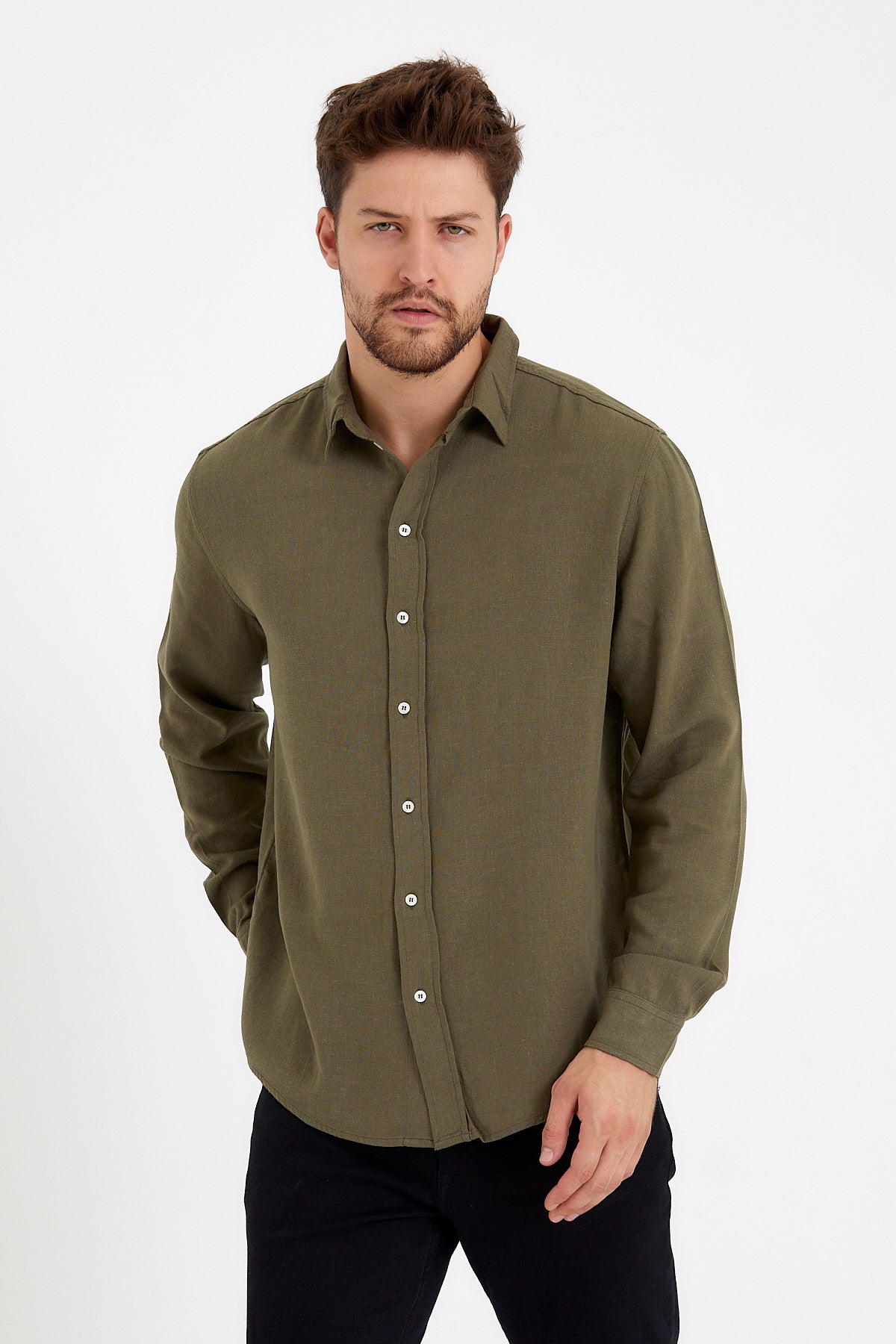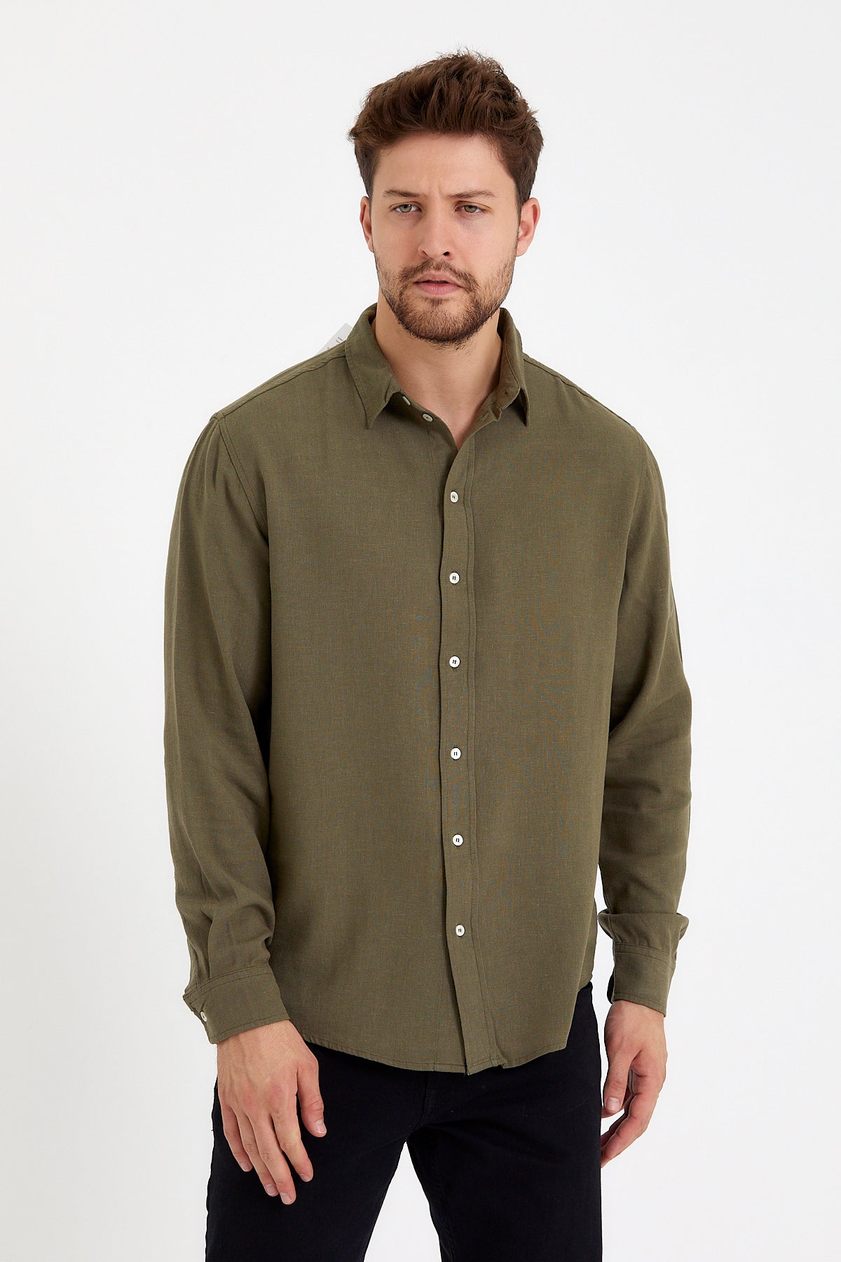 Erkek Nicolas Regular Fit Gömlek %100 Keten - Haki