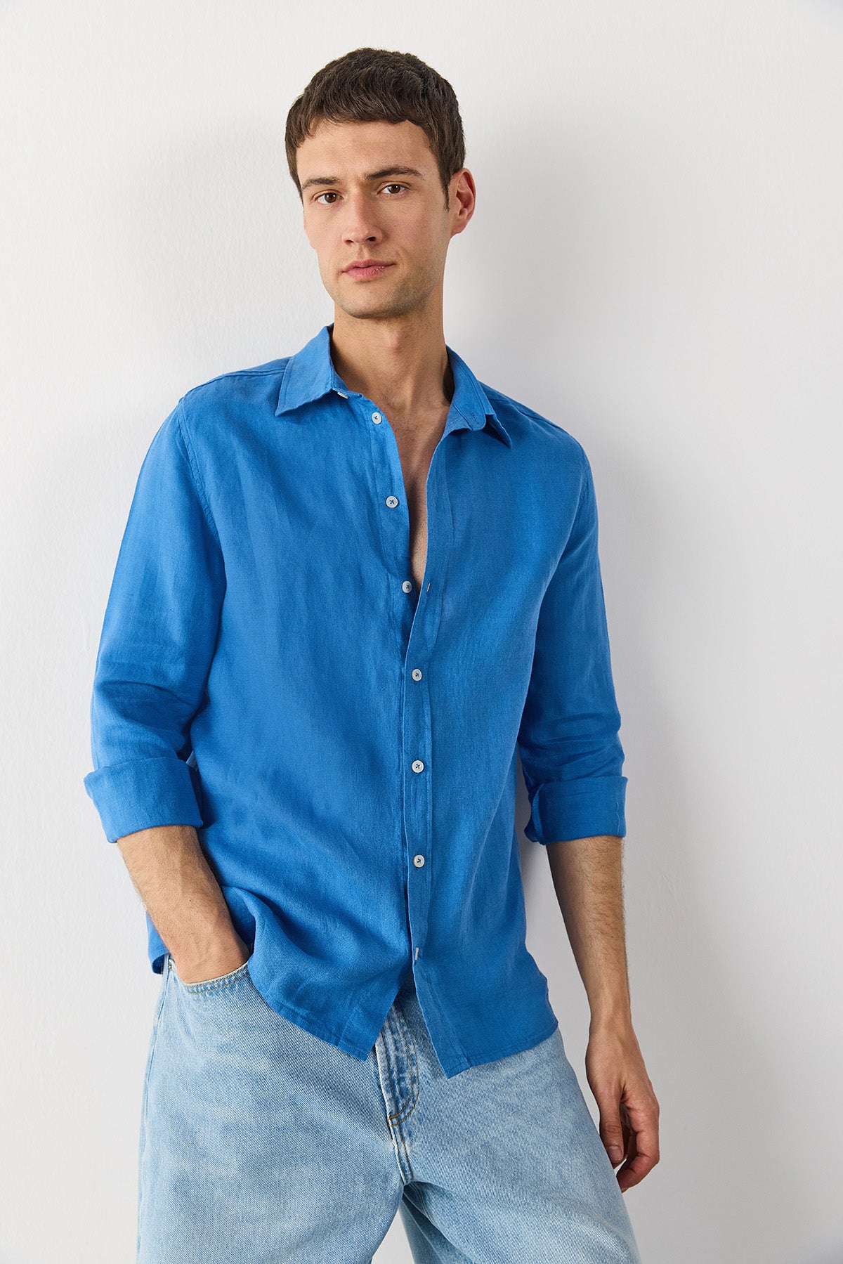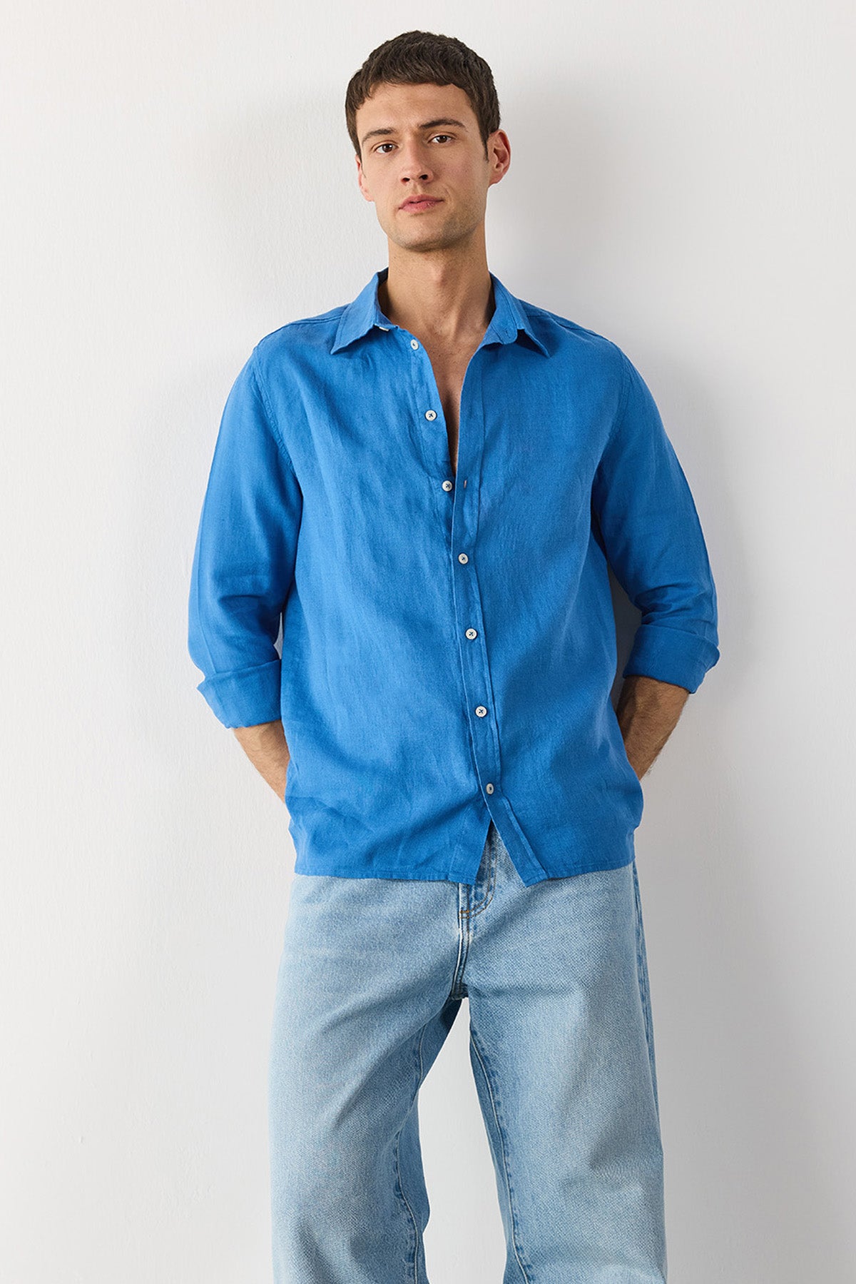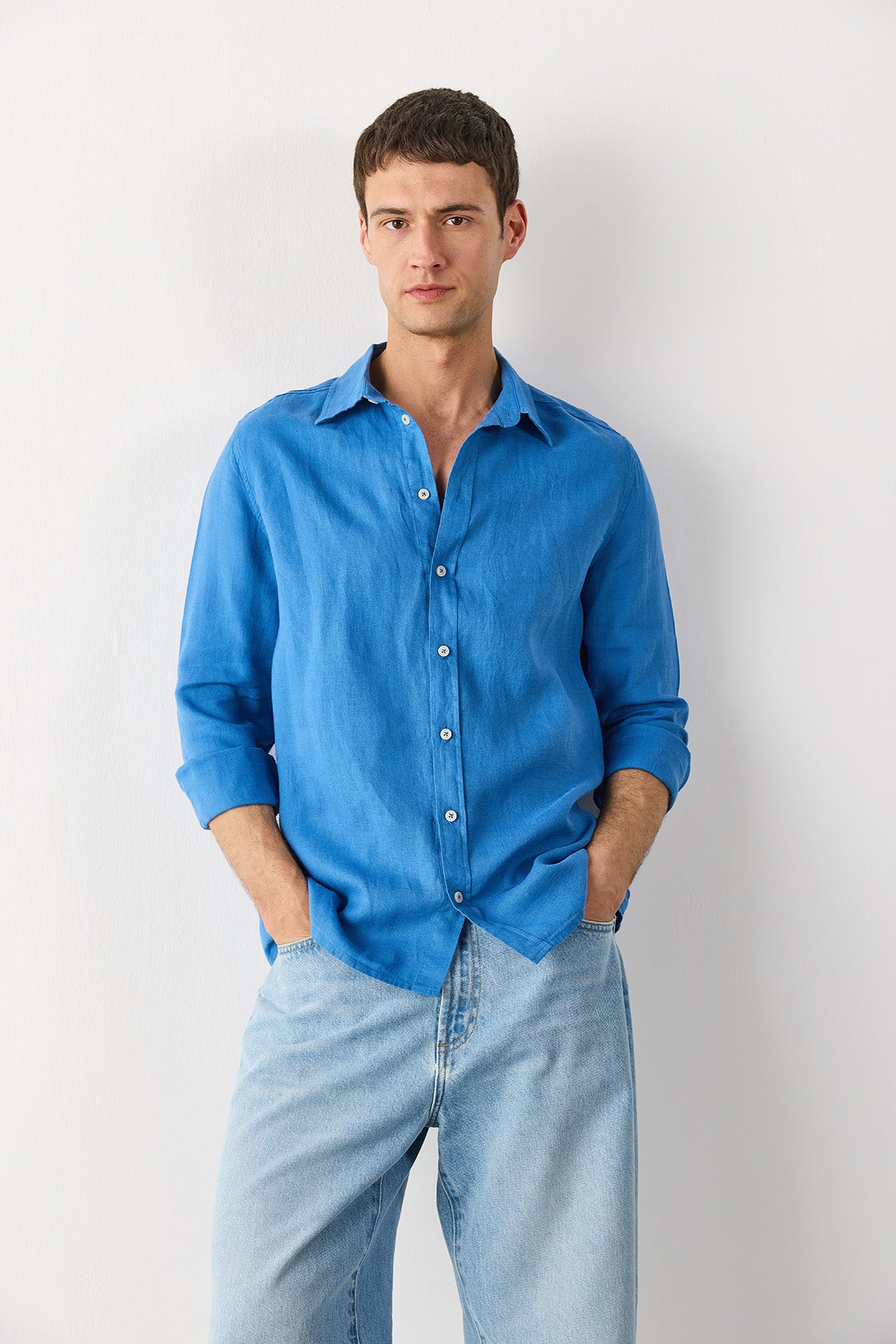 Erkek Nicolas Regular Fit Gömlek %100 Keten - Mavi