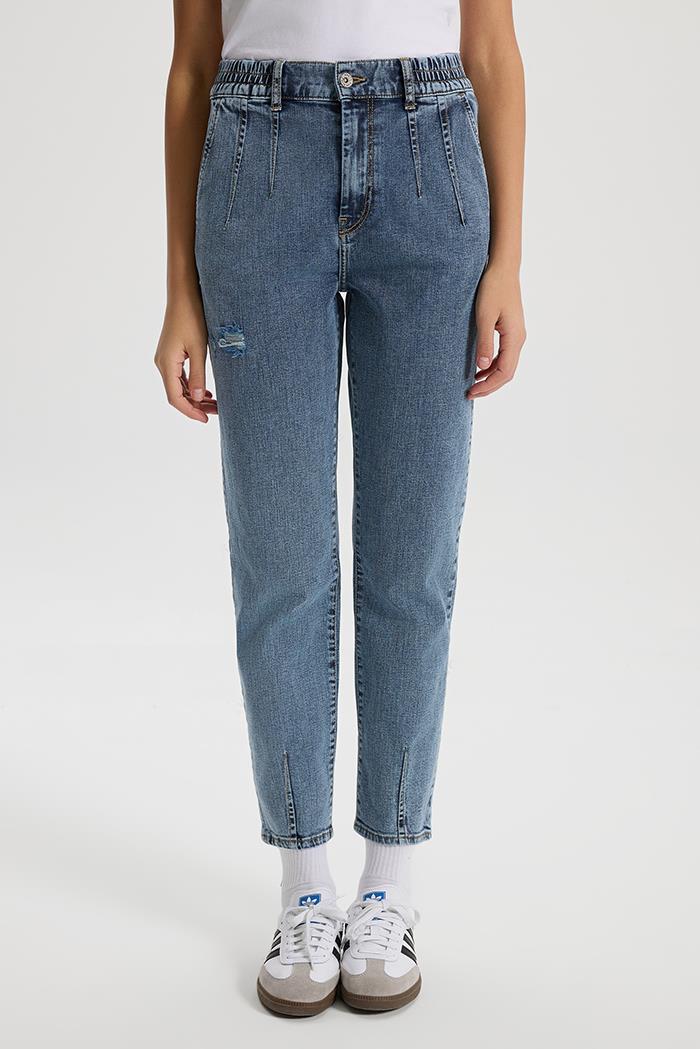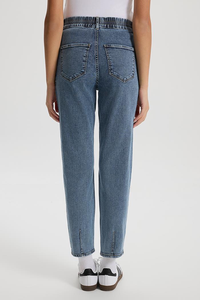 Beli Lastikli Yüksek Bel Slouchy Jean Pantolon: Rahat ve şık bir görünüm sunan yüksek bel tasarımı ve daralan paçalarıyla öne çıkar.