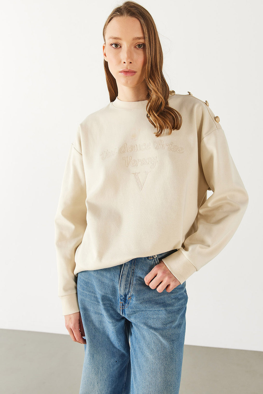 Kadın Omzu Düğme Detaylı Nakışlı Sweatshirt - Ekru