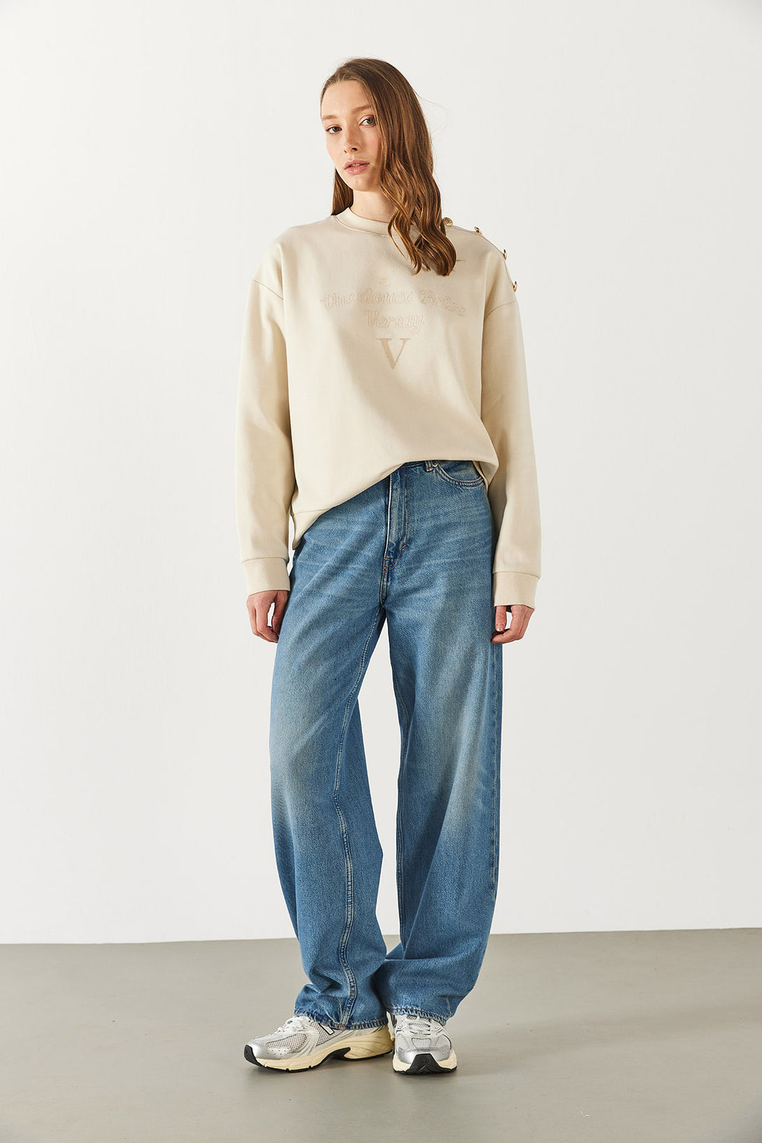 Omzu Düğme Detaylı Nakışlı Sweatshirt