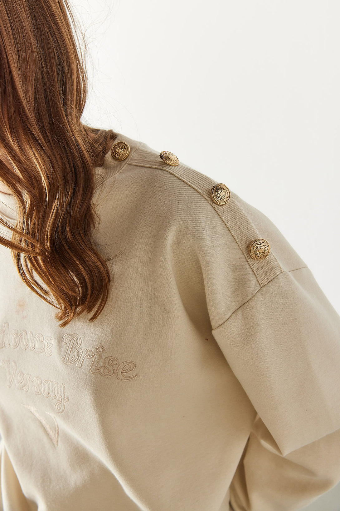 Omuz kısmındaki düğme detayları, sweatshirt'e şık bir dokunuş katar.
