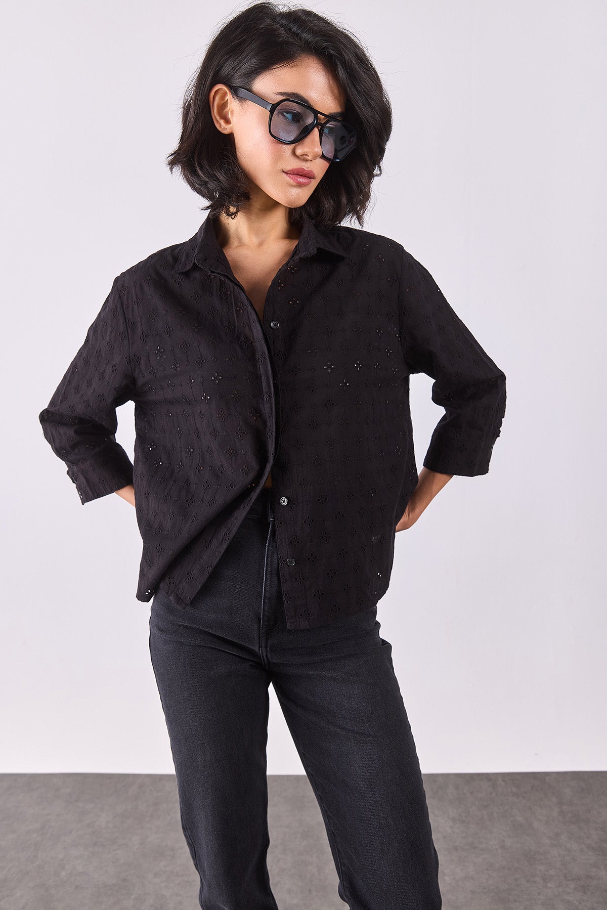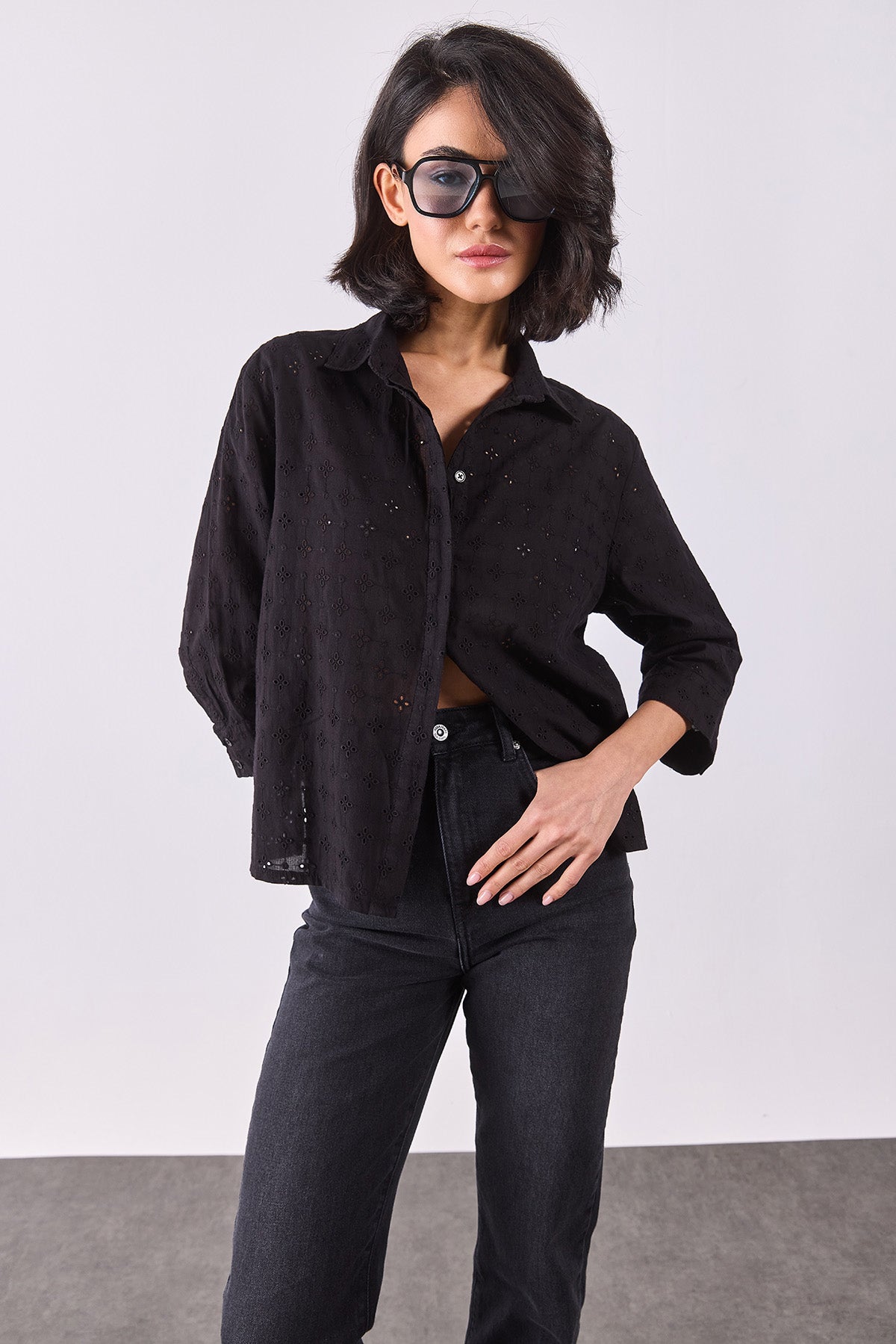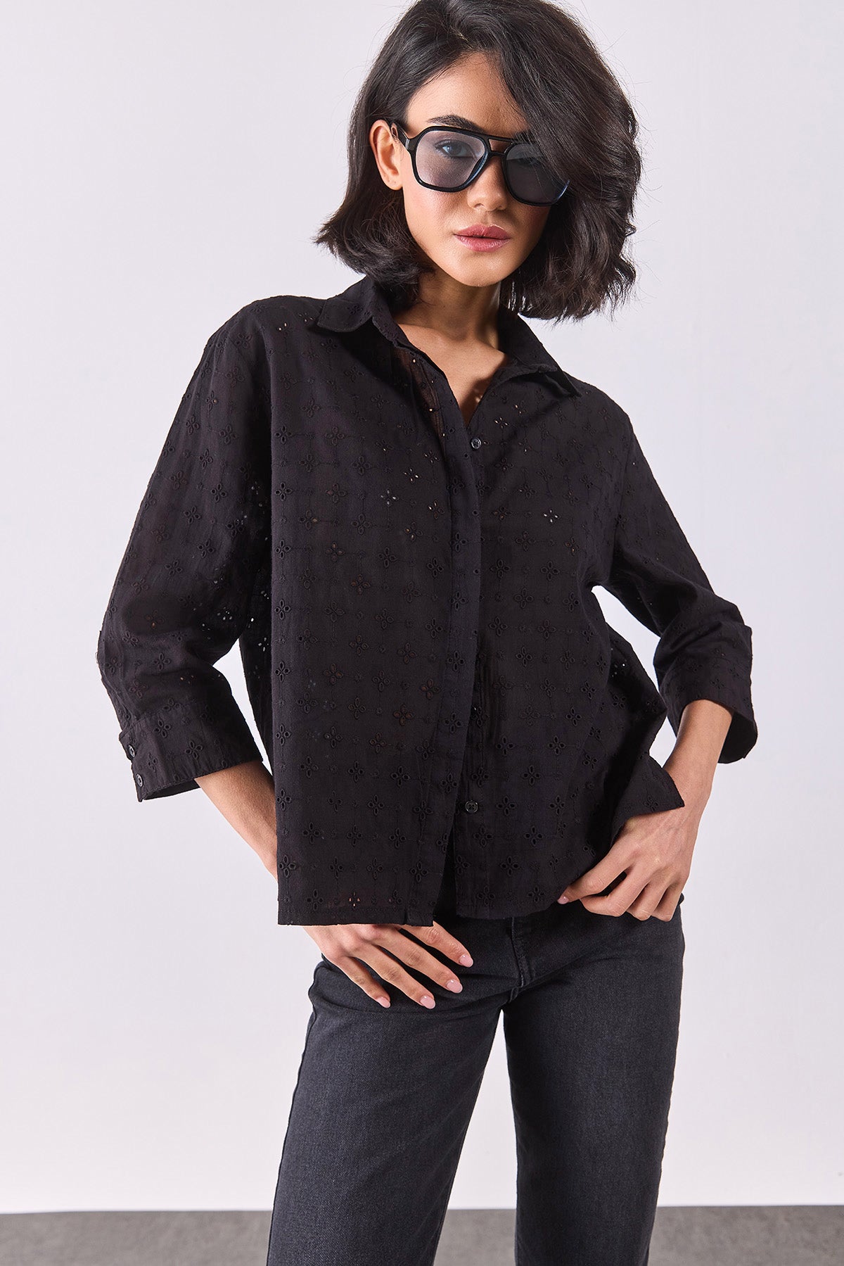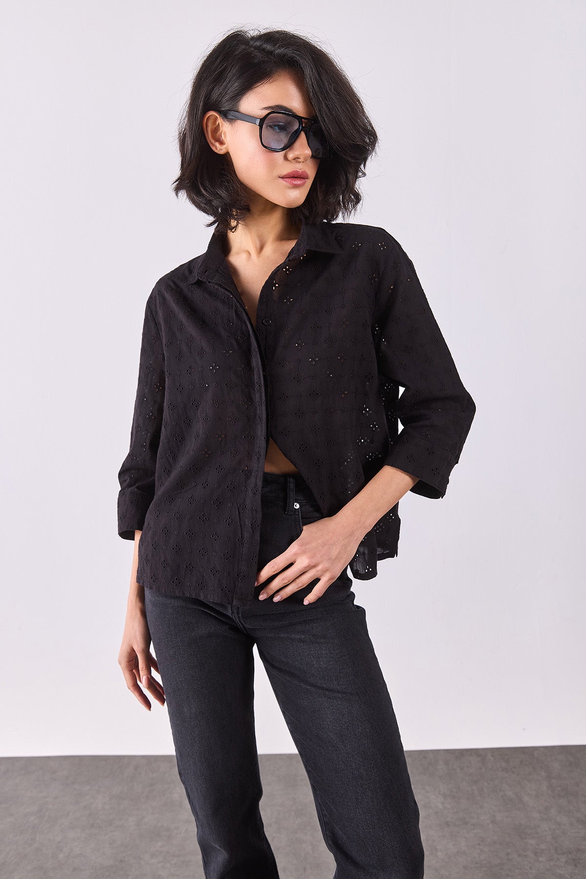 Kadın Önü Düğmeli İşlemeli Bluz - Siyah