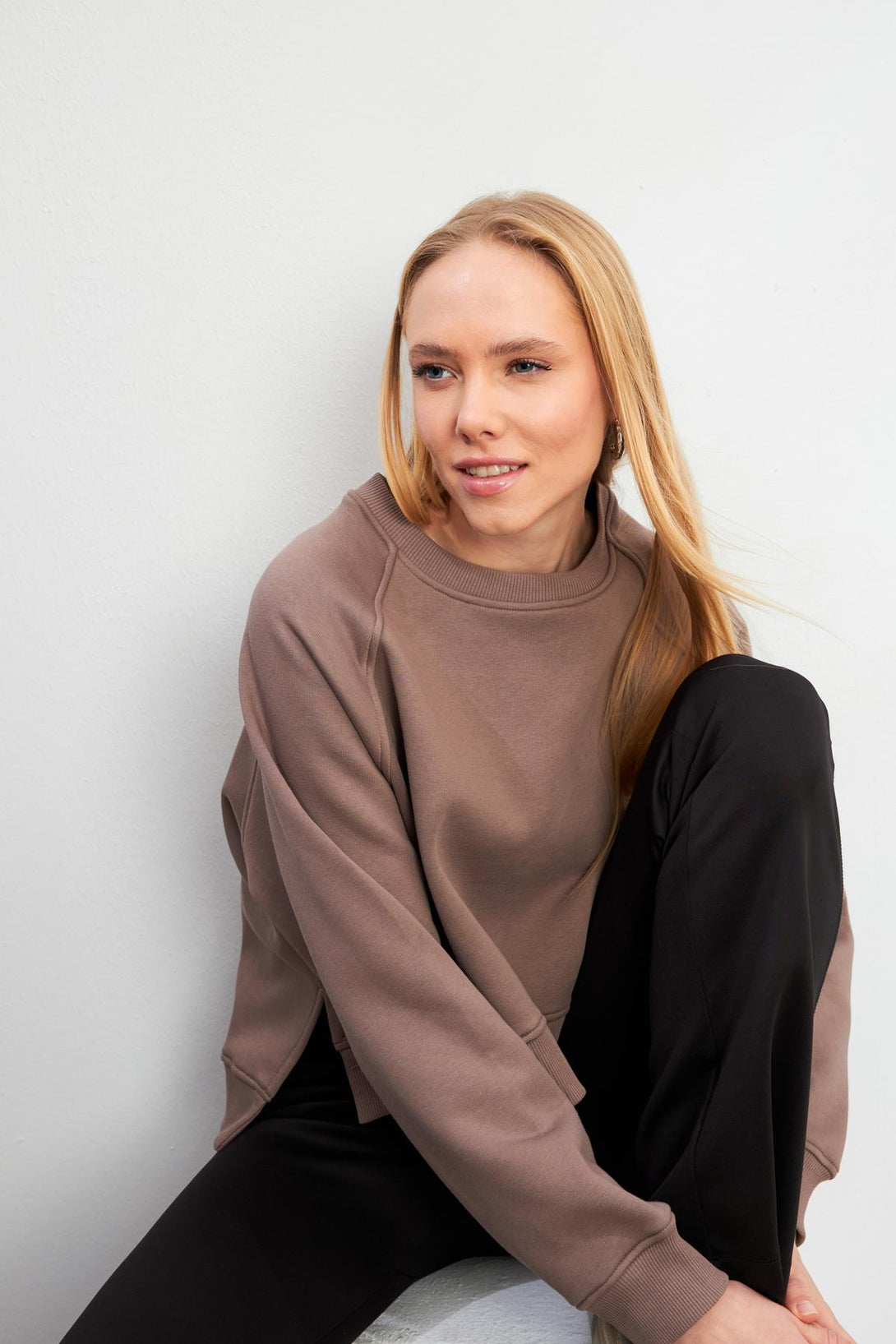 Kadın Önü Kısa Arkası Uzun Balon Kollu Sweatshirt - Vizon