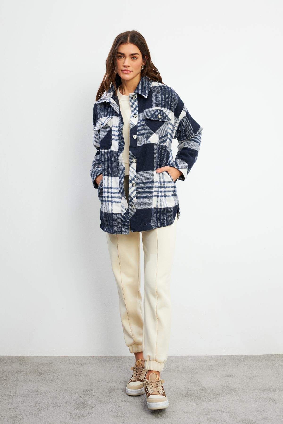Kadın Oversize Ekru-Siyah Ekose Gömlek Ceket