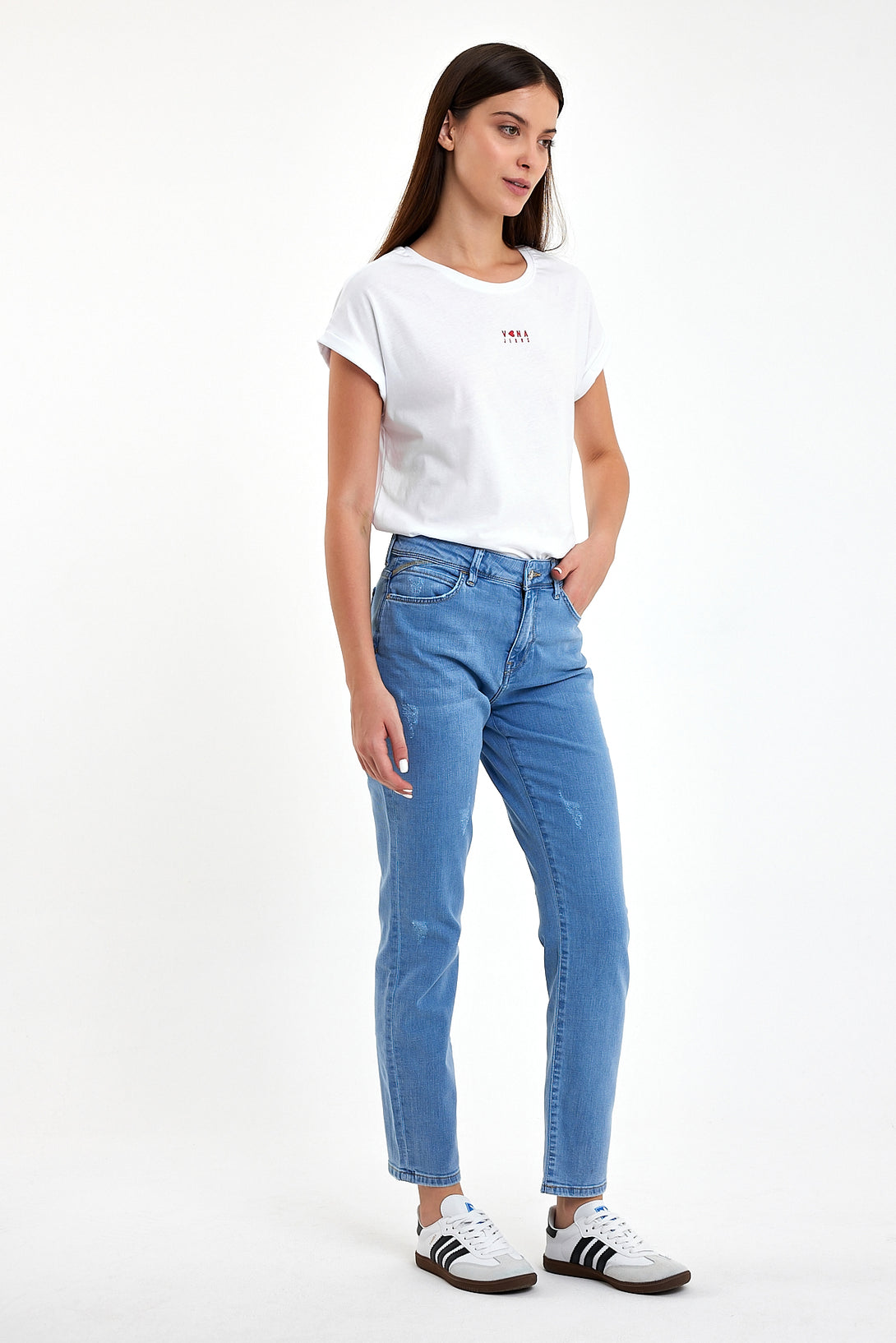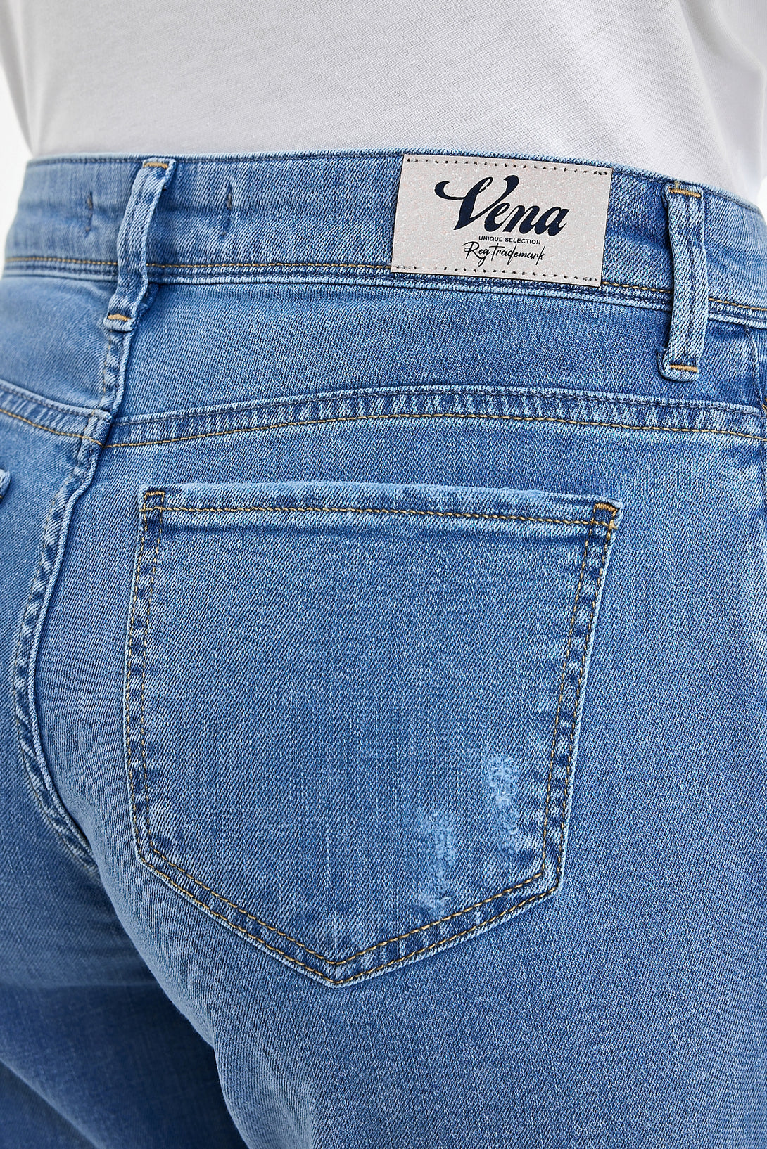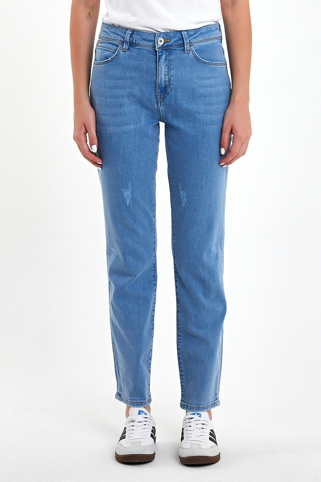 Orta bel, baseni baldırı hafif oturan daralan paça. Pamuk elastan kumaş içerikli Petra jean gün boyu konfor sağlar. Orta mavi yıkama rengi. Paça boyu bilek hizasında. Pantolon çift boy tasarlanmıştır, ölçülerinize uygun boyu tercih edebilirsiniz.