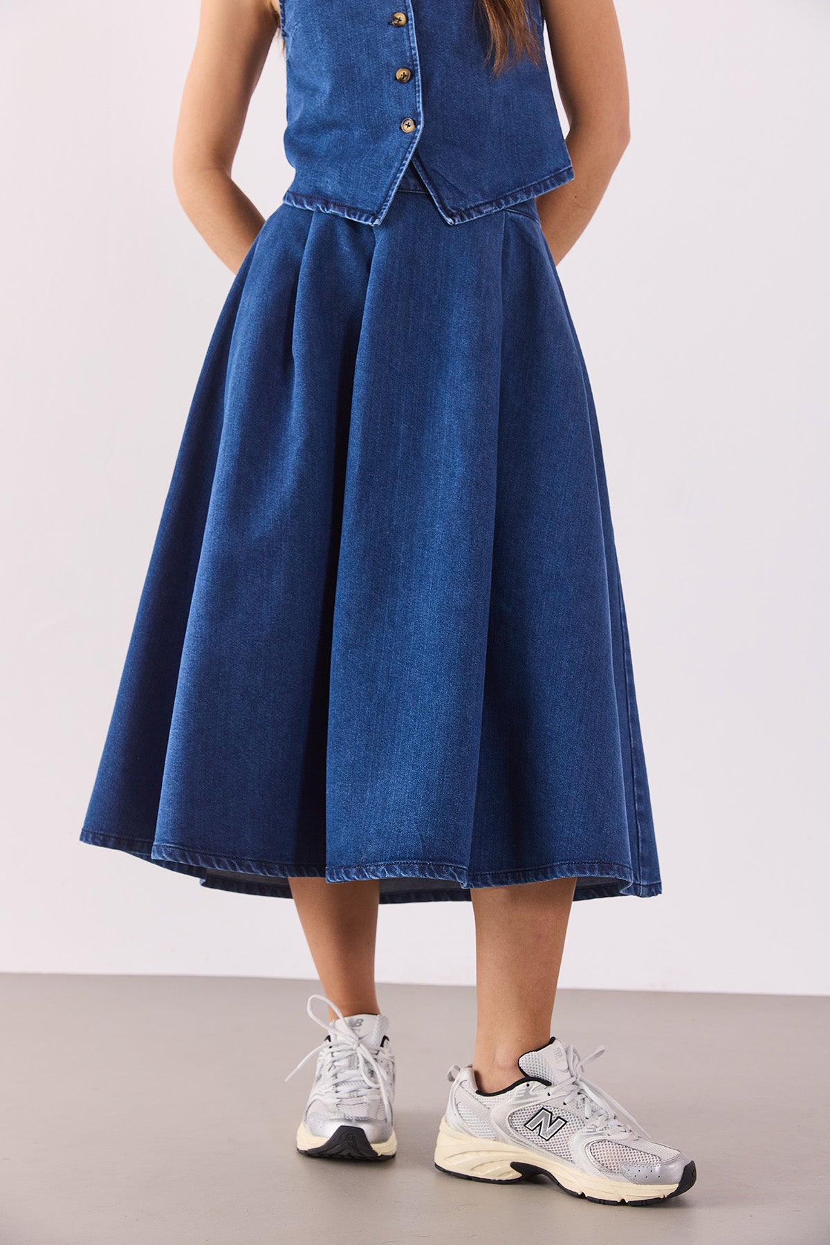 Kadın Pilili Kloş Lyocell Dark Blue Midi Boy Jean Etek - Dark Blue