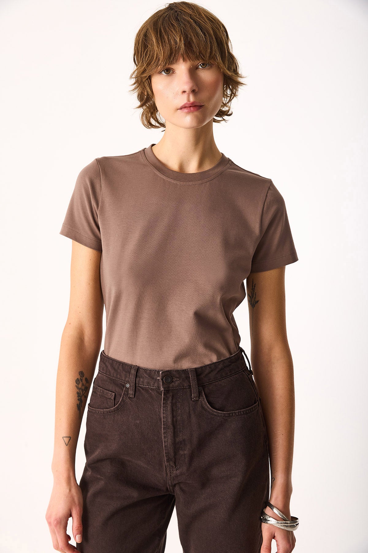 Kadın Rachel Bisiklet Yaka Slim Fit Basic Tişört - Vizon