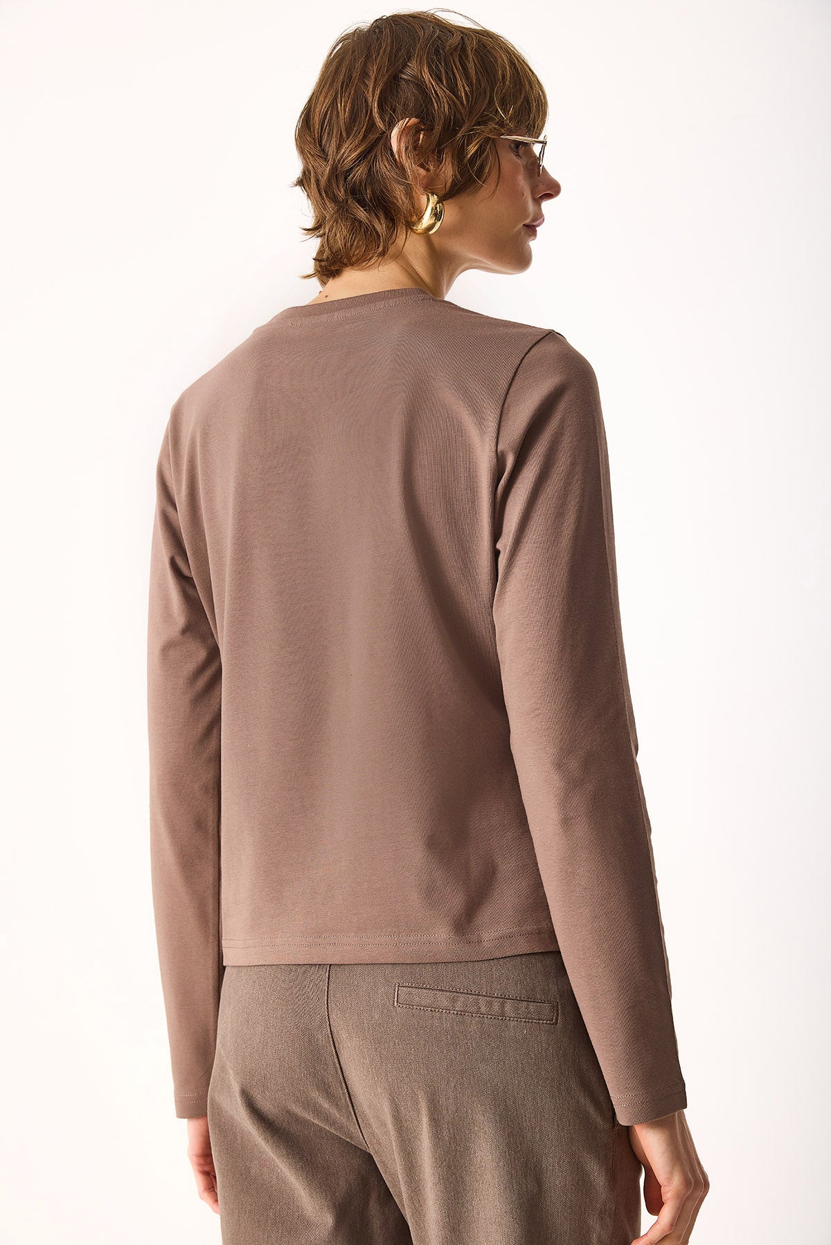 Kadın Rachel Bisiklet Yaka Slim Fit Basic Uzun Kollu Tişört - Vizon