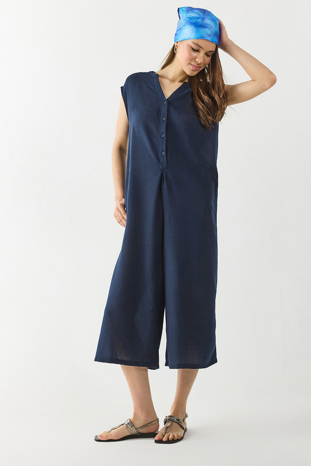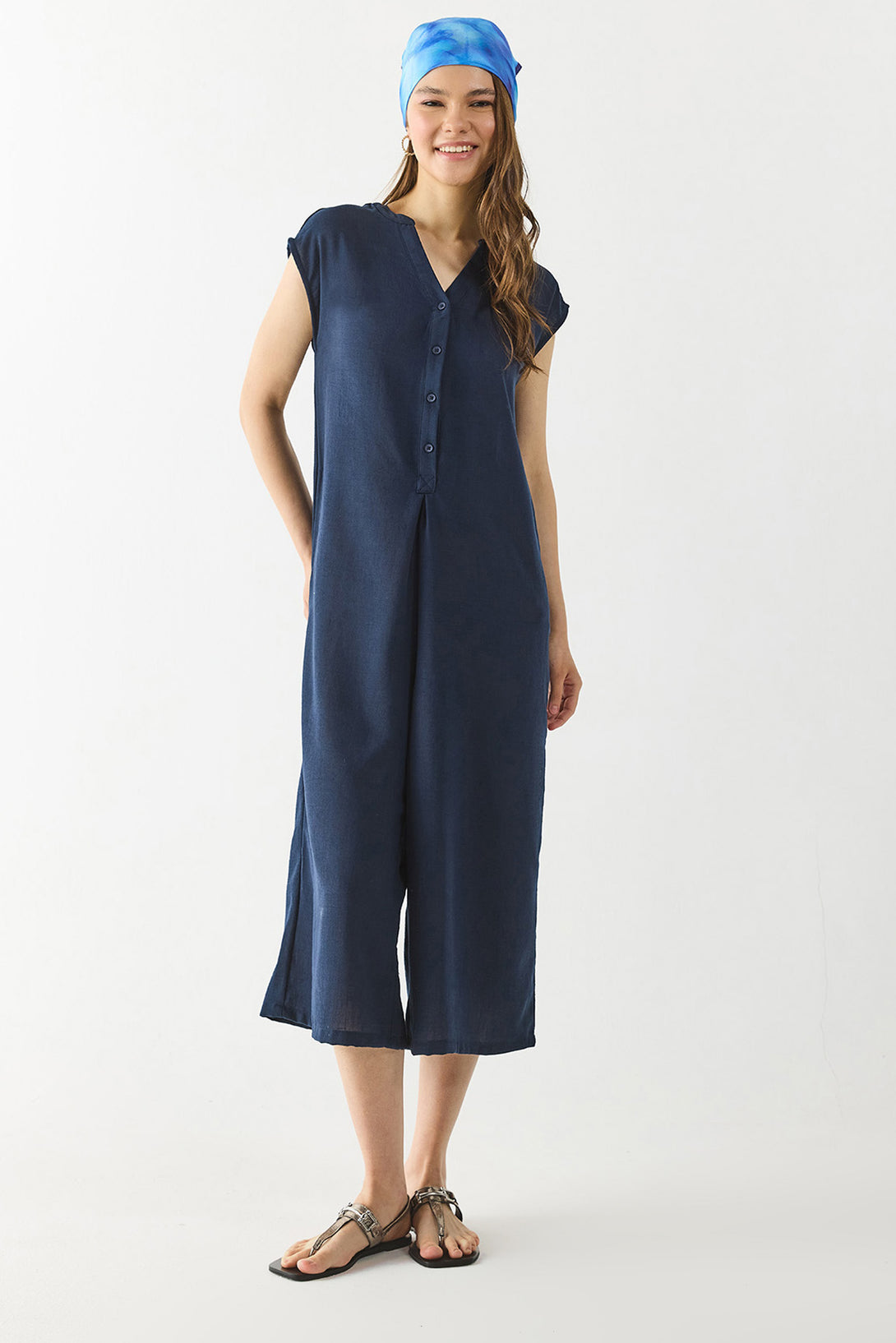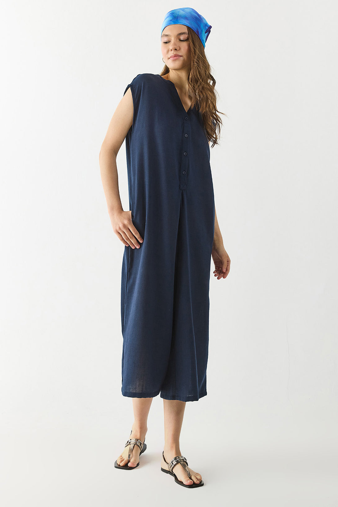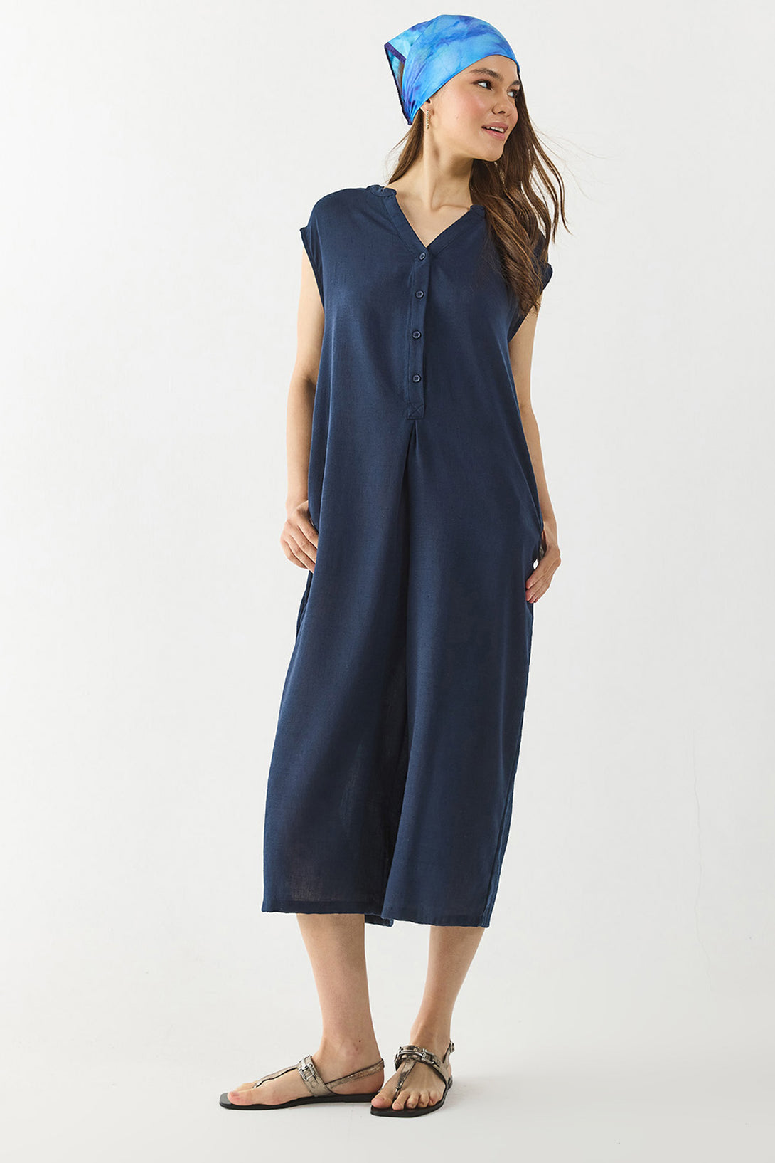 Vena'nın ilkbahar yaz koleksiyonundan Rahat Form Tulum. Önü düğmeli. Kısa paça. Kolsuz. V Yaka. Geniş kalıbı sayesinde günlük kombinlerinizin vazgeçilmez parçası olacak.