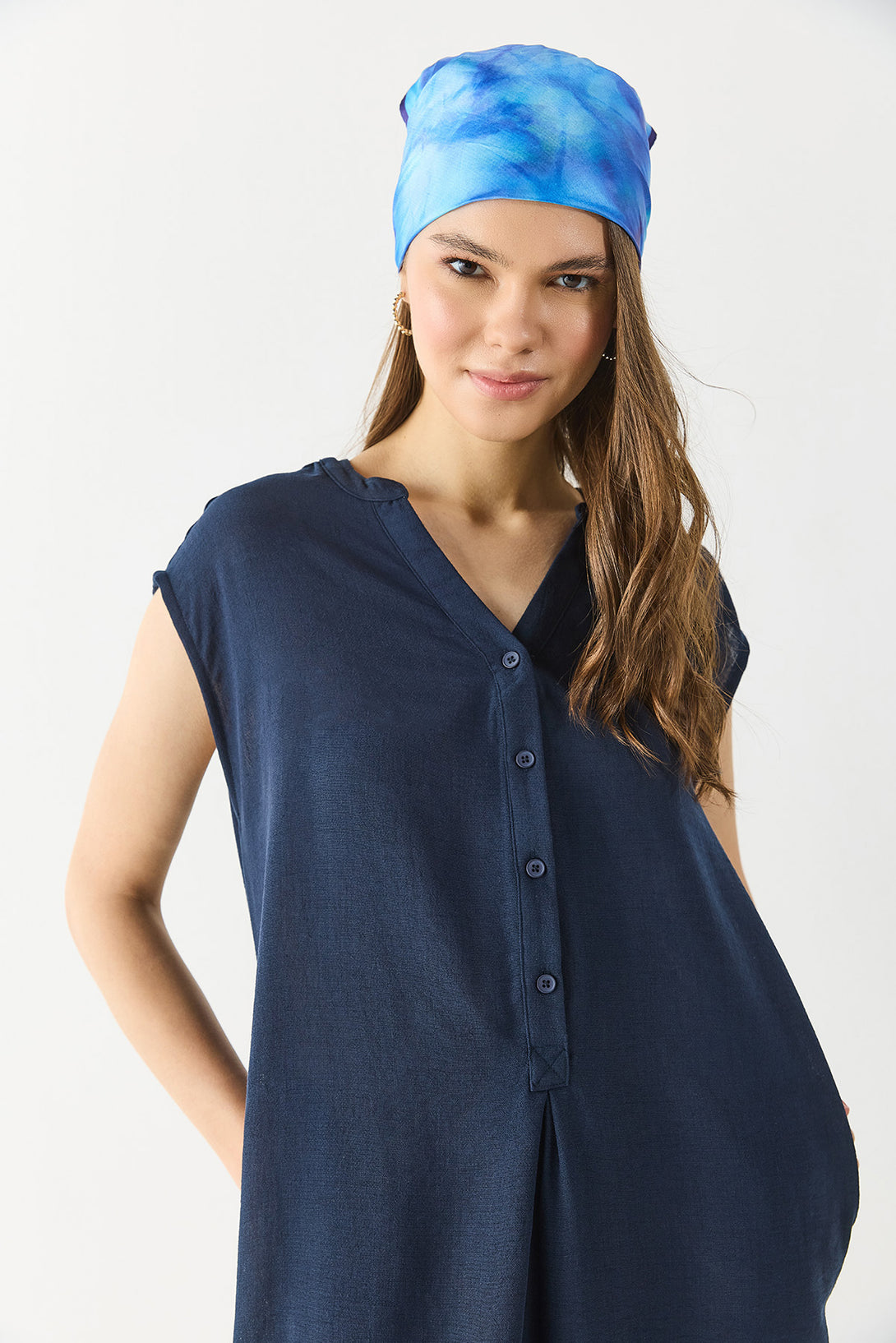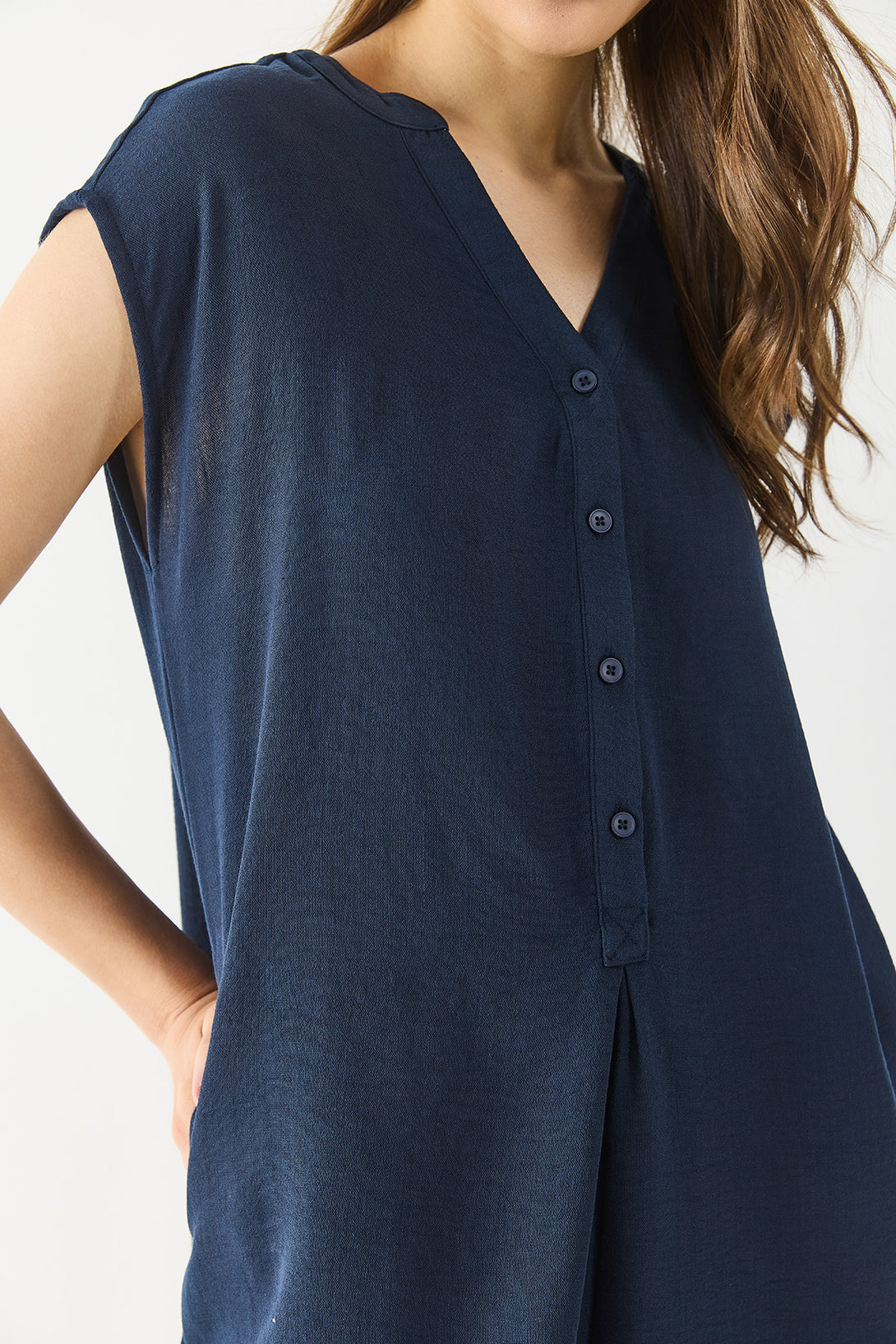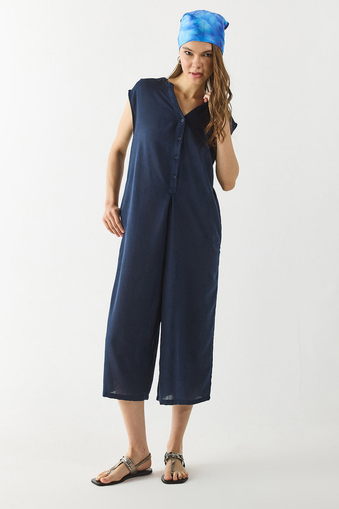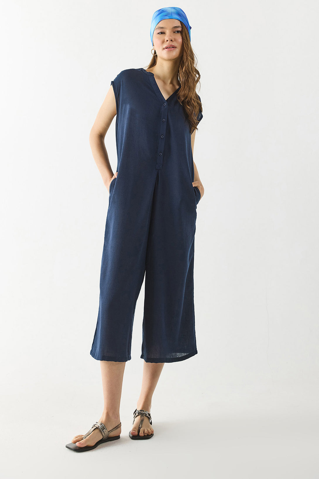 Vena'nın ilkbahar yaz koleksiyonundan Rahat Form Tulum. Önü düğmeli. Kısa paça. Kolsuz. V Yaka. Geniş kalıbı sayesinde günlük kombinlerinizin vazgeçilmez parçası olacak.