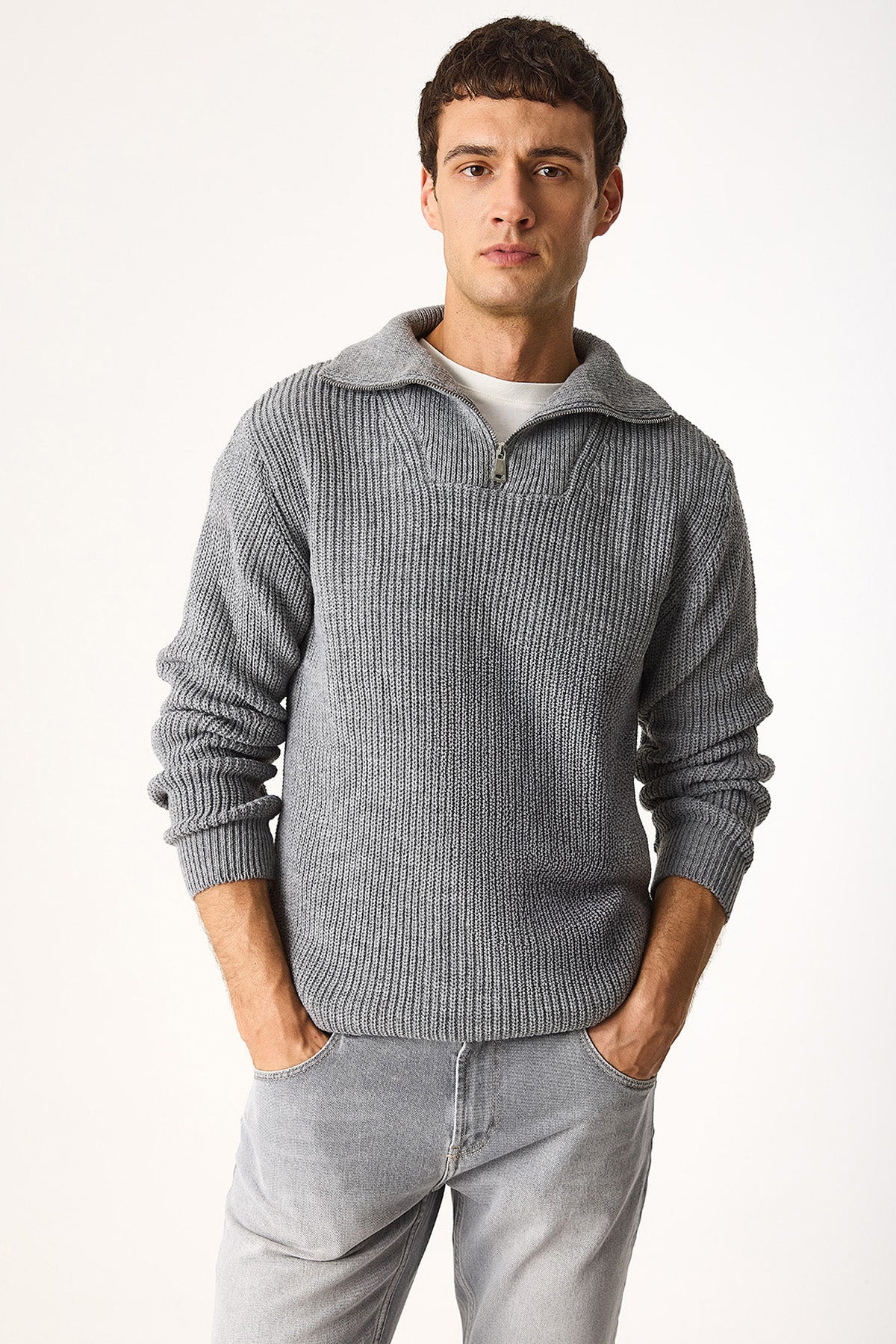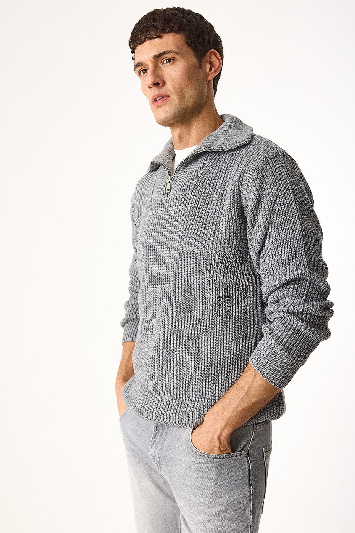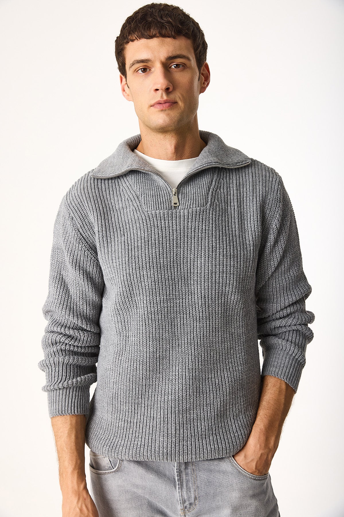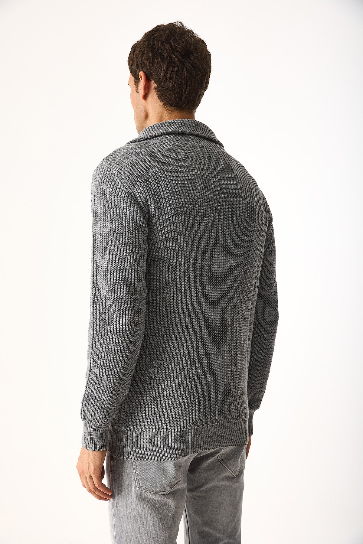 Erkek Regular Fit Dik Yaka Yarım Fermuarlı Triko Kazak - Antrasit