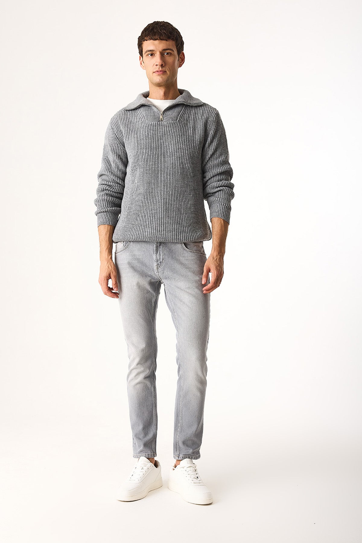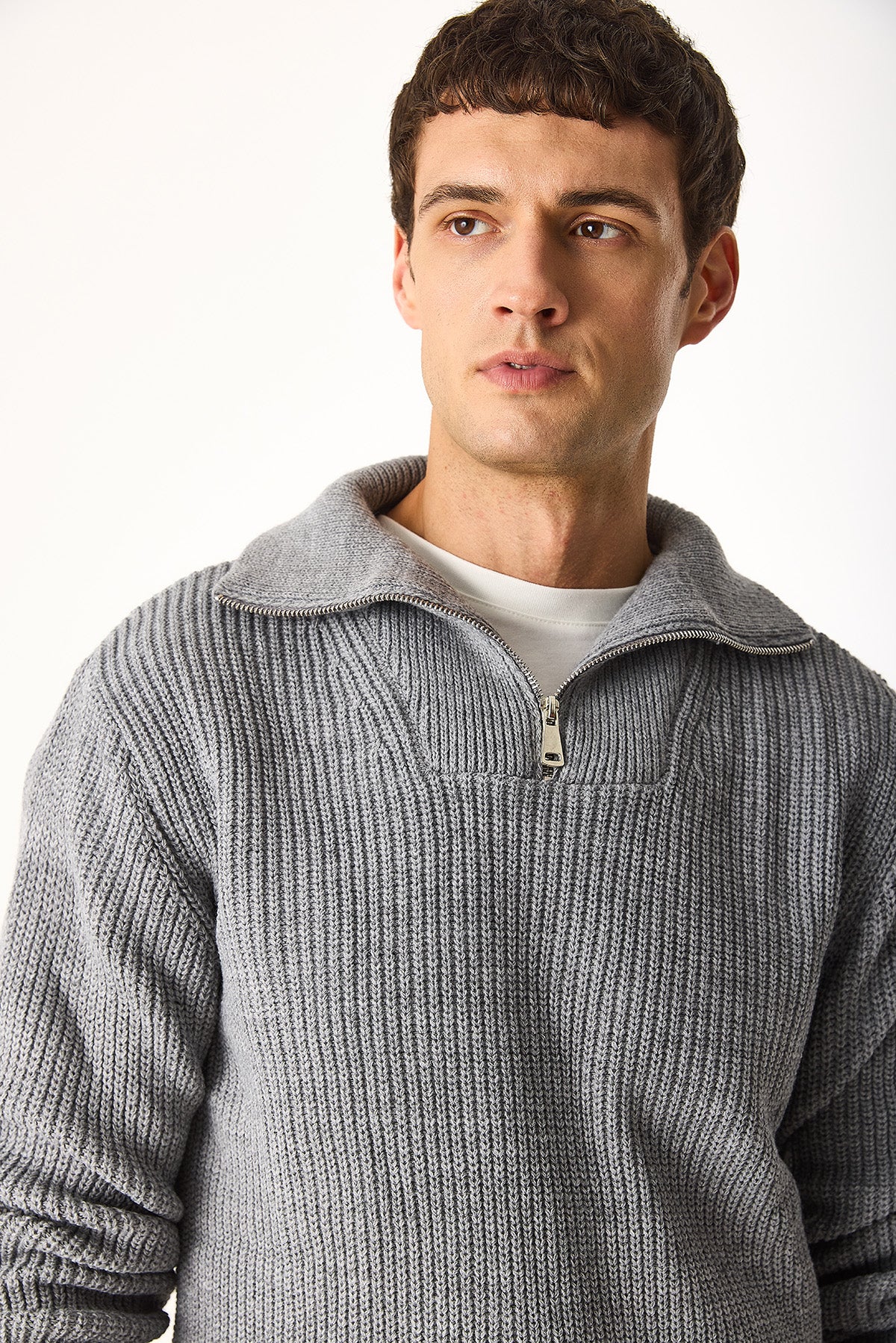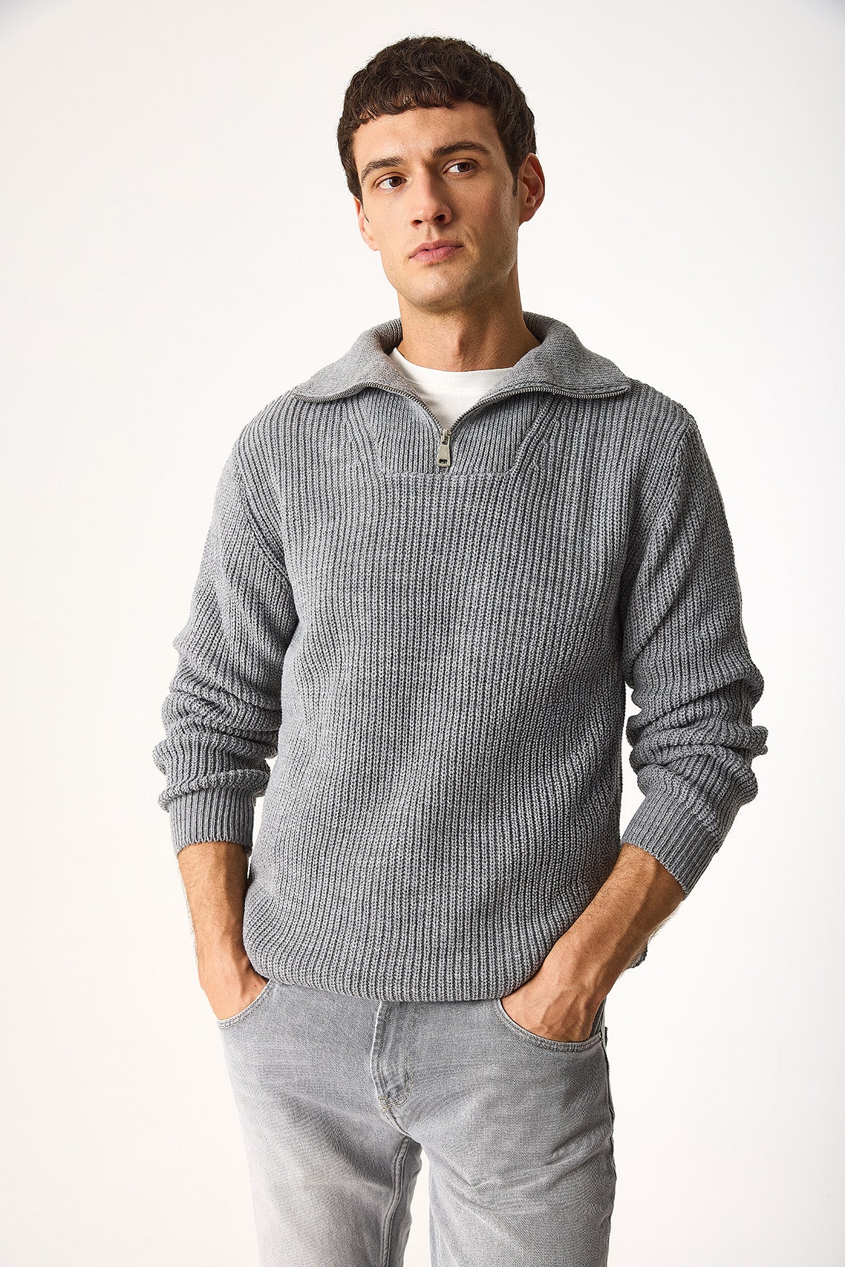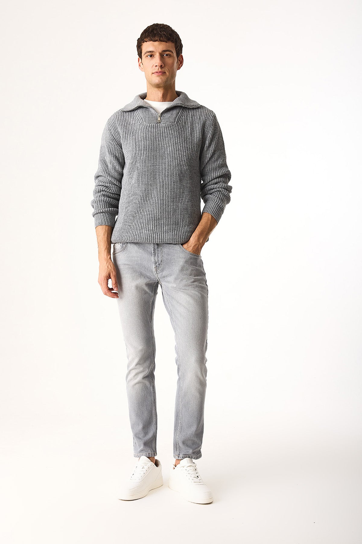 Erkek Regular Fit Dik Yaka Yarım Fermuarlı Triko Kazak - Antrasit