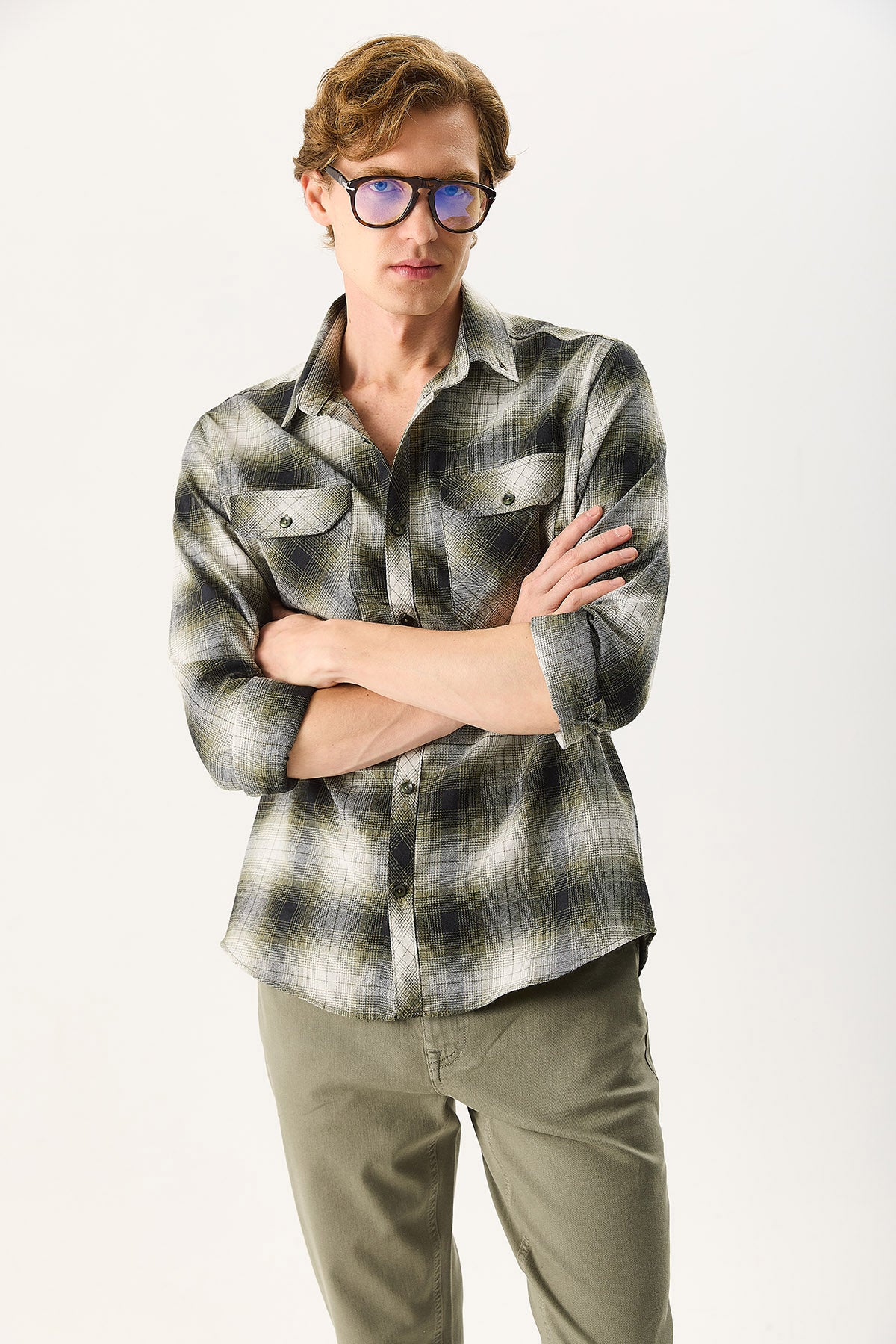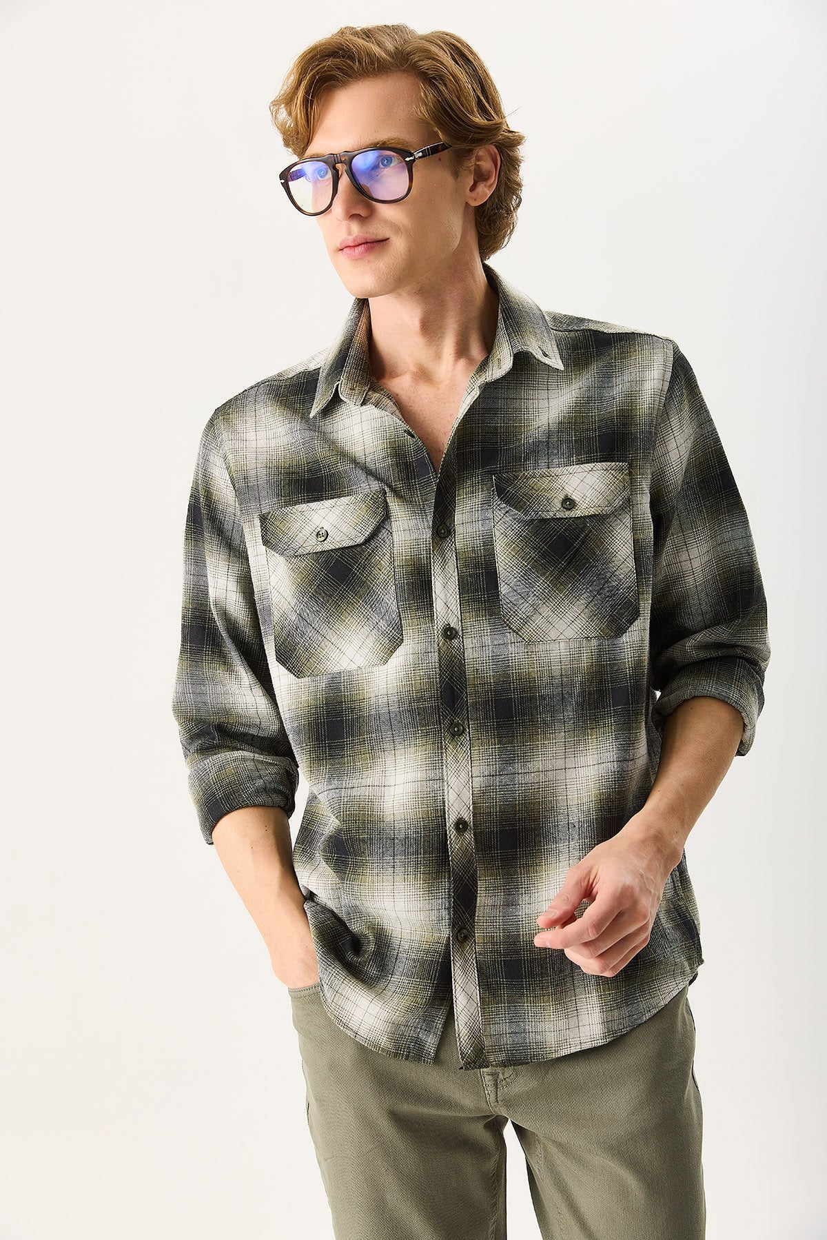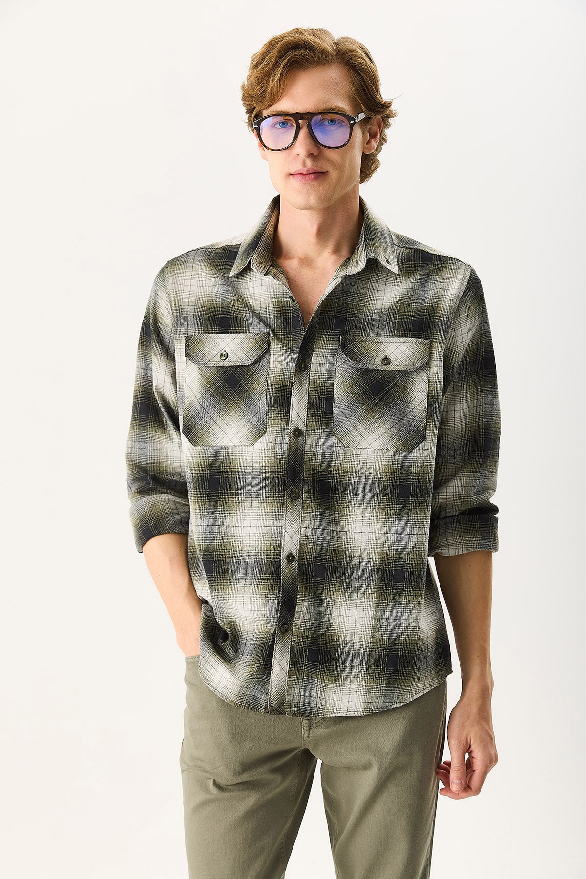 Erkek Regular Fit Kapaklı Cepli Ekose Gömlek - Haki