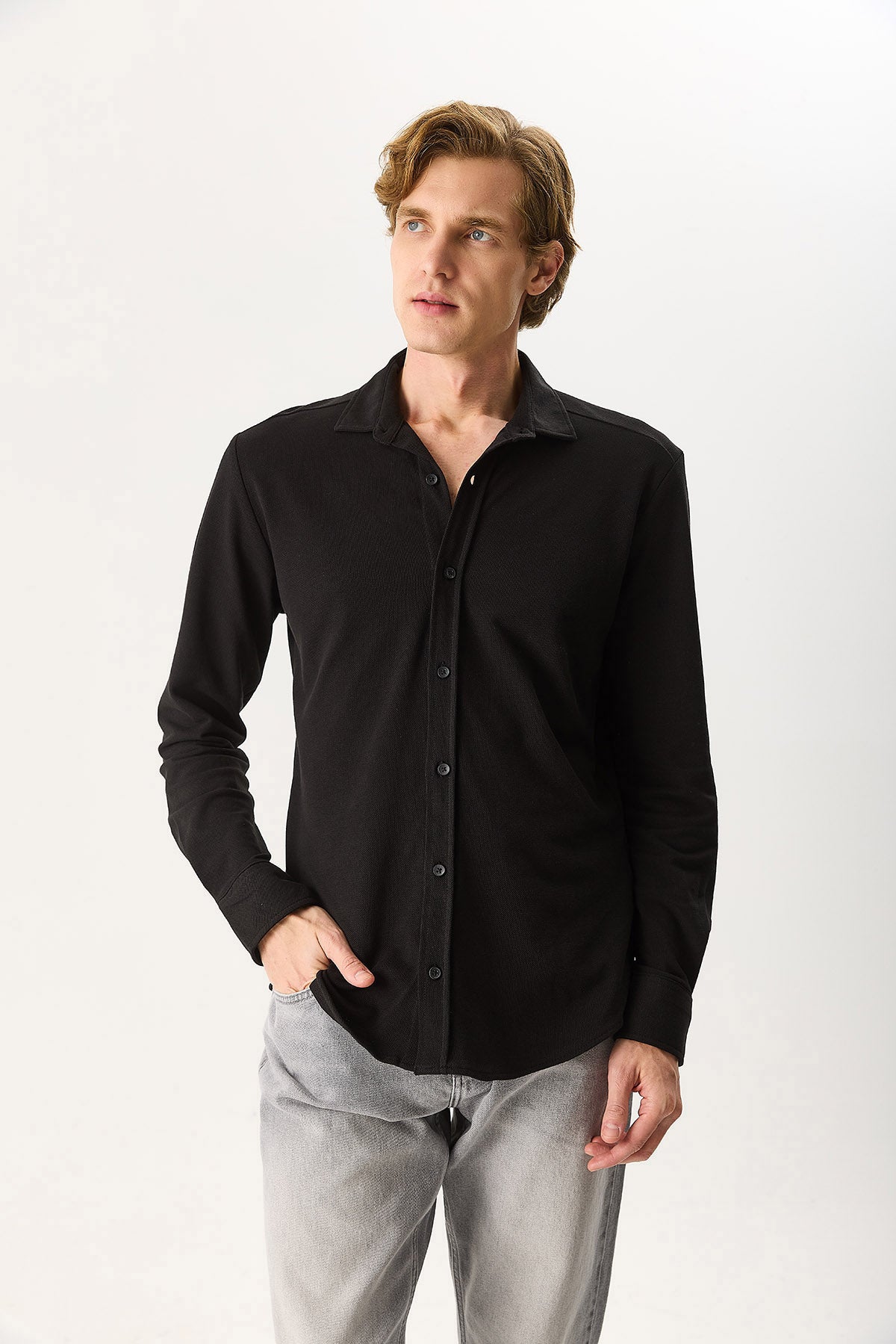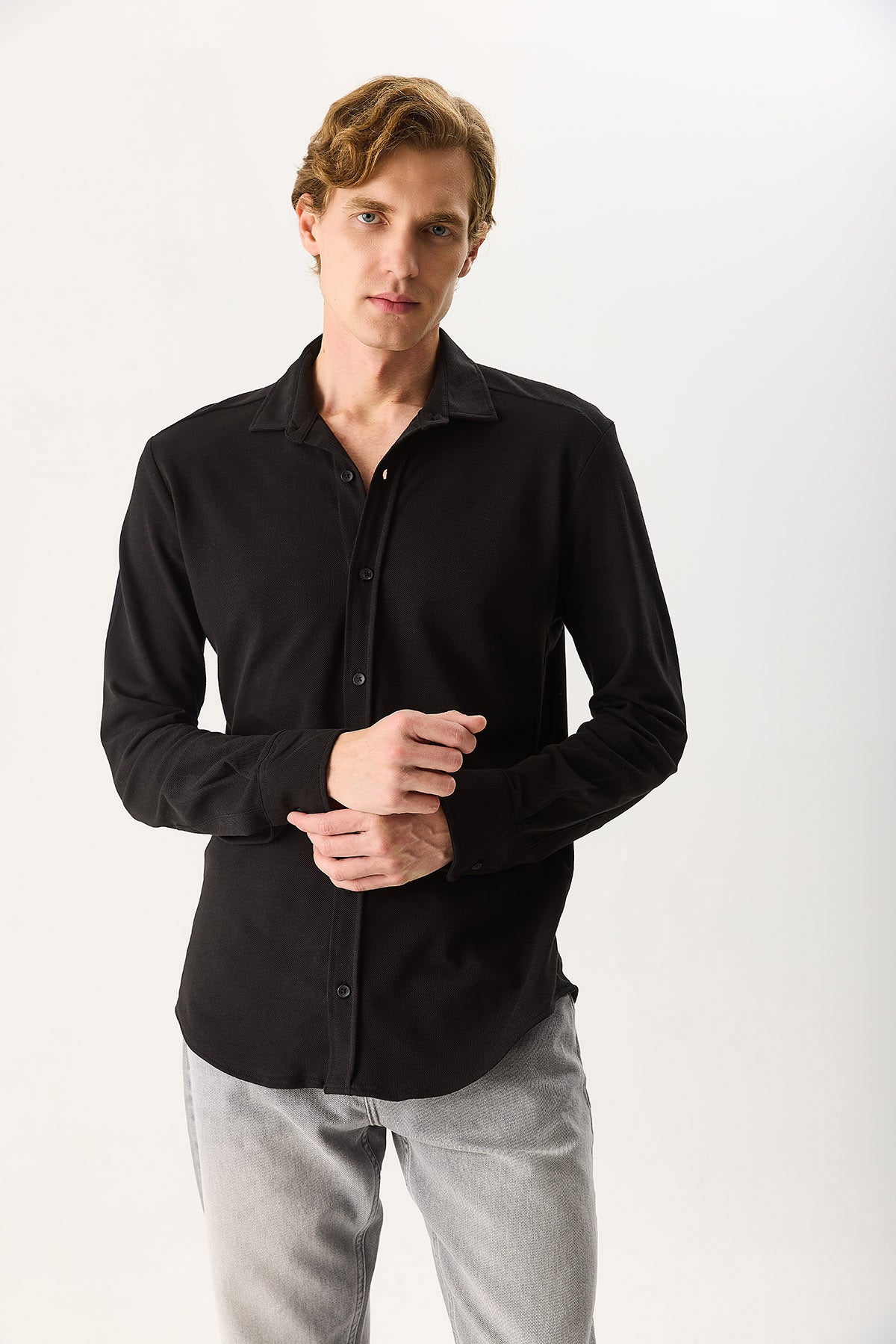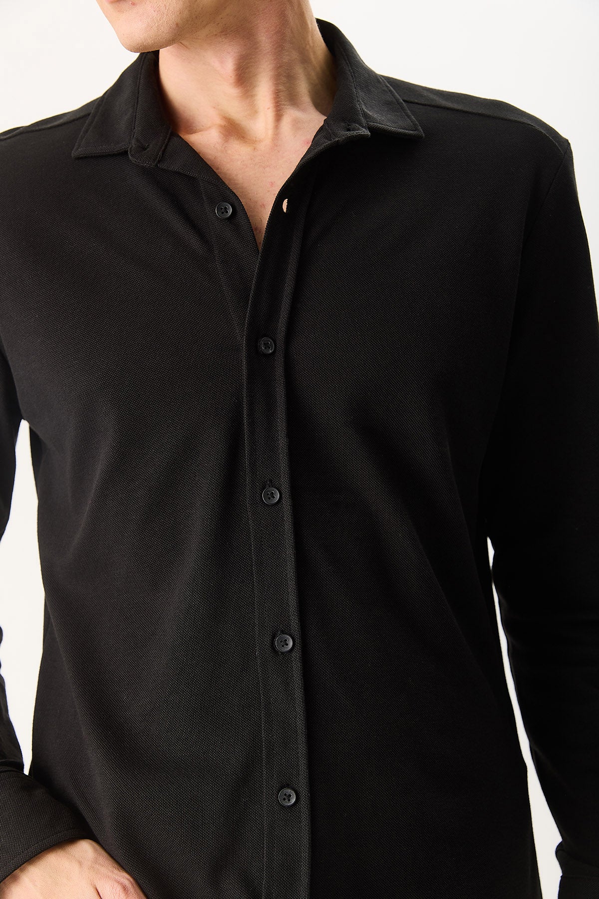 Erkek Regular Fit Pike Örme Gömlek %100 Pamuk - Siyah