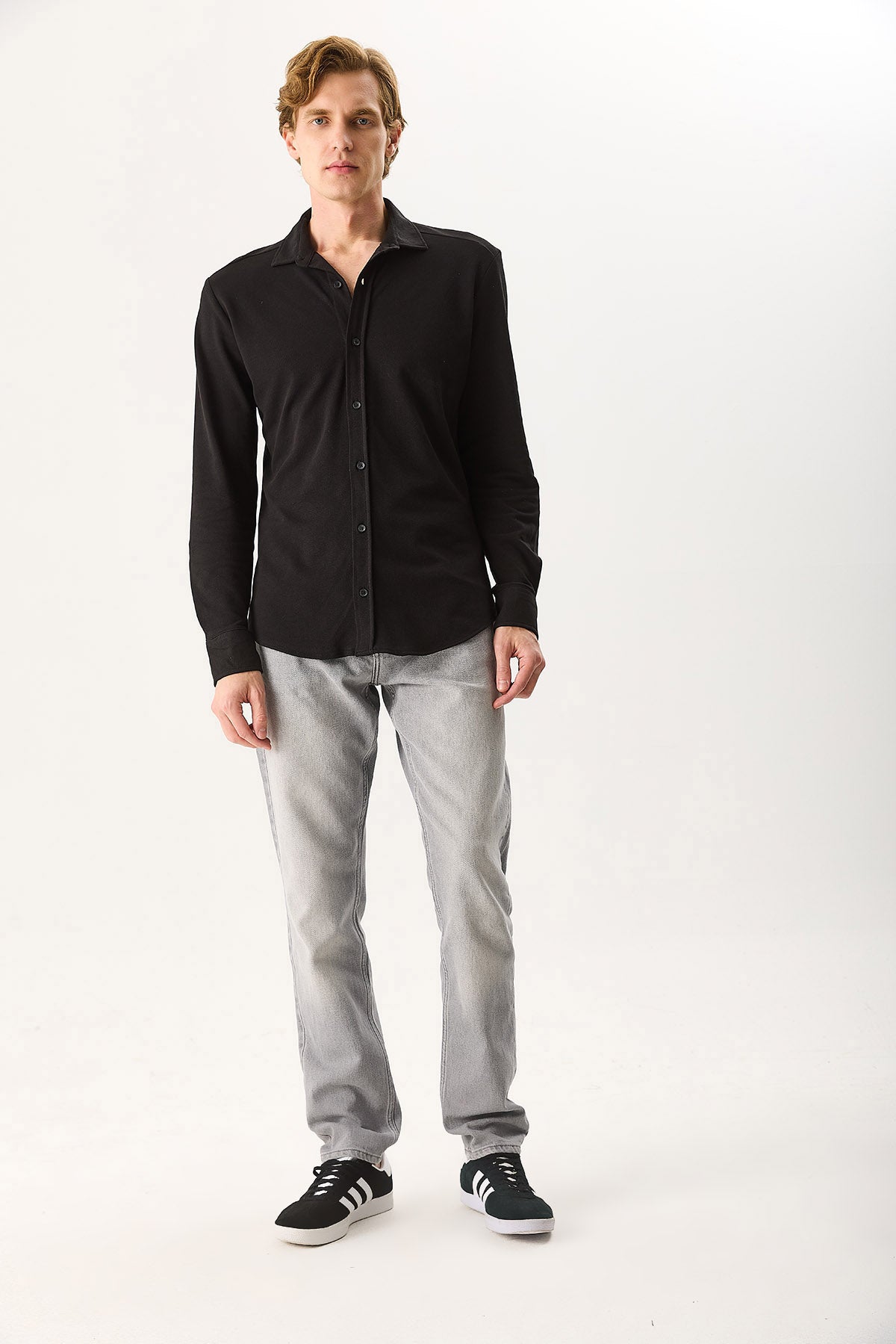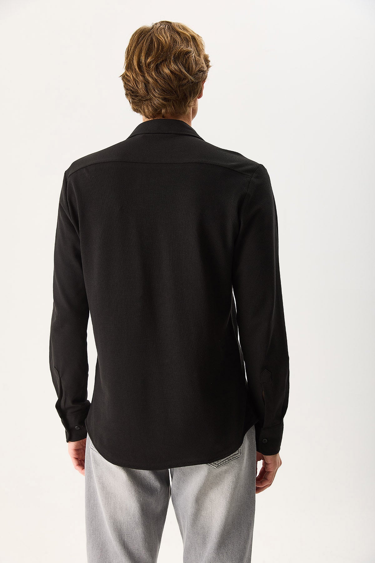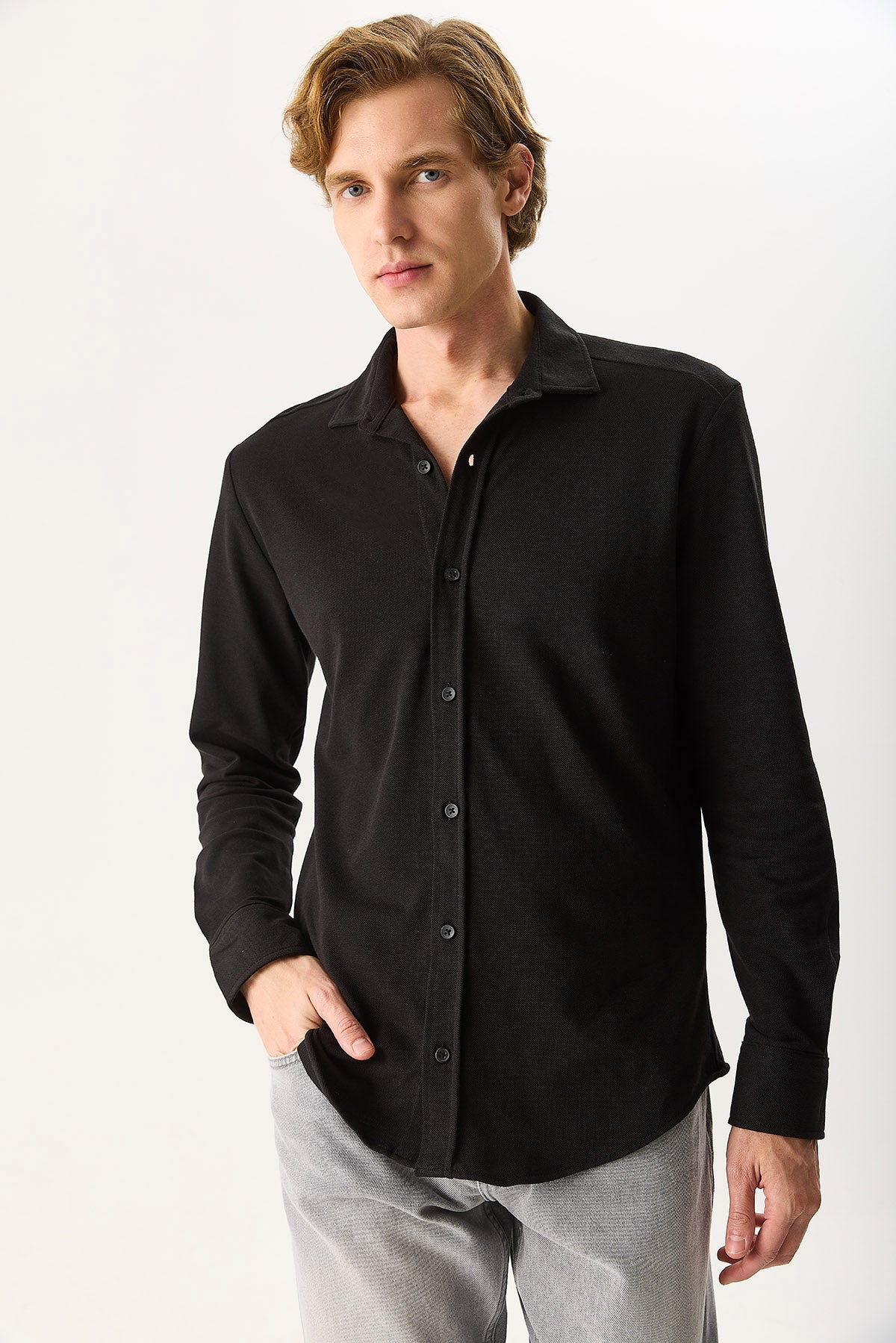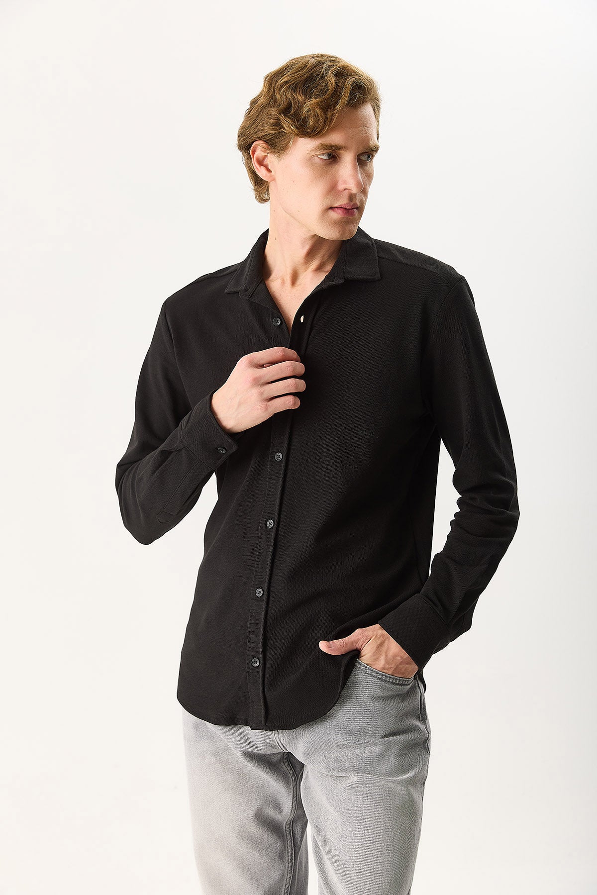 Erkek Regular Fit Pike Örme Gömlek %100 Pamuk - Siyah