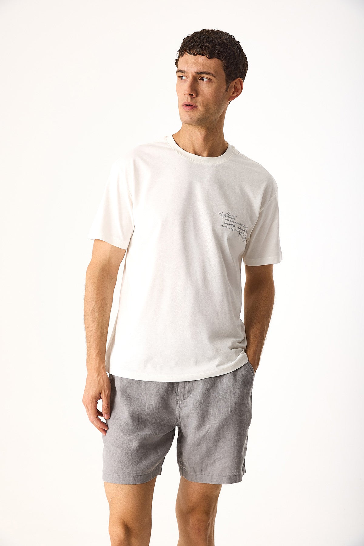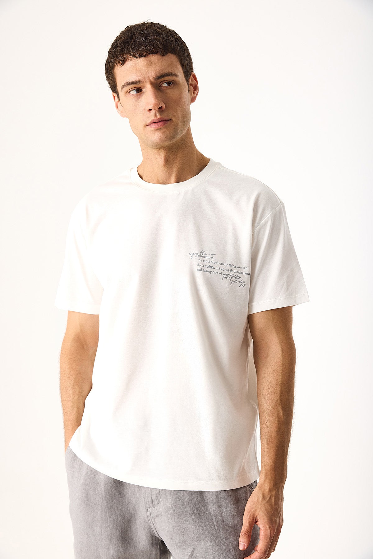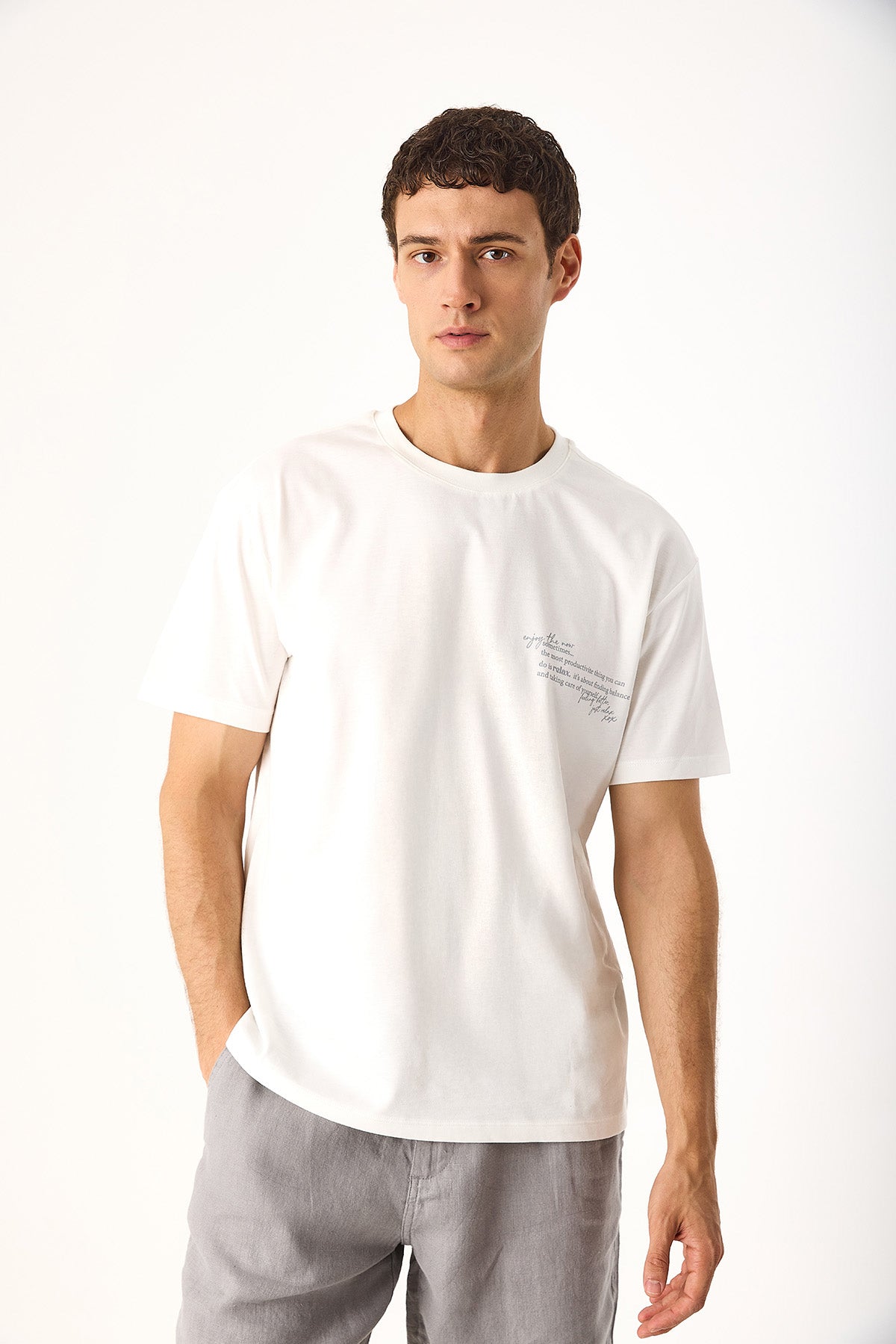 Erkek Relax Bisiklet Yaka Baskılı Regular Fit Tişört %100 Pamuk - Fildişi