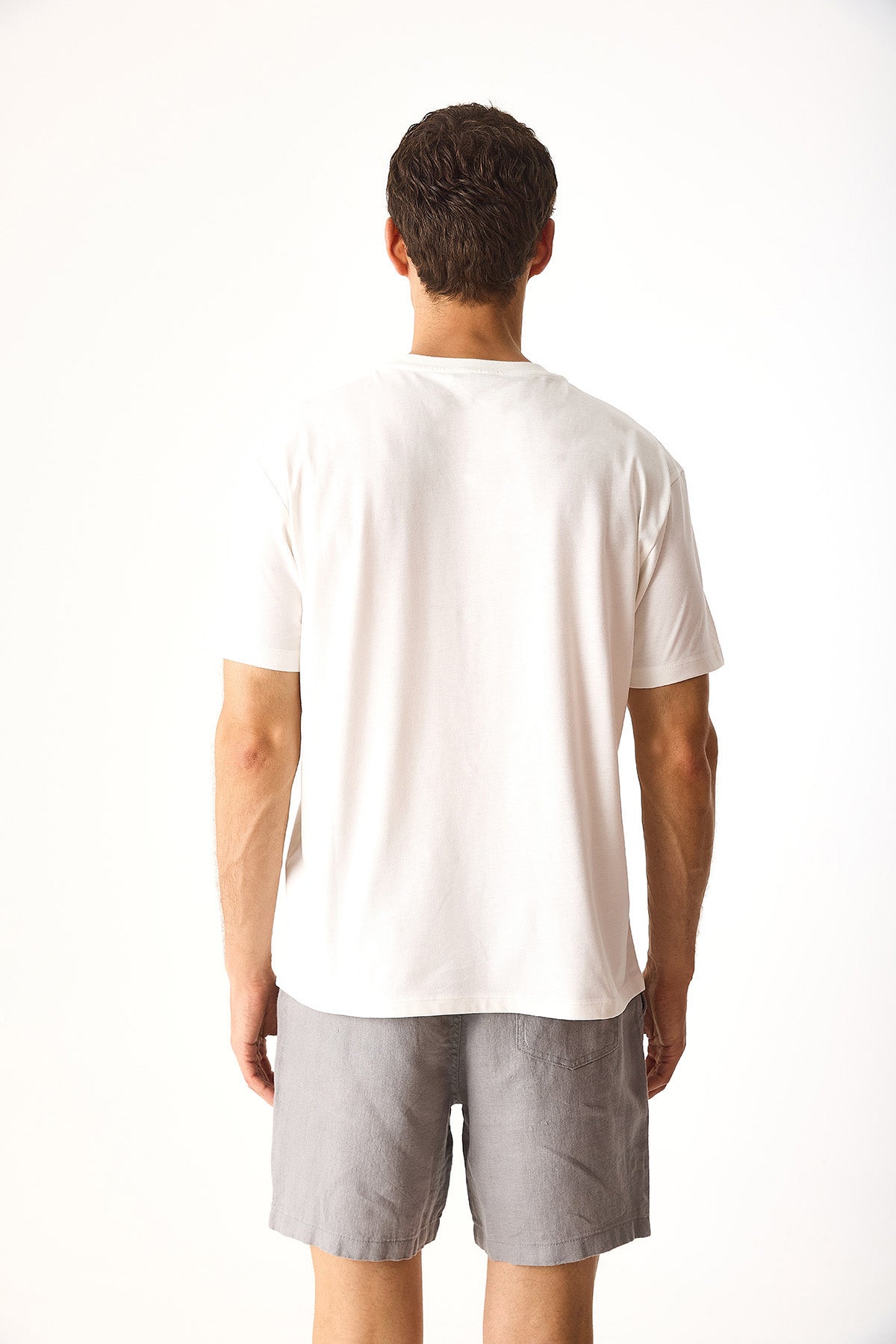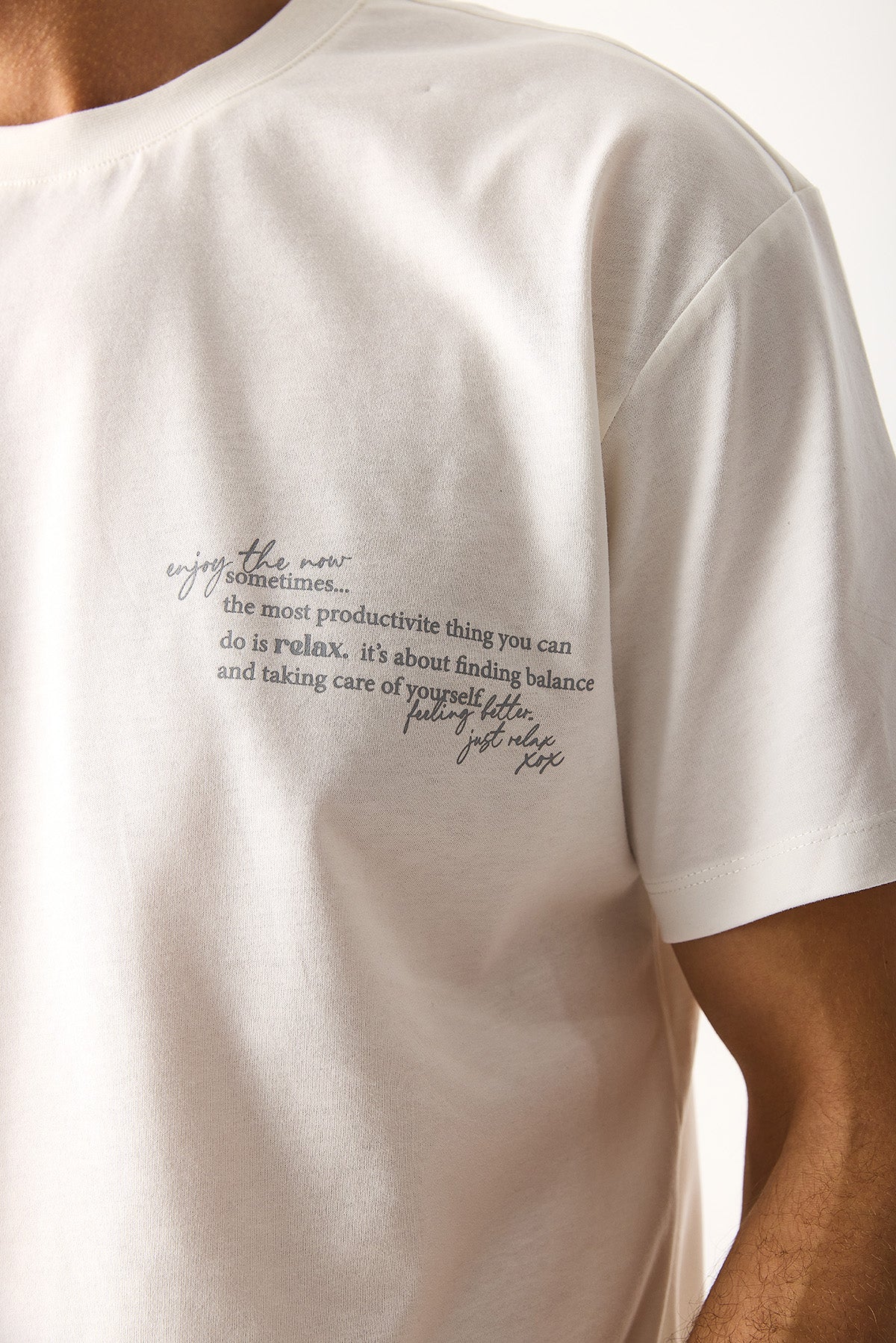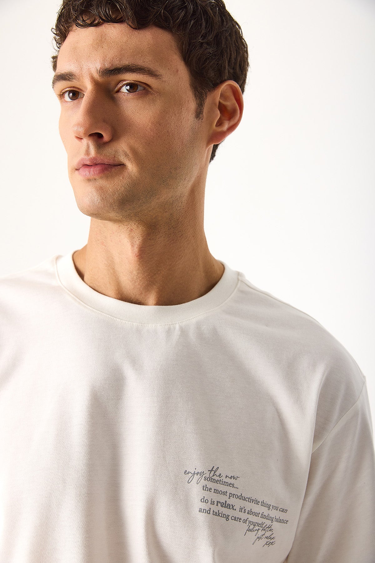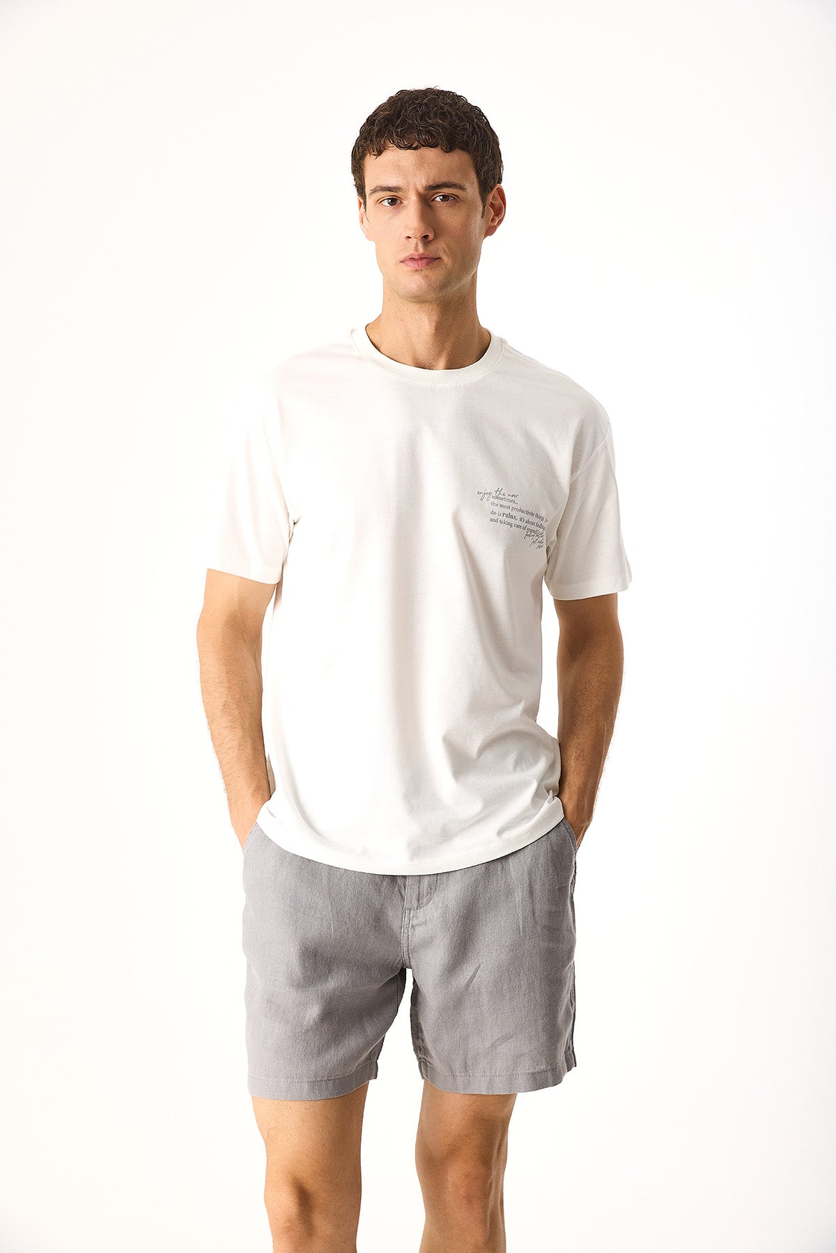Erkek Relax Bisiklet Yaka Baskılı Regular Fit Tişört %100 Pamuk - Fildişi