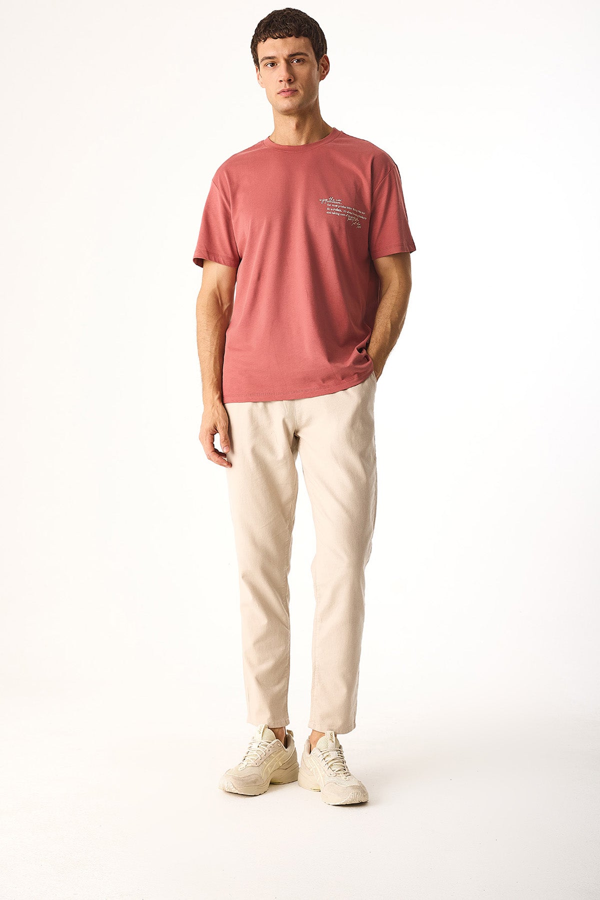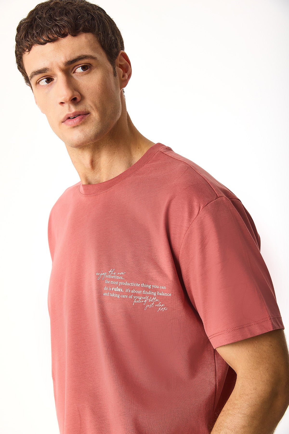 Erkek Relax Bisiklet Yaka Baskılı Regular Fit Tişört %100 Pamuk - Kiremit