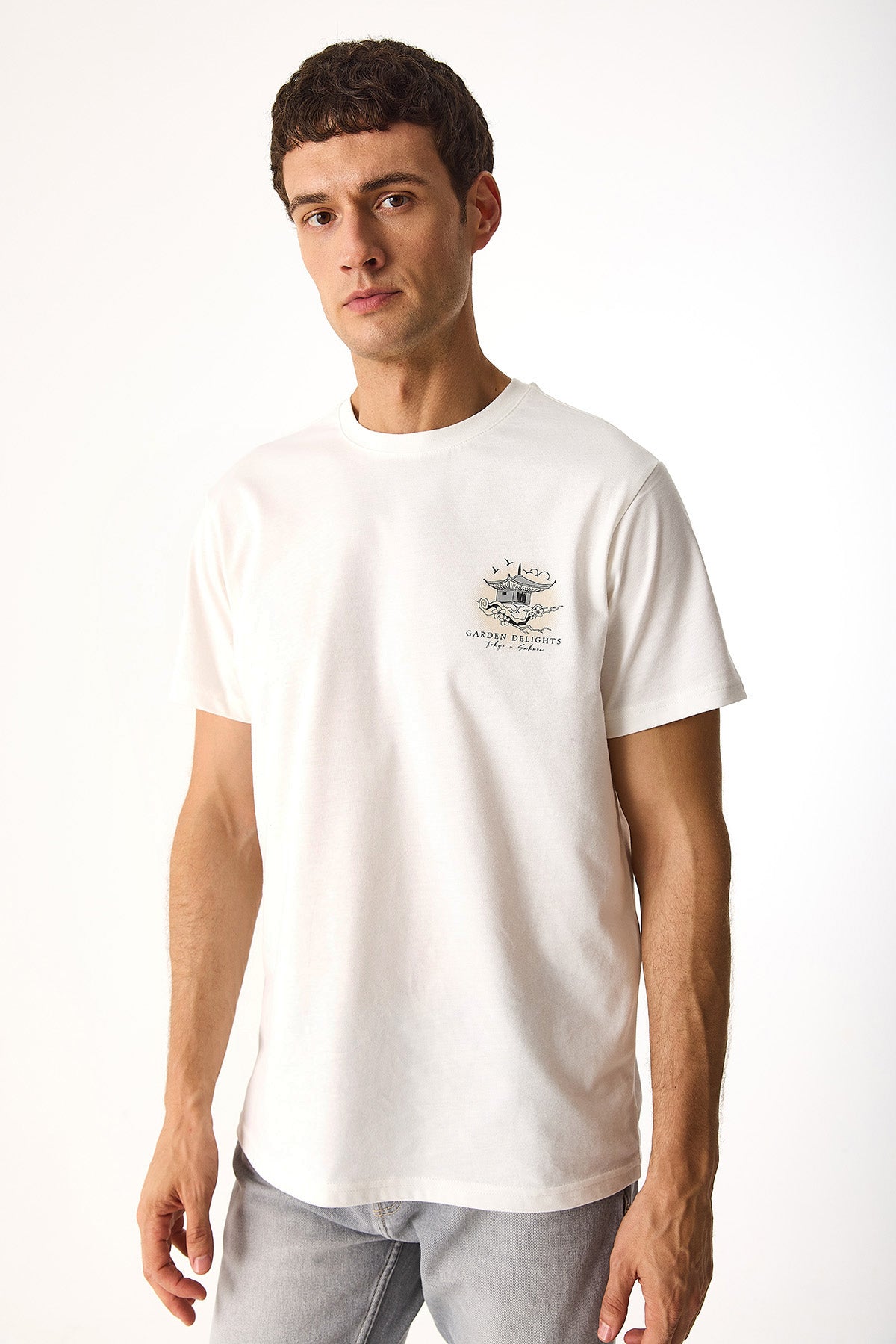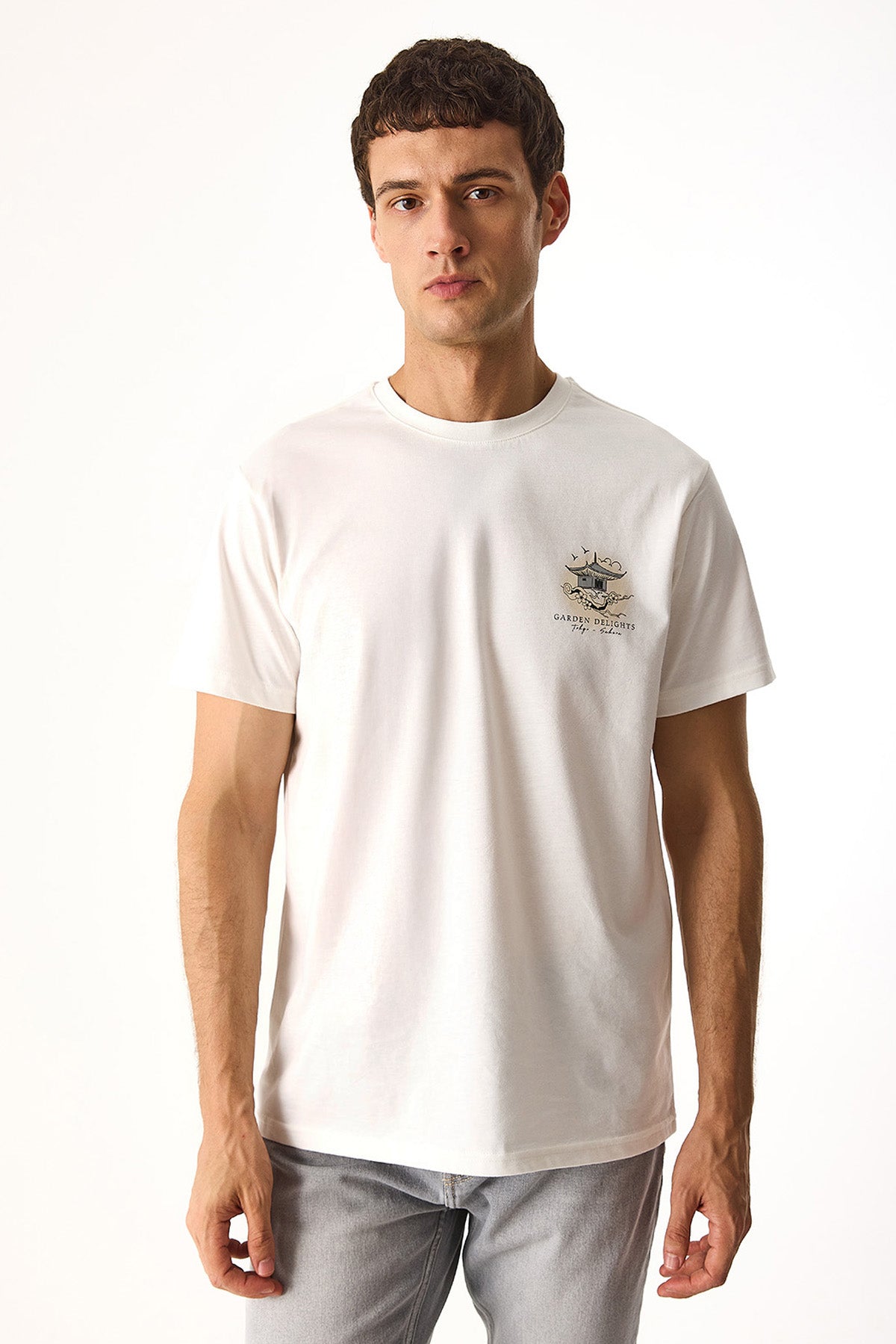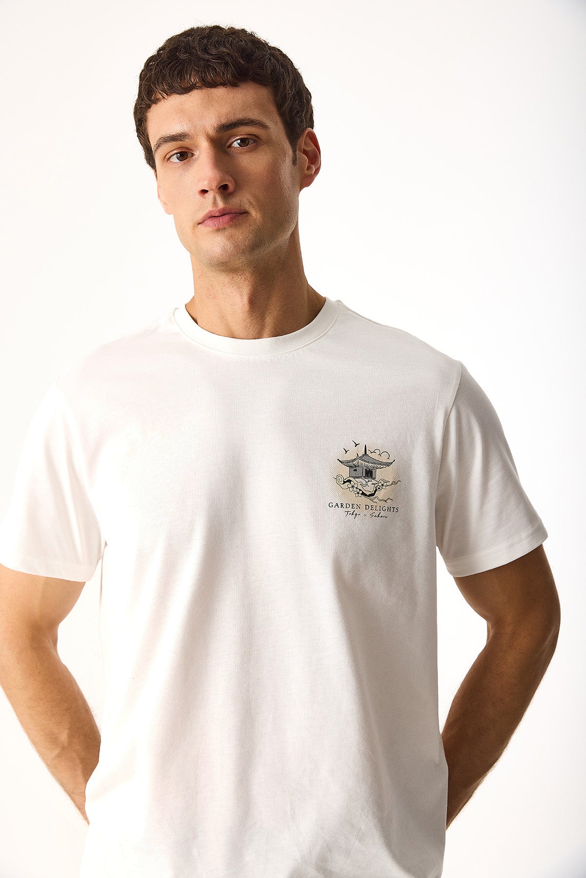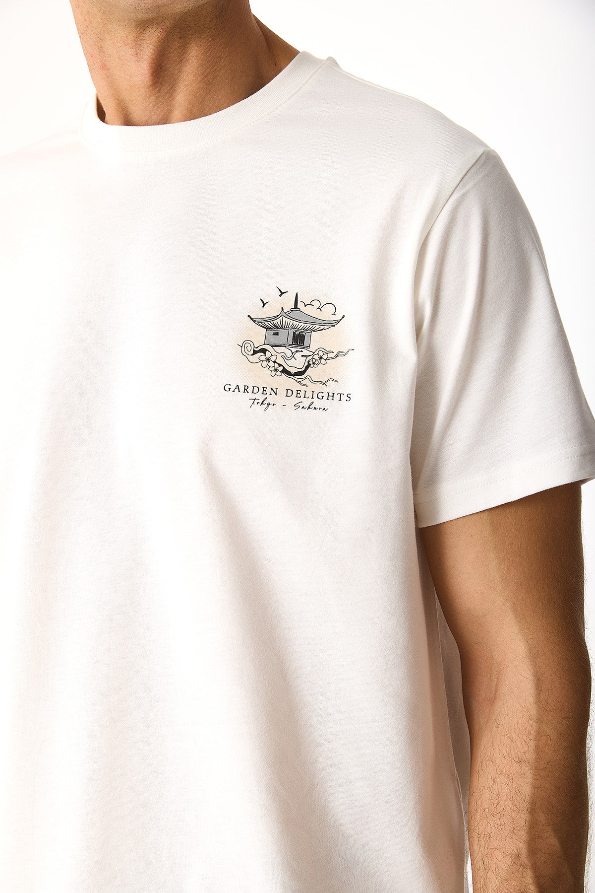 Erkek Sakura Baskılı Bisiklet Yaka Regular Fit Tişört %100 Pamuk - Fildişi