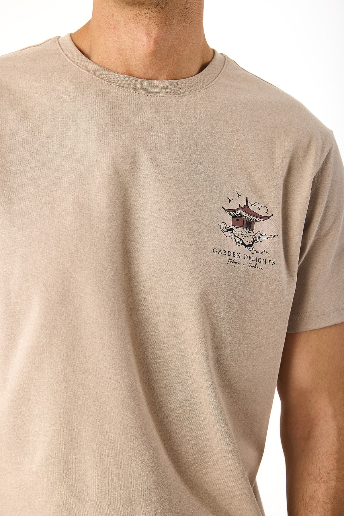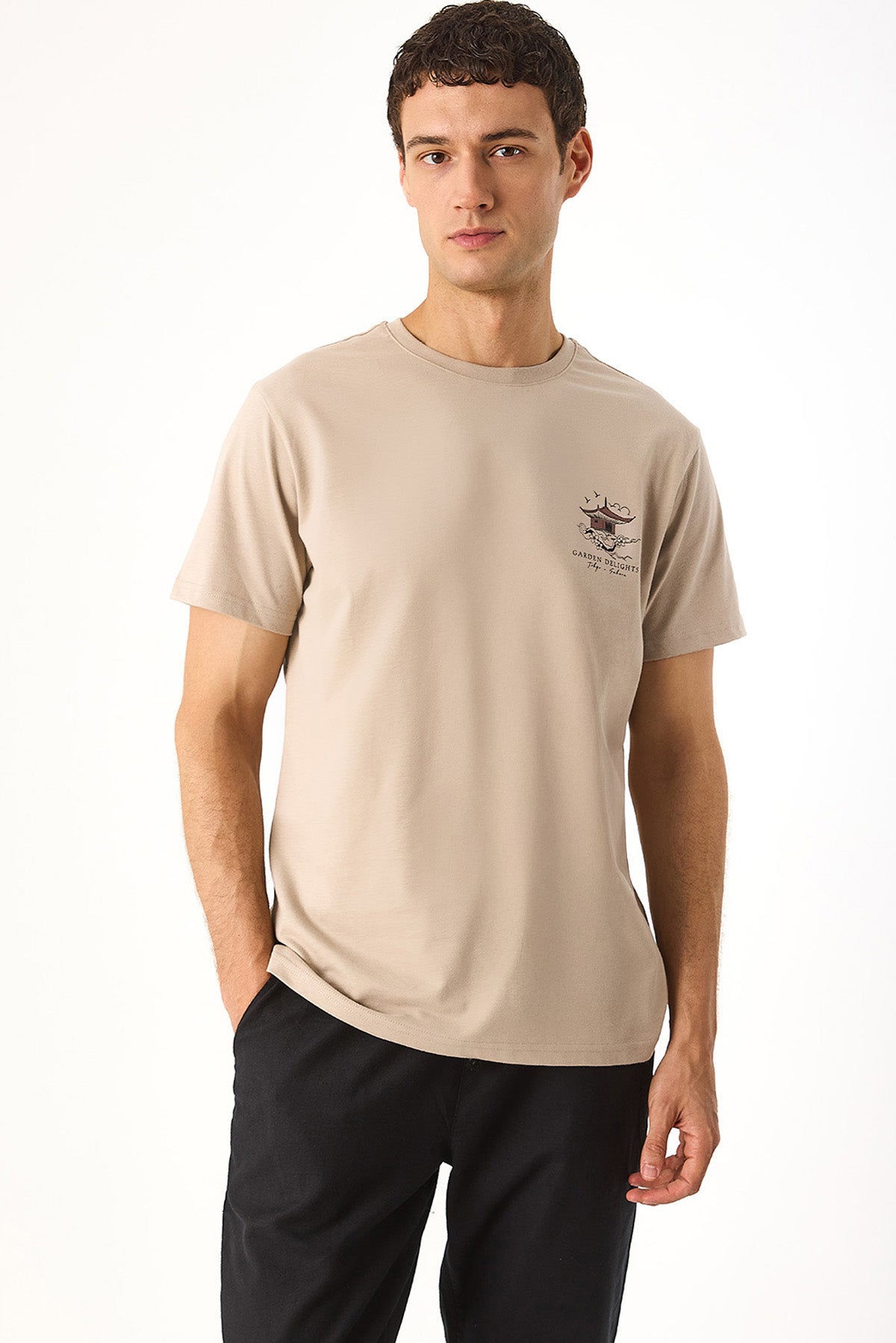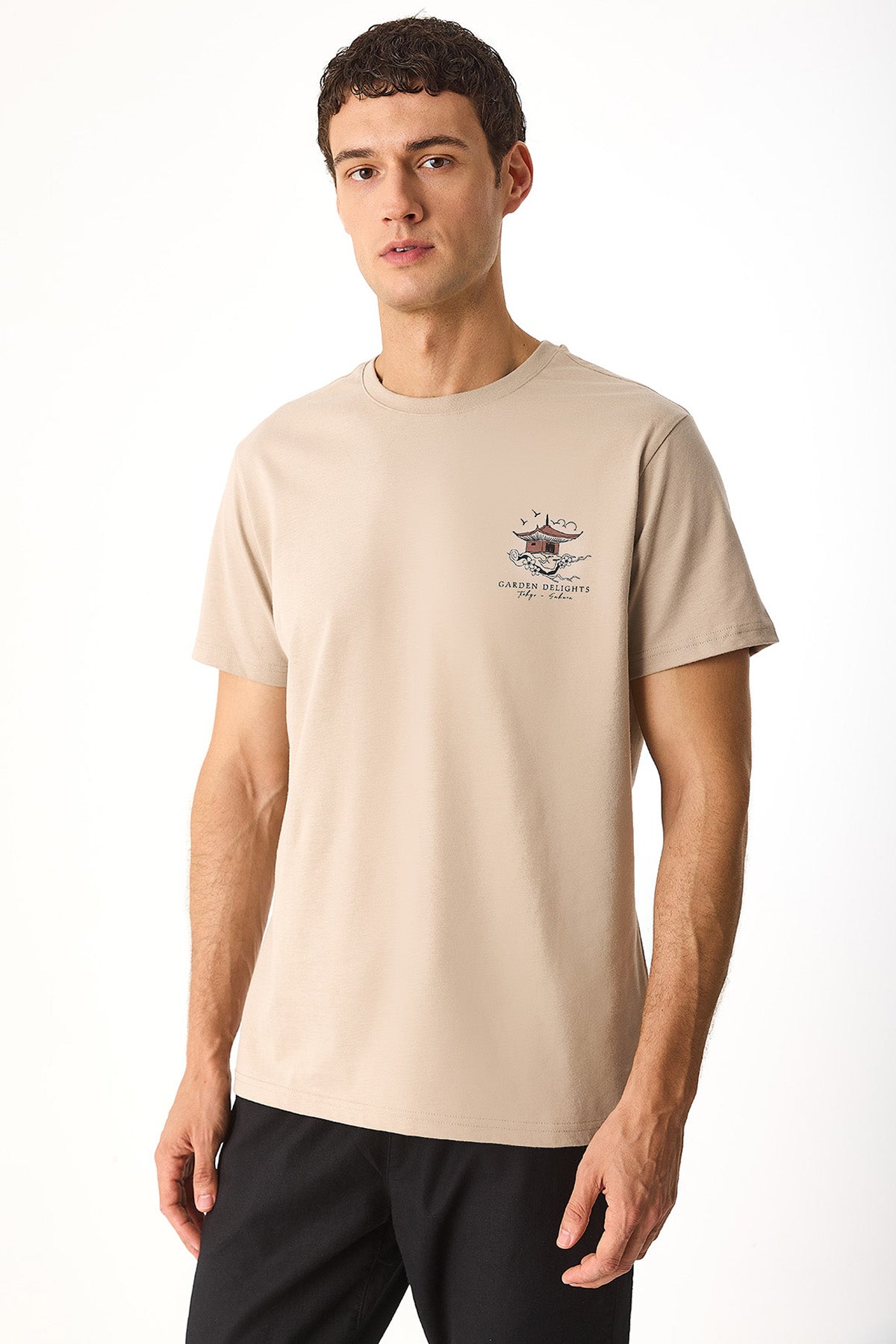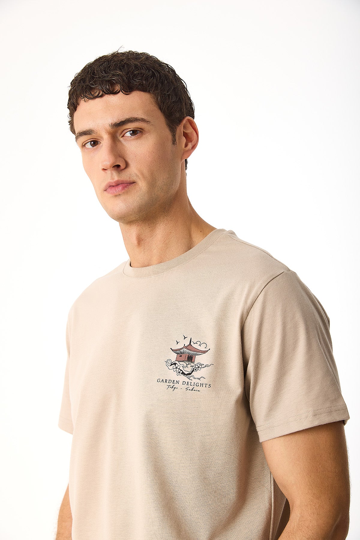 Erkek Sakura Baskılı Bisiklet Yaka Regular Fit Tişört %100 Pamuk - Vizon