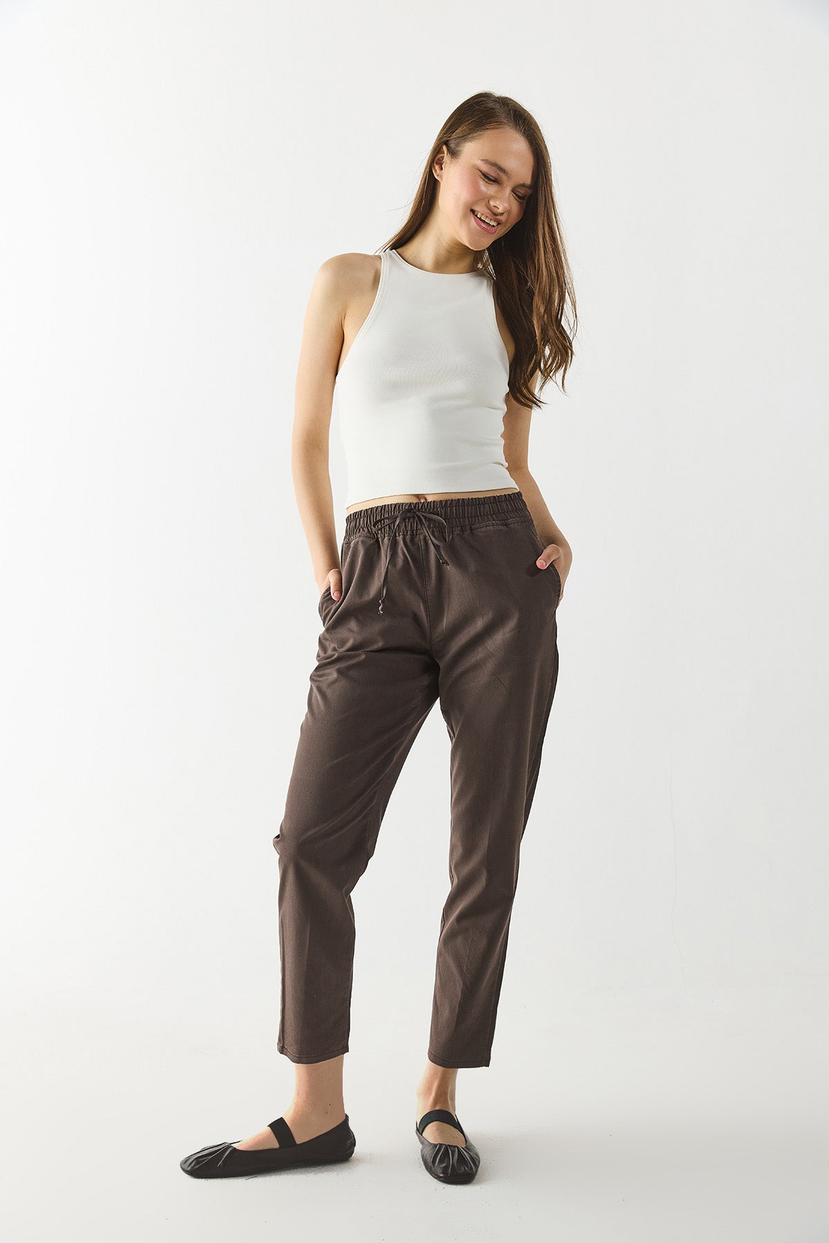 V yakalı, fermuarlı, beli lastik büzgülü, paçası lastikli tulum.