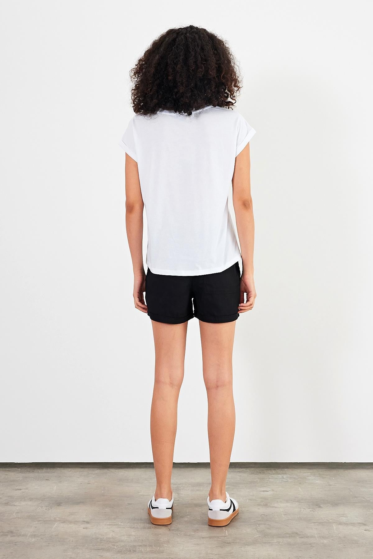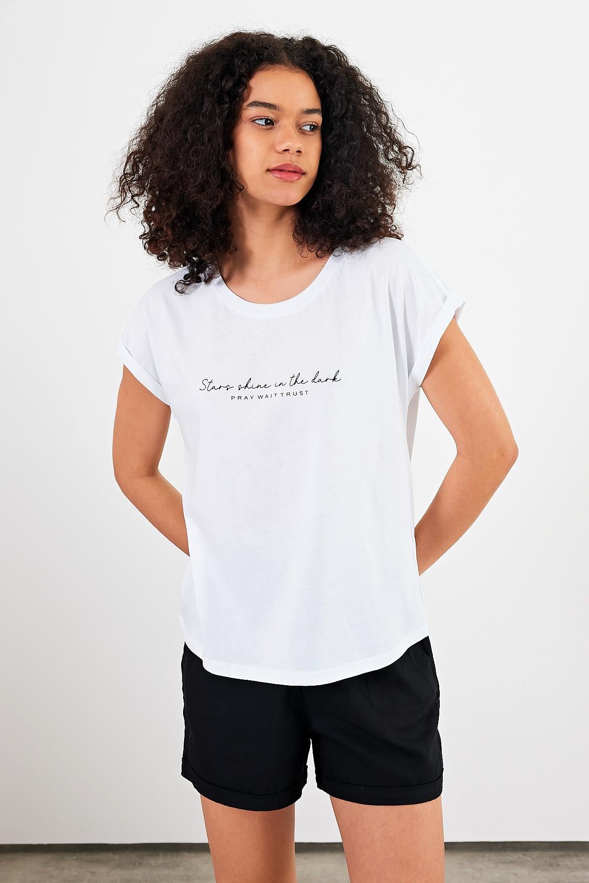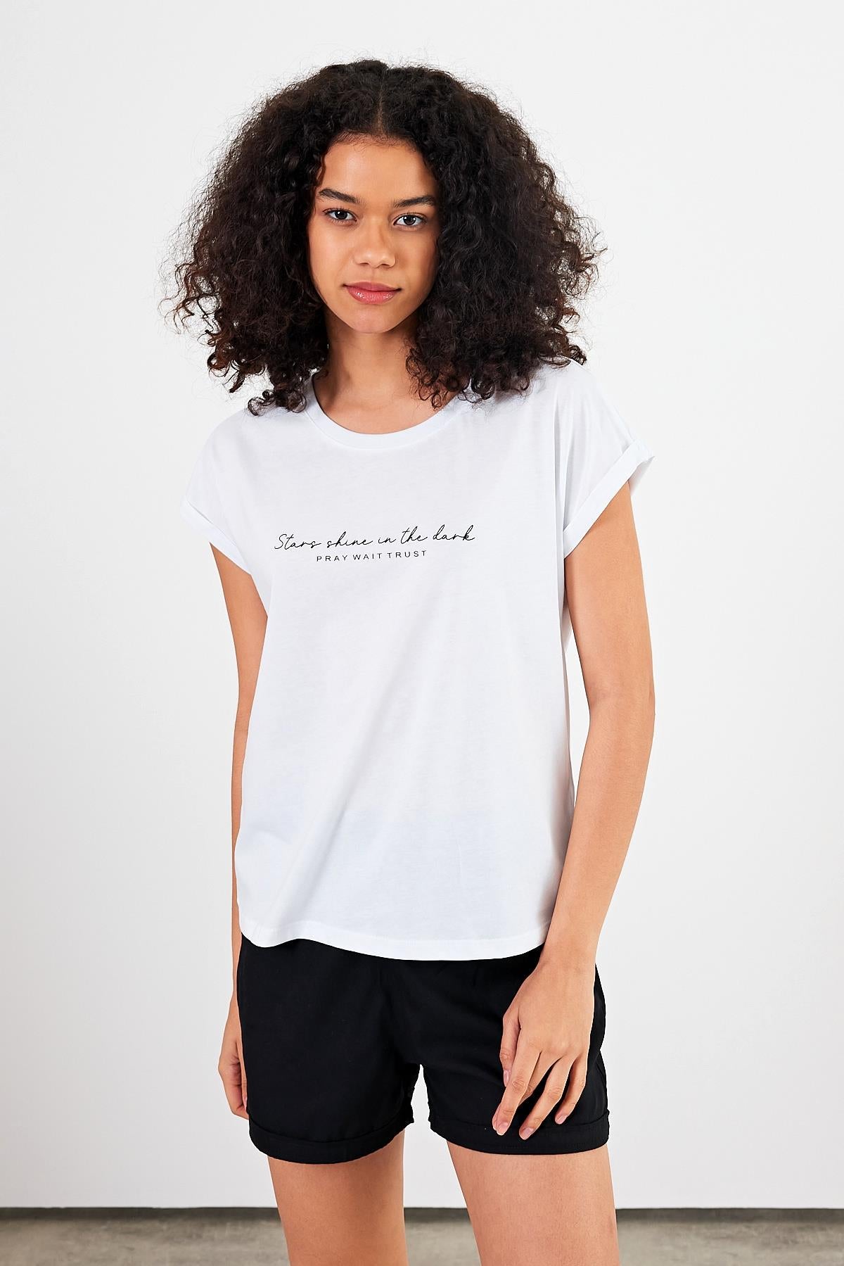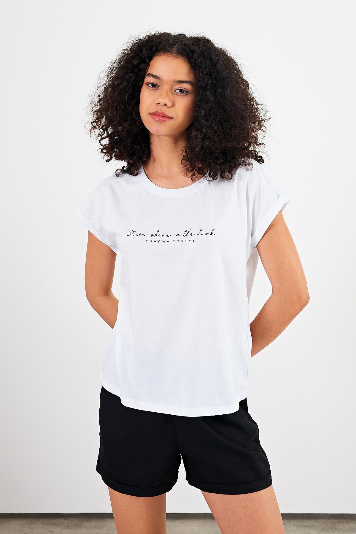 Kadın Shine Bisiklet Yaka Baskılı Regular Fit Tişört %100 Pamuk - Beyaz