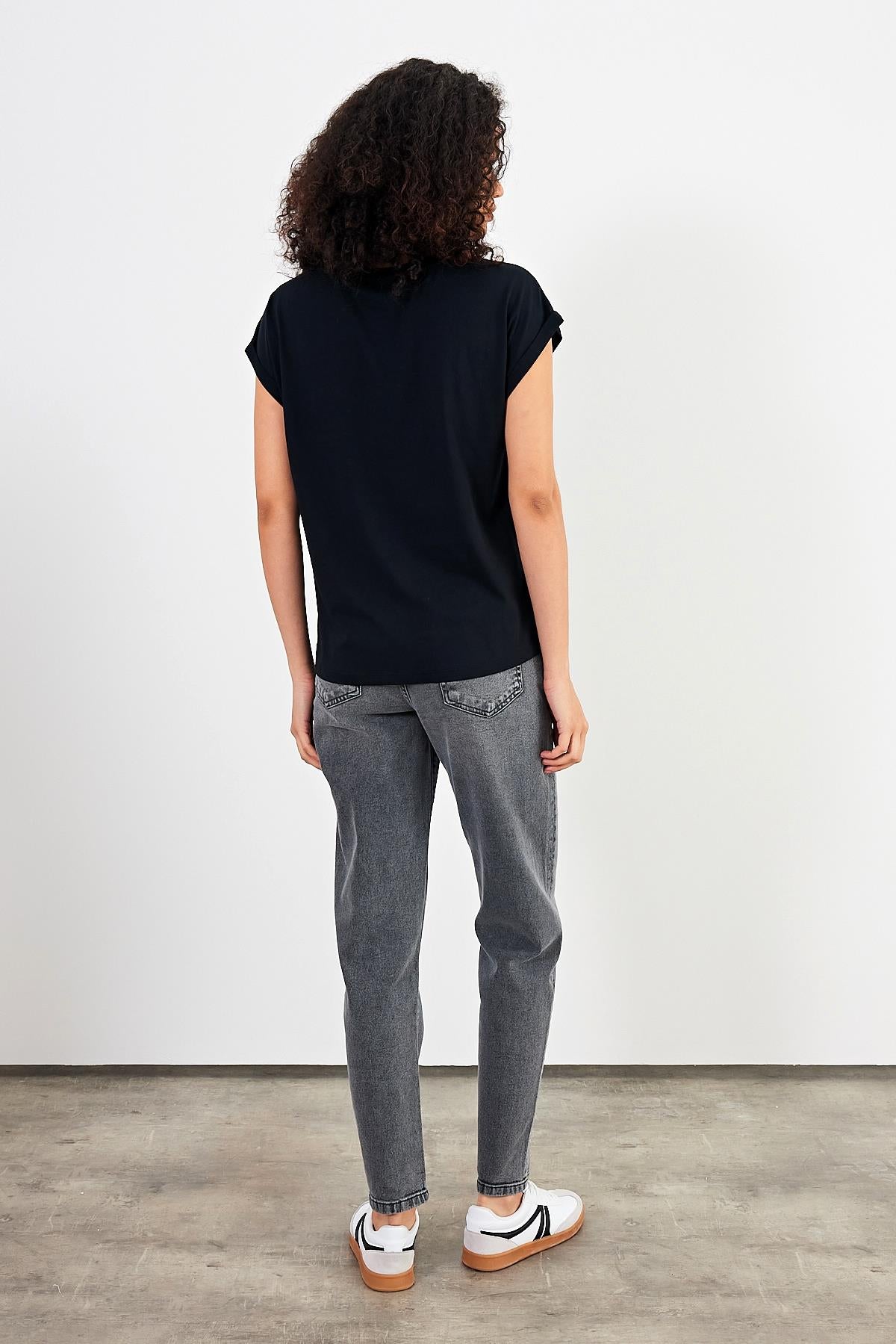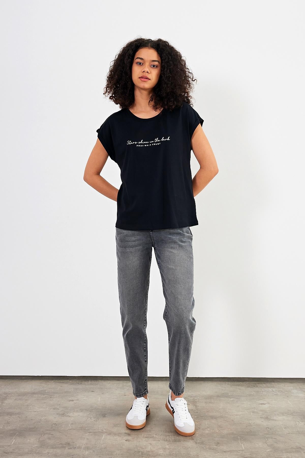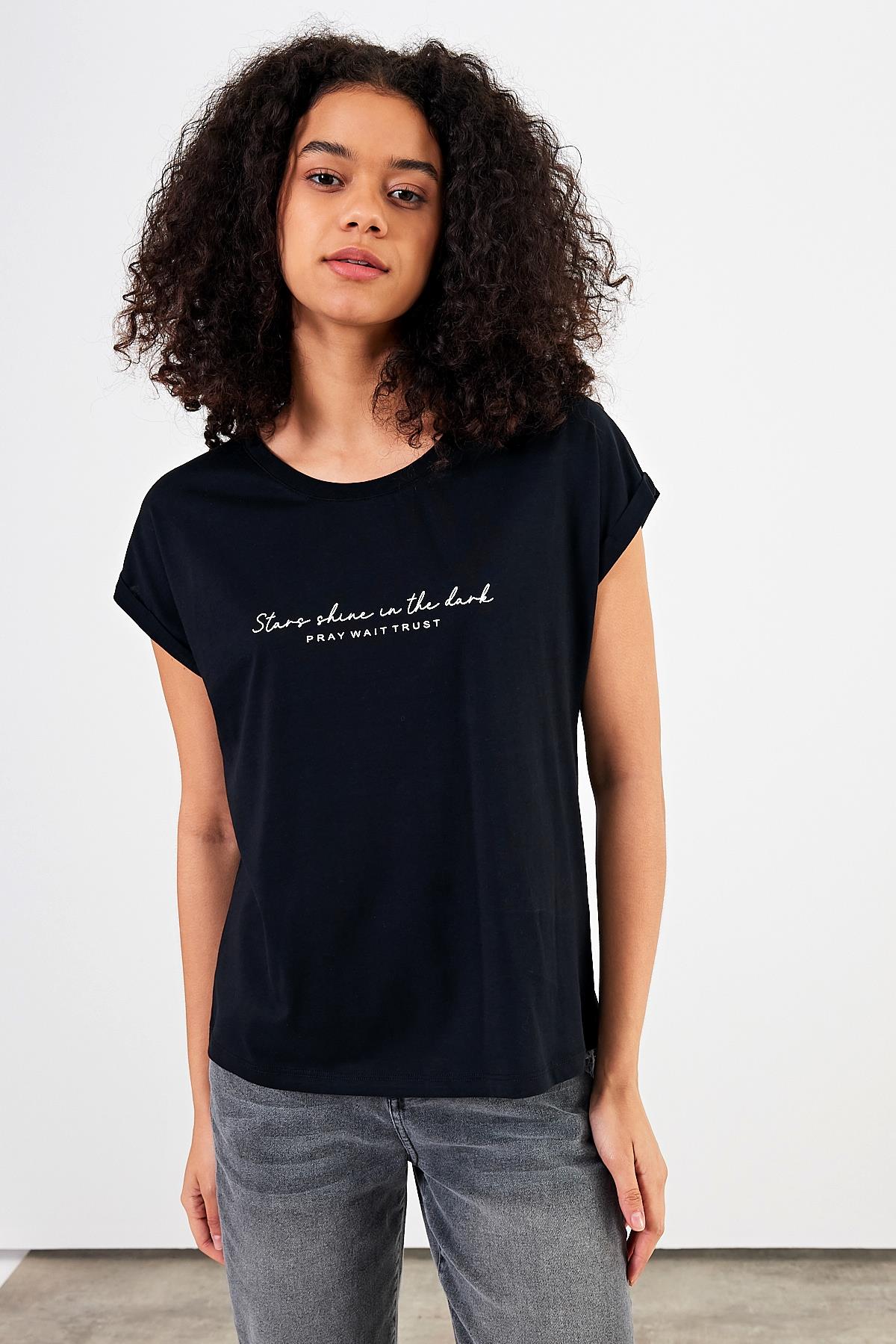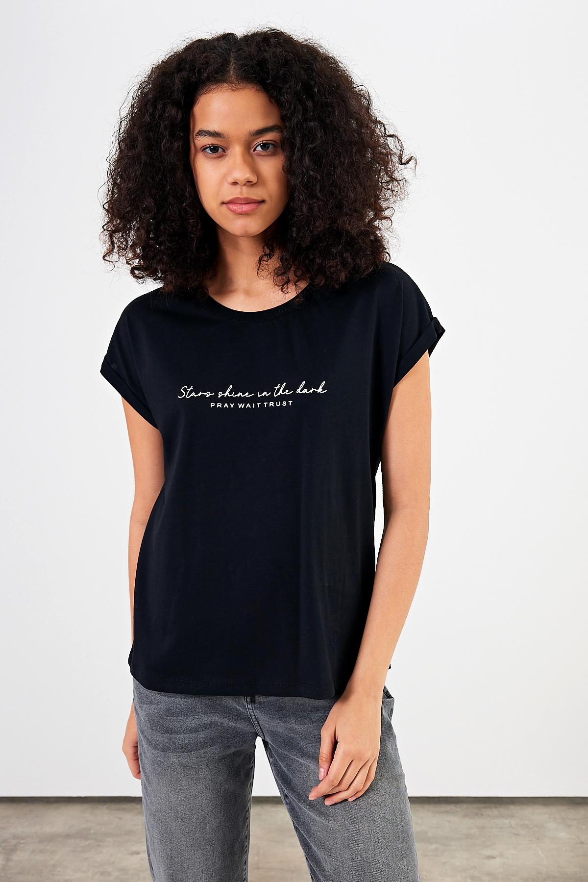 Kadın Shine Bisiklet Yaka Baskılı Regular Fit Tişört %100 Pamuk - Siyah