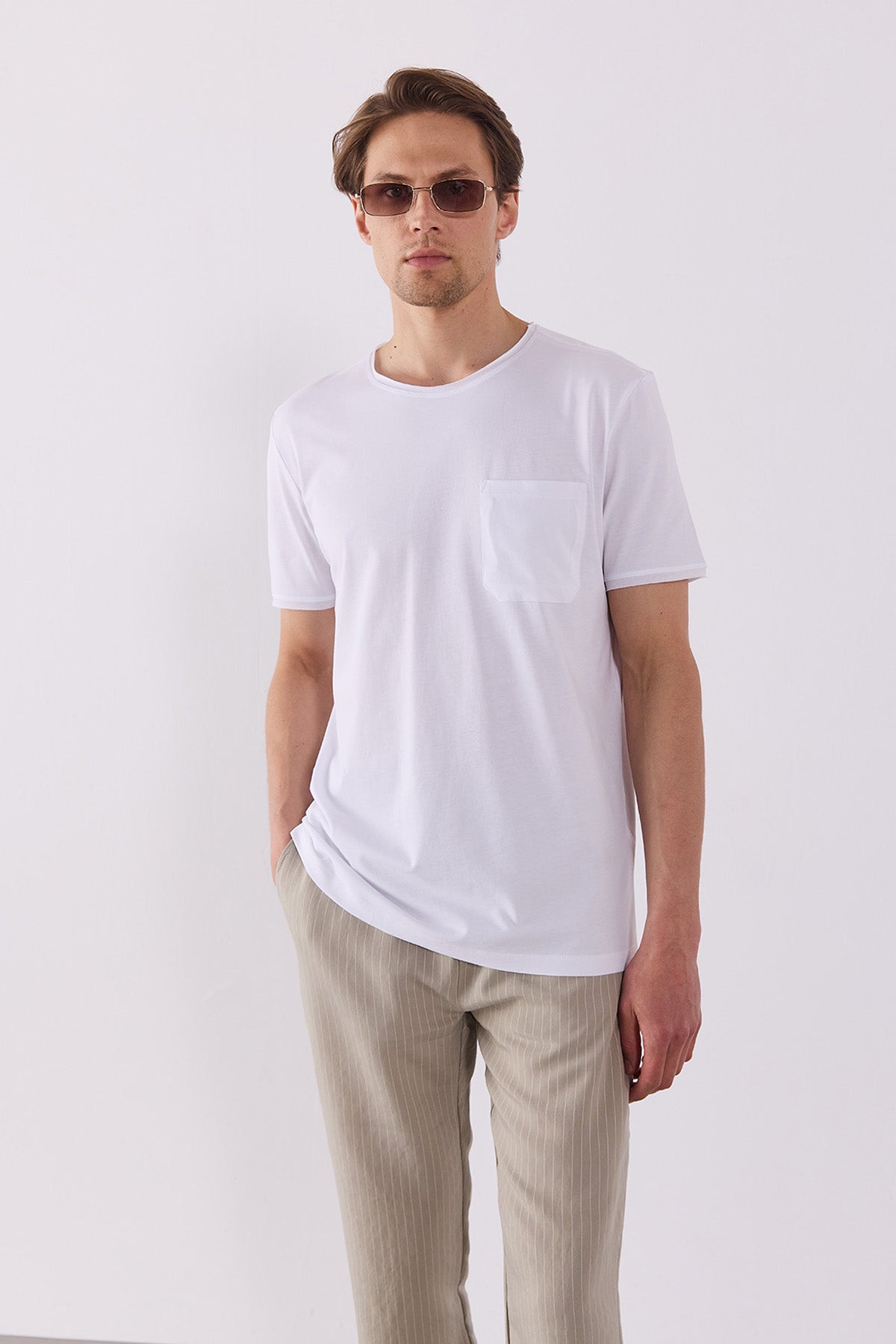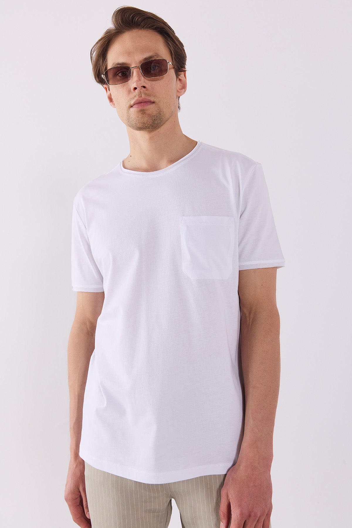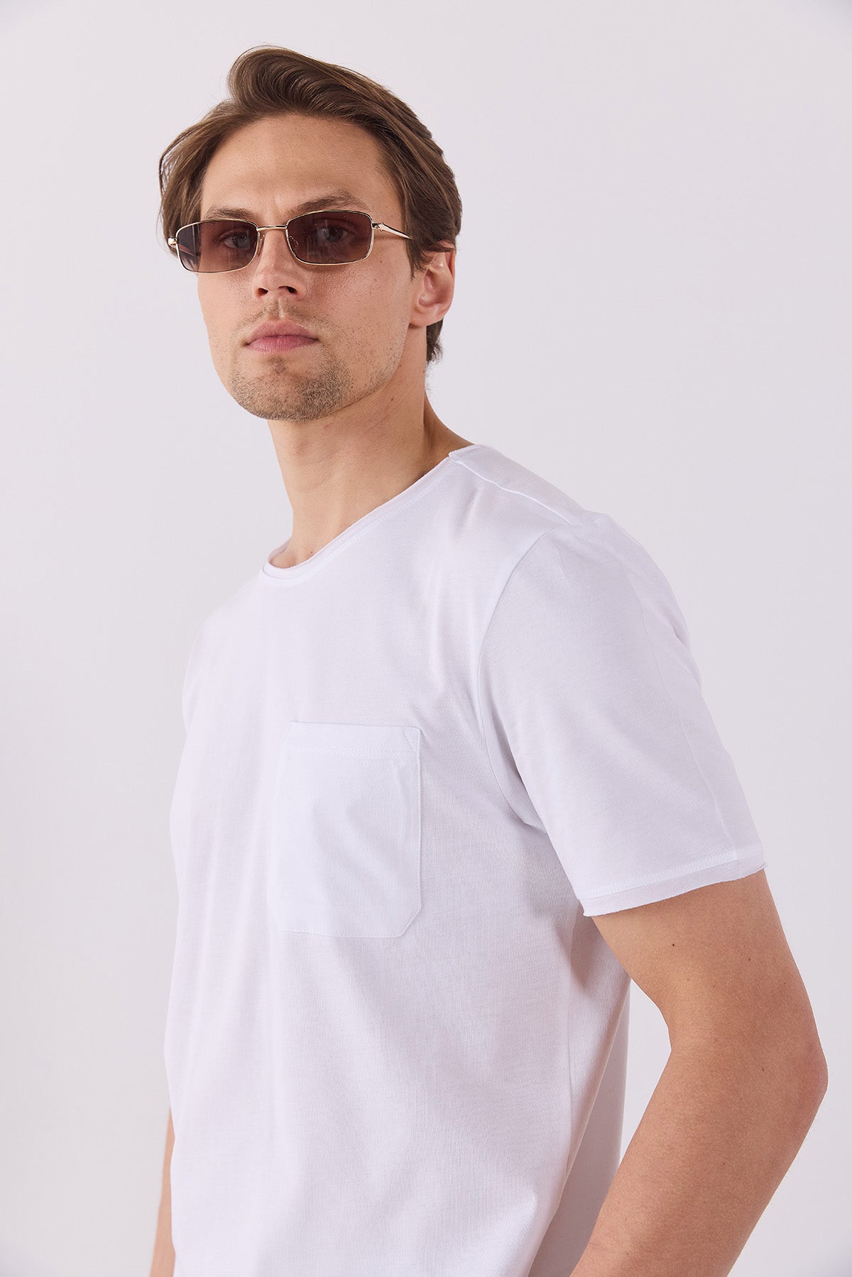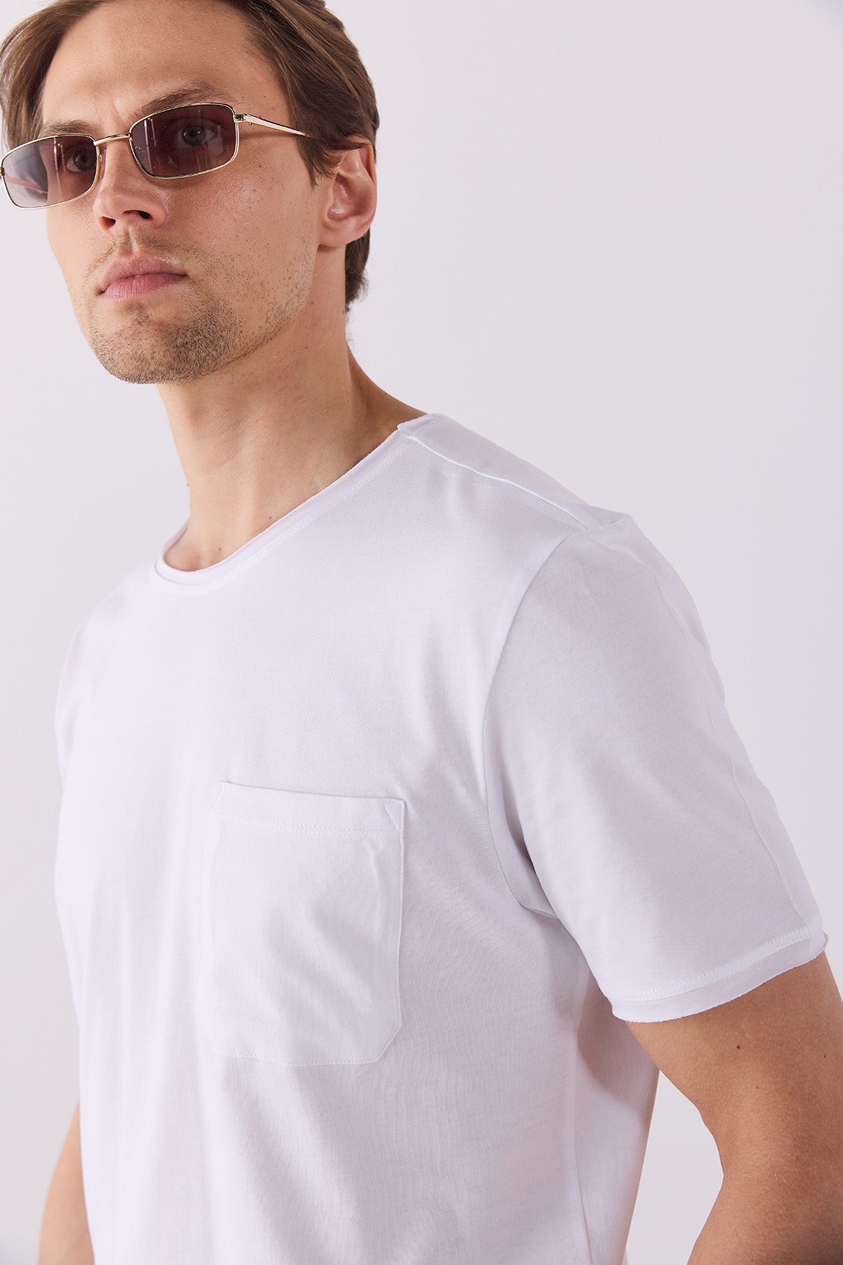 Erkek Simon Bisiklet Yaka Cep Detaylı Basic Tişört %100 Pamuk - Beyaz